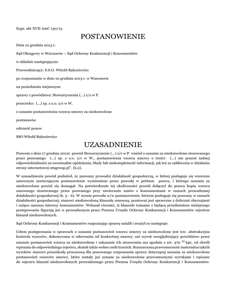 Sygn. akt XVII AmC 130/13 POSTANOWIENIE Dnia 10 grudnia 2013 r. Sąd Okręgowy w Warszawie – Sąd Ochrony Konkurencji i Konsumentów w składzie następującym: Przewodniczący: S.S.O. Witold Rękosiewicz po rozpoznaniu w dniu 10 grudnia 2013 r. w Warszawie na posiedzeniu niejawnym sprawy z powództwa: Stowarzyszenia (...) z/s w P. przeciwko: (...) sp. z o.o. z/s w W. o uznanie postanowienia wzorca umowy za niedozwolone postanawia: odrzucić pozew SSO Witold Rękosiewicz UZASADNIENIE Pozwem z dnia 17 grudnia 2012r. powód Stowarzyszenie (...) z/s w P. wniósł o uznanie za niedozwolone stosowanego przez pozwanego (...) sp. z o.o. z/s w W., postanowienia wzorca umowy o treści: (...) nie ponosi żadnej odpowiedzialności za ewentualne opóźnienia, błędy lub niekompletność informacji, jak też za zakłócenia w działaniu strony internetowej otngroup.pl”. (k.2). W uzasadnieniu powód podniósł, że pozwany prowadzi działalność gospodarczą, w której posługuje się wzorcem umownym zawierającym postanowienie wymienione przez powoda w petitum pozwu, i którego uznania za niedozwolone powód się domagał. Na potwierdzenie tej okoliczności powód dołączył do pozwu kopię wzorca umownego stosowanego przez pozwanego przy zawieraniu umów z konsumentami w ramach prowadzonej działalności gospodarczej (k. 5 - 6). W ocenie powoda w/w postanowienie, którym posługuje się pozwany w ramach działalności gospodarczej, stanowi niedozwoloną klauzulę umowną, ponieważ jest sprzeczne z dobrymi obyczajami i rażąco narusza interesy konsumentów. Wskazał również, iż klauzule tożsame z będącą przedmiotem niniejszego postępowania figurują już w prowadzonym przez Prezesa Urzędu Ochrony Konkurencji i Konsumentów rejestrze klauzul niedozwolonych. Sąd Ochrony Konkurencji i Konsumentów rozpoznając sprawę ustalił i zważył co następuje: Celem postępowania w sprawach o uznanie postanowień wzorca umowy za niedozwolone jest tzw. abstrakcyjna kontrola wzorców, dokonywana w oderwaniu od konkretnej umowy, zaś wyrok uwzględniający powództwo przez uznanie postanowień wzorca za niedozwolone i zakazanie ich stosowania ma zgodnie z art. 479 43 kpc, od chwili wpisania do odpowiedniego rejestru, skutek także wobec osób trzecich. Rozszerzona prawomocność materialna takich wyroków stanowi przeszkodę procesową dla ponownego rozpoznania sprawy dotyczącej uznania za niedozwolone postanowień wzorców umowy, które zostały już uznane za niedozwolone prawomocnymi wyrokami i wpisane do rejestru klauzul niedozwolonych prowadzonego przez Prezesa Urzędu Ochrony Konkurencji i Konsumentów. Wpisanie do rejestru wzorca umowy uznanego prawomocnym wyrokiem Sądu za niedozwolony wyłącza ponowne wytoczenie powództwa w tym przedmiocie, także przez osobę nie biorącą udziału w sprawie, w której wydano wyrok, zaś pozew obejmujący takie powództwo podlega odrzuceniu na podstawie art. 199 § 1 pkt. 2 kpc.( Por. wyrok Sądu Apelacyjnego w Warszawie z dnia 23 maja 2007 r., VI ACa 107/07, niepublik.). Natomiast zgodnie z uchwałą Sądu Najwyższego z dnia 19 grudnia 2003 r., III CZP 95/03 (OSNC 2005/2/25) powaga rzeczy osądzonej wyroku uznającego postanowienie wzorca umowy za niedozwolone wyłącza – od chwili wpisania tego postanowienia do rejestru (art. 47943 w związku z art. 365 i 47945 § 2 kpc) – ponowne wytoczenie powództwa w tym przedmiocie, także przez osobę nie biorącą udziału w sprawie, w której wydano wyrok. Za takim rozwiązaniem, obok argumentów jurydycznych, przemawiają także względy celowościowe i funkcjonalne. Jego przyjęcie pozwala uniknąć prowadzenia kilku postępowań, z których każde musiałoby kończyć się identycznym rozstrzygnięciem merytorycznym, a ponadto sprzyja charakterowi postępowania w sprawie o uznanie postanowień wzorca umowy za niedozwolone, którego celem podstawowym jest usunięcie postanowień wzorców uznanych za abuzywne z obrotu ze skutkiem nie tylko dla stron procesu, lecz także wobec osób trzecich (erga omnes). Można więc stwierdzić, że szczególny przedmiot postępowania o uznanie postanowień wzorca umowy za niedozwolone, jak i również leżący w sferze publicznej cel kontroli abstrakcyjnej, dodatkowo wspiera przyjęcie koncepcji łączącej rozszerzoną prawomocność materialną nie tylko z mocą wiążącą prawomocnego wyroku, ale także z jego powagą rzeczy osądzonej jako negatywną przesłanką procesową. Sąd Apelacyjny w swoich orzeczeniach podzielił argumentację wyrażoną przez Sąd Najwyższy w uchwale z 19 grudnia 2003r. (orzeczenia niepublikowane Sądu Apelacyjnego w Warszawie sygn. akt VI ACa 934/12, VI ACa 1189/12 i VI ACz 127/13). Sąd Ochrony Konkurencji i Konsumentów z urzędu stwierdził, iż w rejestrze klauzul niedozwolonych prowadzonym przez Prezesa Urzędu Ochrony Konkurencji i Konsumentów zostało m in wpisane postanowienia: - poz. 2106 „ Serwis (...).pl nie udziela gwarancji na to, że korzystanie z serwisu będzie przebiegało bez usterek, wad, przerw czy z zachowaniem ciągłości połączenia z systemem rezerwacyjnym oraz co do tego, że rezultat wyszukiwania sprosta oczekiwaniom Użytkownika co do merytorycznej zawartości, dokładności czy przydatności uzyskanych informacji" - wpis dokonany 6 grudnia 2010 r. na podstawie orzeczenia w sprawie XVII AmC 991/10. Powyższa klauzule zawierają treści jednakowe z klauzulą zakwestionowaną przez powoda w niniejszej sprawie, zostały uznane za niedozwolone prawomocnym wyrokiem i na tej podstawie ujawnione w rejestrze klauzul niedozwolonych prowadzonym przez Prezesa Urzędu Ochrony Konkurencji i Konsumentów. Sąd Najwyższy w uchwale z dnia 13 lipca 2006 r., III SZP 3/06 (OSNP 2007/1-2/35), stwierdził, iż stosowanie postanowień wzorców umowy o treści tożsamej z treścią postanowień uznanych za niedozwolone wyrokiem Sądu Okręgowego w Warszawie – Sądu Ochrony Konkurencji i Konsumentów i wpisanych do reje