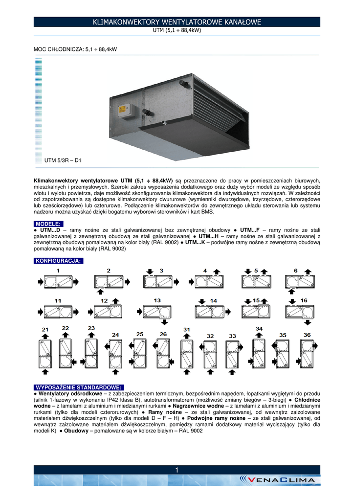 KLIMAKONWEKTORY WENTYLATOROWE KANAŁOWE UTM (5,1 ÷ 88,4kW) MOC CHŁODNICZA: 5,1 ÷ 88,4kW UTM 5/3R – D1 Klimakonwektory wentylatorowe UTM (5,1 ÷ 88,4kW) są przeznaczone do pracy w pomieszczeniach biurowych, mieszkalnych i przemysłowych. Szeroki zakres wyposażenia dodatkowego oraz duży wybór modeli ze względu sposób wlotu i wylotu powietrza, daje możliwość skonfigurowania klimakonwektora dla indywidualnych rozwiązań. W zależności od zapotrzebowania są dostępne klimakonwektory dwururowe (wymienniki dwurzędowe, trzyrzędowe, czterorzędowe lub sześciorzędowe) lub czterurowe. Podłączenie klimakonwektorów do zewnętrznego układu sterowania lub systemu nadzoru można uzyskać dzięki bogatemu wyborowi sterowników i kart BMS. MODELE: ● UTM...D – ramy nośne ze stali galwanizowanej bez zewnętrznej obudowy ● UTM...F – ramy nośne ze stali galwanizowanej z zewnętrzną obudową ze stali galwanizowanej ● UTM...H – ramy nośne ze stali galwanizowanej z zewnętrzną obudową pomalowaną na kolor biały (RAL 9002) ● UTM...K – podwójne ramy nośne z zewnętrzną obudową pomalowaną na kolor biały (RAL 9002) KONFIGURACJA: WYPOSAŻENIE STANDARDOWE: ● Wentylatory odśrodkowe – z zabezpieczeniem termicznym, bezpośrednim napędem, łopatkami wygiętymi do przodu (silnik 1-fazowy w wykonaniu IP42 klasa B), autotransformatorem (możliwość zmiany biegów – 3-biegi) ● Chłodnice wodne – z lamelami z aluminium i miedzianymi rurkami ● Nagrzewnice wodne – z lamelami z aluminium i miedzianymi rurkami (tylko dla modeli czterorurowych) ● Ramy nośne – ze stali galwanizowanej, od wewnątrz zaizolowane materiałem dźwiękoszczelnym (tylko dla modeli D – F – H) ● Podwójne ramy nośne – ze stali galwanizowanej, od wewnątrz zaizolowane materiałem dźwiękoszczelnym, pomiędzy ramami dodatkowy materiał wyciszający (tylko dla modeli K) ● Obudowy – pomalowane są w kolorze białym – RAL 9002 1 KLIMAKONWEKTORY WENTYLATOROWE KANAŁOWE UTM (5,1 ÷ 88,4kW) OPCJE WYPOSAŻANIA DODATKOWEGO: ● BAC – taca ociekowa (dodatkowa) ● BMS-BN – karta BMS z protokołem komunikacyjnym BACNET ● BMS-MB – karta BMS z protokołem komunikacyjnym MODBUS ● BMS-MX – karta BMS z protokołem komunikacyjnym MAXINET ● CD – regulator naścienny do współpracy z z kartą BMS (opcje CD1 – CD2) ● CR – regulator naścienny (opcje CR1, CR2, CR11) ● MOT – siłownik przepustnicy powietrza świeżego ● MRS – terminal podłączeń elektrycznych (opcje MRS1 – MRS2 – MRS3 – MRS4 – MRS5 – MRS6) ● P90 – kanał wentylacyjny 90˚ ● PCA – skrzynka z siatką i filtrem EU3 ● PCE – skrzynka z siatką ● PCR – skrzynka rozprężna z okrągłymi króćcami do podłączenia kanałów wentylacyjnych ● PD – kanał wentylacyjny ● PFA – sekcja filtra EU3 ● PFO – sekcja filtra EU5 ● PFT – sekcja filtra EU7 ● PG – skrzynka rozprężna z kratką (opcje PG1 – PG2) ● PGA – połączenia elastyczne ● PGF – kratka z filtrem ● PGR – kratka bez filtra ● PGM – kratka bez filtra z ruchomymi żaluzjami ● PMA – przepustnica powietrza świeżego (otwarcie 33÷100%) ● PMP – pompka skroplin ● PRA – sekcja nagrzewnicy wodnej (opcje PRA2R – PRA3R) ● PRE – sekcja nagrzewnicy elektrycznej (opcje PRE-230V – PRE-400V) ● PS – sekcja mieszania ● PSA – przepustnica powietrza świeżego (otwarcie 0÷100%) ● PSL – sekcja tłumika akustycznego ● PU – sekcja z tacą ociekową (do zamontowania lanc nawilżacza parowego) ● PV – sekcja dodatkowego wentylatora (opcje PV-D1 – PV-D2 – PV-F1 – PV-F2 – PV-H1 – PV-H2 – PV-K1 – PV-K2) ● RV – dodatkowa izolacja termiczno-akustyczna (opcje RVC – RVD) ● SDI – rozdzielacz sygnału sterującego ● SND-A – czujnik temperatury powietrza dla kart BMS ● SND-W – czujnik temperatury wody dla kart BMS (opcje SND-W1, SND-W2) ● STA – mocowania montażowe● SW-MX – centralny system nadzoru dla kart BMS z protokołem komunikacyjnym MAXINET (bez limitu ilości klimakonwektorów) ● TP – daszki zabezpieczające (opcje TP – TPP) ● UC-MX – centralny system nadzoru dla kart BMS z protokołem komunikacyjnym MAXINET (dla maksymalnie 60 klimakonwektorów) ● VL321 – jeden zawór trójdrogowy 3/4'' z siłownikiem ● VL322 – jeden zawór trójdrogowy 1'' z siłownikiem ● VL331 – jeden zawór dwudrogowy 3/4'' z siłownikiem ● VL332 – jeden zawór dwudrogowy 1'' z siłownikiem ● VL301 – jeden zawór odcinający ● VL311 – jeden zawór balansowy ● ZO – szyny montażowe (opcje ZOC – ZOP) 2