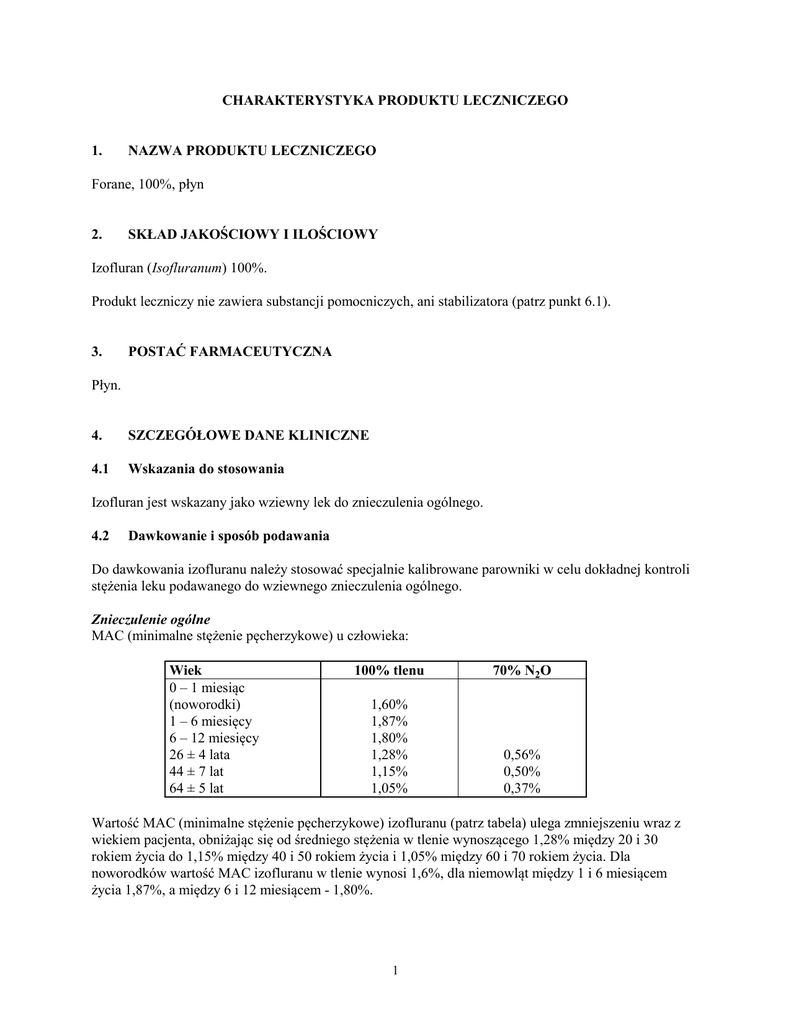 CHARAKTERYSTYKA PRODUKTU LECZNICZEGO 1. NAZWA PRODUKTU LECZNICZEGO Forane, 100%, płyn 2. SKŁAD JAKOŚCIOWY I ILOŚCIOWY Izofluran (Isofluranum) 100%. Produkt leczniczy nie zawiera substancji pomocniczych, ani stabilizatora (patrz punkt 6.1). 3. POSTAĆ FARMACEUTYCZNA Płyn. 4. SZCZEGÓŁOWE DANE KLINICZNE 4.1 Wskazania do stosowania Izofluran jest wskazany jako wziewny lek do znieczulenia ogólnego. 4.2 Dawkowanie i sposób podawania Do dawkowania izofluranu należy stosować specjalnie kalibrowane parowniki w celu dokładnej kontroli stężenia leku podawanego do wziewnego znieczulenia ogólnego. Znieczulenie ogólne MAC (minimalne stężenie pęcherzykowe) u człowieka: Wiek 0 – 1 miesiąc (noworodki) 1 – 6 miesięcy 6 – 12 miesięcy 26 ± 4 lata 44 ± 7 lat 64 ± 5 lat 100% tlenu 70% N2O 1,60% 1,87% 1,80% 1,28% 1,15% 1,05% 0,56% 0,50% 0,37% Wartość MAC (minimalne stężenie pęcherzykowe) izofluranu (patrz tabela) ulega zmniejszeniu wraz z wiekiem pacjenta, obniżając się od średniego stężenia w tlenie wynoszącego 1,28% między 20 i 30 rokiem życia do 1,15% między 40 i 50 rokiem życia i 1,05% między 60 i 70 rokiem życia. Dla noworodków wartość MAC izofluranu w tlenie wynosi 1,6%, dla niemowląt między 1 i 6 miesiącem życia 1,87%, a między 6 i 12 miesiącem - 1,80%. 1 Premedykacja Produkty lecznicze stosowane w premedykacji należy dobierać indywidualnie dla poszczególnych pacjentów, pamiętając o depresyjnym działaniu izofluranu na układ oddechowy. Podawanie leków przeciwcholinergicznych jest kwestią wyboru. Indukcja Na ogół podaje się krótko działającą pochodną kwasu barbiturowego lub inny lek indukujący podawany dożylnie, a następnie do oddychania mieszaninę izofluranu z tlenem lub mieszaniną tlen/podtlenek azotu. Zaleca się rozpoczęcie indukcji izofluranem od podawania stężenia 0,5%. Na ogół stężenia od 1,5% do 3% wywołują w czasie 7-10 minut znieczulenie umożliwiające przeprowadzenie zabiegu chirurgicznego. Podtrzymywanie znieczulenia Stopień znieczulenia pozwalający na przeprowadzenie zabiegu chirurgicznego można utrzymać stosując stężenia 1,0% do 2,5% izofluranu w mieszaninie tlen/podtlenek azotu. Przy podawaniu z czystym tlenem może być konieczne zwiększenie stężenia izofluranu o 0,5% do 1,0%. Jeśli konieczne jest dodatkowe zwiotczenie mięśni można zastosować dodatkowo lek zwiotczający mięśnie. W czasie podtrzymywania znieczulenia ciśnienie tętnicze wykazuje tendencję do zmian odwrotnie proporcjonalnych do stężenia pęcherzykowego izofluranu (MAC) przy braku innych czynników wywołujących powikłania. Nadmierne obniżenie ciśnienia tętniczego może być spowodowane zbyt głębokim znieczuleniem i w takim przypadku należy zmniejszyć stężenie wdychanego izofluranu. Dzieci poniżej 2. roku życia Izofluran można stosować z akceptowalnym marginesem skuteczności i bezpieczeństwa u noworodków i niemowląt oraz dzieci poniżej 2. roku życia (patrz wartości MAC podane w tabeli powyżej). Izofluran może być podawany ze wszystkimi lekami powszechnie stosowanymi w anestezjologii (patrz również punkty 4.4 i 4.8). Pacjenci w podeszłym wieku U pacjentów w podeszłym wieku zaleca się mniejsze stężenia izofluranu do podtrzymania znieczulenia umożliwiającego przeprowadzenie zabiegu chirurgicznego (patrz wartości MAC podane w tabeli powyżej). 4.3 Przeciwwskazania Stwierdzona nadwrażliwość na izofluran lub inne halogenowe wziewne leki znieczulenia ogólnego. Izofluran jest także przeciwwskazany u pacjentów z rozpoznaniem lub podejrzeniem genetycznie uwarunkowanej hipertermii złośliwej. 4.4 Specjalne ostrzeżenia i środki ostrożności dotyczące stosowania Do podawania izofluranu należy używać specjalnie kalibrowanych parowników, umożliwiających dokładną kontrolę stężenia izofluranu. Wraz z pogłębianiem znieczulenia, nasila się niedociśnienie tętnicze i depresja oddechowa. Informowano o wydłużeniu odstępu QT, związanego z torsade de pointes (w sporadycznych przypadkach powodującego zgon). Należy zachować ostrożność podając izofluran pacjentom z ryzykiem wydłużenia odstępu QT. 2 Należy zachować ostrożność stosując znieczulenie ogólne, w tym izofluranem, u pacjentów z chorobami mitochondrialnymi. W związku ze stosowaniem izofluranu u pacjentek poddawanych zabiegowi wywołanego poronienia notowano zwiększoną utratę krwi, porównywalną do stwierdzanej po znieczuleniu innymi wziewnymi lekami do znieczulenia ogólnego. Izofluran powoduje zwiotczenie mięśnia macicy i dlatego w operacjach położniczych należy stosować najmniejsze możliwe stężenie izofluranu (patrz punkt 4.6). W pojedynczych przypadkach podczas stosowania halogenowych wziewnych leków do znieczulenia ogólnego zawierających grupę -CF2H (tj. desfluran, enfluran i izofluran) obserwowano zwiększenie stężenia karboksyhemoglobiny. Stosowanie prawidłowo nawodnionych pochłaniaczy zapobiega wytworzeniu istotnych z klinicznego punktu widzenia stężeń tlenku węgla. Pochłaniacze CO2 należy stosować zgodnie z zaleceniami producentów. Rzadko informowano o bardzo silnym przegrzaniu zestawu, wydobywającym się dymie i (lub) samozapłonie w zestawie do znieczulenia podczas przepuszczania produktów leczniczych do znieczulenia ogólnego przez przesuszony pochłaniacz CO2, szczególnie zawierający wodorotlenek potasu (np. Baralyme). Jeśli lekarz anestezjolog podejrzewa, że pochłaniacz CO2 jest przesuszony powinien go wymienić przed rozpoczęciem podawania izofluranu. Nie zawsze wysuszenie pochłaniacza powoduje zmianę wskaźnika barwnego. Dlatego też brak wyraźnej zmiany wskaźnika barwnego nie musi oznaczać, że pochłaniacz jest odpowiednio nawodniony. Pochłaniacze CO2 należy wymieniać rutynowo, bez względu na barwę wskaźnika. Ogólne Jak wszystkie inne silnie działające wziewne leki do znieczulenia ogólnego, izofluran może być podawany wyłącznie w