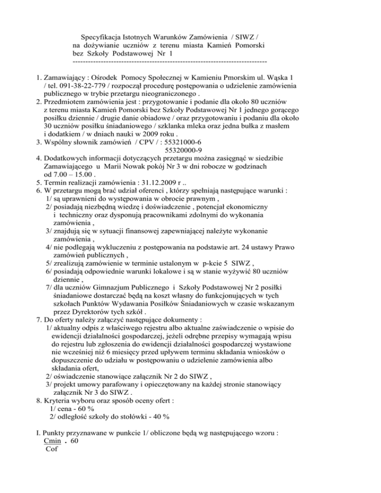 Specyfikacja Istotnych Warunków Zamówienia / SIWZ / na doŜywianie uczniów z terenu miasta Kamień Pomorski bez Szkoły Podstawowej Nr 1 ---------------------------------------------------------------------------1. Zamawiający : Ośrodek Pomocy Społecznej w Kamieniu Pmorskim ul. Wąska 1 / tel. 091-38-22-779 / rozpoczął procedurę postępowania o udzielenie zamówienia publicznego w trybie przetargu nieograniczonego . 2. Przedmiotem zamówienia jest : przygotowanie i podanie dla około 80 uczniów z terenu miasta Kamień Pomorski bez Szkoły Podstawowej Nr 1 jednego gorącego posiłku dziennie / drugie danie obiadowe / oraz przygotowaniu i podaniu dla około 30 uczniów posiłku śniadaniowego / szklanka mleka oraz jedna bułka z masłem i dodatkiem / w dniach nauki w 2009 roku . 3. Wspólny słownik zamówień / CPV / : 55321000-6 55320000-9 4. Dodatkowych informacji dotyczących przetargu moŜna zasięgnąć w siedzibie Zamawiającego u Marii Nowak pokój Nr 3 w dni robocze w godzinach od 7.00 – 15.00 . 5. Termin realizacji zamówienia : 31.12.2009 r .. 6. W przetargu mogą brać udział oferenci , którzy spełniają następujące warunki : 1/ są uprawnieni do występowania w obrocie prawnym , 2/ posiadają niezbędną wiedzę i doświadczenie , potencjał ekonomiczny i techniczny oraz dysponują pracownikami zdolnymi do wykonania zamówienia , 3/ znajdują się w sytuacji finansowej zapewniającej naleŜyte wykonanie zamówienia , 4/ nie podlegają wykluczeniu z postępowania na podstawie art. 24 ustawy Prawo zamówień publicznych , 5/ zrealizują zamówienie w terminie ustalonym w p-kcie 5 SIWZ , 6/ posiadają odpowiednie warunki lokalowe i są w stanie wyŜywić 80 uczniów dziennie , 7/ dla uczniów Gimnazjum Publicznego i Szkoły Podstawowej Nr 2 posiłki śniadaniowe dostarczać będą na koszt własny do funkcjonujących w tych szkołach Punktów Wydawania Posiłków Śniadaniowych w czasie wskazanym przez Dyrektorów tych szkół . 7. Do oferty naleŜy załączyć następujące dokumenty : 1/ aktualny odpis z właściwego rejestru albo aktualne zaświadczenie o wpisie do ewidencji działalności gospodarczej, jeŜeli odrębne przepisy wymagają wpisu do rejestru lub zgłoszenia do ewidencji działalności gospodarczej wystawione nie wcześniej niŜ 6 miesięcy przed upływem terminu składania wniosków o dopuszczenie do udziału w postępowaniu o udzielenie zamówienia albo składania ofert, 2/ oświadczenie stanowiące załącznik Nr 2 do SIWZ , 3/ projekt umowy parafowany i opieczętowany na kaŜdej stronie stanowiący załącznik Nr 3 do SIWZ . 8. Kryteria wyboru oraz sposób oceny ofert : 1/ cena - 60 % 2/ odległość szkoły do stołówki - 40 % I. Punkty przyznawane w punkcie 1/ obliczone będą wg następującego wzoru : Cmin . 60 Cof Cmin - najniŜsza cena spośród wszystkich ofert = 60 punktów Cof - cena podana w ofercie II. Punkty przyznawane w punkcie 2/ obliczane będą w sposób następujący : odległość szkoły do stołówki mierzona w metrach : - do 500 metrów = 40 punktów - powyŜej 500 metrów = 10 punktów 9. Okres związania z ofertą wynosi 30 dni . Bieg terminu rozpoczyna się wraz z upływem termiu składania ofert . 10. Cena oferty powinna być podana w sposób nastęujący : - cena oferowana netto PLN __________________ - podatek VAT / _____% / PLN __________________ - cena oferowana plus VAT / brutto / PLN __________________ osobna dla jednego gorącego posiłku dziennie i osobna dla jednego śniadania . 11. Ofertę naleŜy przygotować w sposób następujący : złoŜyć w dwóch zamkniętych koperach / wewnętrzna opisana adresem oferenta , zewnętrzna z hasłem “ doŜywianie uczniów z terenu miasta Kamień Pomorski bez Szkoły Podstawowej Nr 1 “ /. 12. Termin składania ofert upływa dnia 24.11.2008 r. o godz. 10.00 . Zamknięte oferty naleŜy składać w pokoju Nr 3 w Ośrodku Pomocy Społecznej w Kamieniu Pomorskim ul. Wąska 1 . 13. Otwarcie ofert nastąpi dnia 24.11.2008 r. o godz. 11.30 w siedzibie Zamawiającego . 14. Wybrany oferent oraz wszyscy biorący udział w przetargu zostaną powiadomieni niezwłocznie o wyborze najkorzystniejszej dla Zamawiającego oferty. 15. Wobec czynności podjętych przez Zamawiającego w toku postępowania oraz w przypadku zaniechania przez Zamawiającego czynności , do której jest obowiązany , moŜna wnieść / na zasadach określonych w art. 180 ustawy Prawo zamówień publicznych / pisemny PROTEST do Zamawiającego . 16. Nie wymaga się wnoszenia wadium . 17. Zamawiający nie Ŝąda od Wykonawcy zabezpieczenia naleŜytego wykonania umowy . 18. Nie przewiduje się wyboru najkorzystniejszej oferty z zastosowaniem aukcji elektronicznej . Kamień Pomorski , dnia 12.11.2008 r. Załączniki do SIWZ są : 1. Oferta /druk / . 2. Oświadczenie – załącznik nr 2 . 3. Umowa .