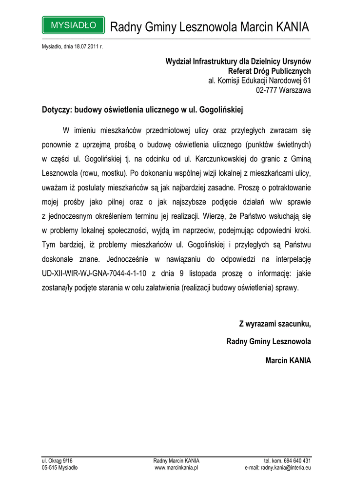 Radny Gminy Lesznowola Marcin KANIA ____________________________________________________________________________________________________________________________ Mysiadło, dnia 18.07.2011 r. Wydział Infrastruktury dla Dzielnicy Ursynów Referat Dróg Publicznych al. Komisji Edukacji Narodowej 61 02-777 Warszawa Dotyczy: budowy oświetlenia ulicznego w ul. Gogolińskiej W imieniu mieszkańców przedmiotowej ulicy oraz przyległych zwracam się ponownie z uprzejmą prośbą o budowę oświetlenia ulicznego (punktów świetlnych) w części ul. Gogolińskiej tj. na odcinku od ul. Karczunkowskiej do granic z Gminą Lesznowola (rowu, mostku). Po dokonaniu wspólnej wizji lokalnej z mieszkańcami ulicy, uważam iż postulaty mieszkańców są jak najbardziej zasadne. Proszę o potraktowanie mojej prośby jako pilnej oraz o jak najszybsze podjęcie działań w/w sprawie z jednoczesnym określeniem terminu jej realizacji. Wierzę, że Państwo wsłuchają się w problemy lokalnej społeczności, wyjdą im naprzeciw, podejmując odpowiedni kroki. Tym bardziej, iż problemy mieszkańców ul. Gogolińskiej i przyległych są Państwu doskonale znane. Jednocześnie w nawiązaniu do odpowiedzi na interpelację UD-XII-WIR-WJ-GNA-7044-4-1-10 z dnia 9 listopada proszę o informację: jakie zostaną/ły podjęte starania w celu załatwienia (realizacji budowy oświetlenia) sprawy. Z wyrazami szacunku, Radny Gminy Lesznowola Marcin KANIA ul. Okrąg 9/16 05-515 Mysiadło Radny Marcin KANIA www.marcinkania.pl tel. kom. 694 640 431 e-mail: [email protected]