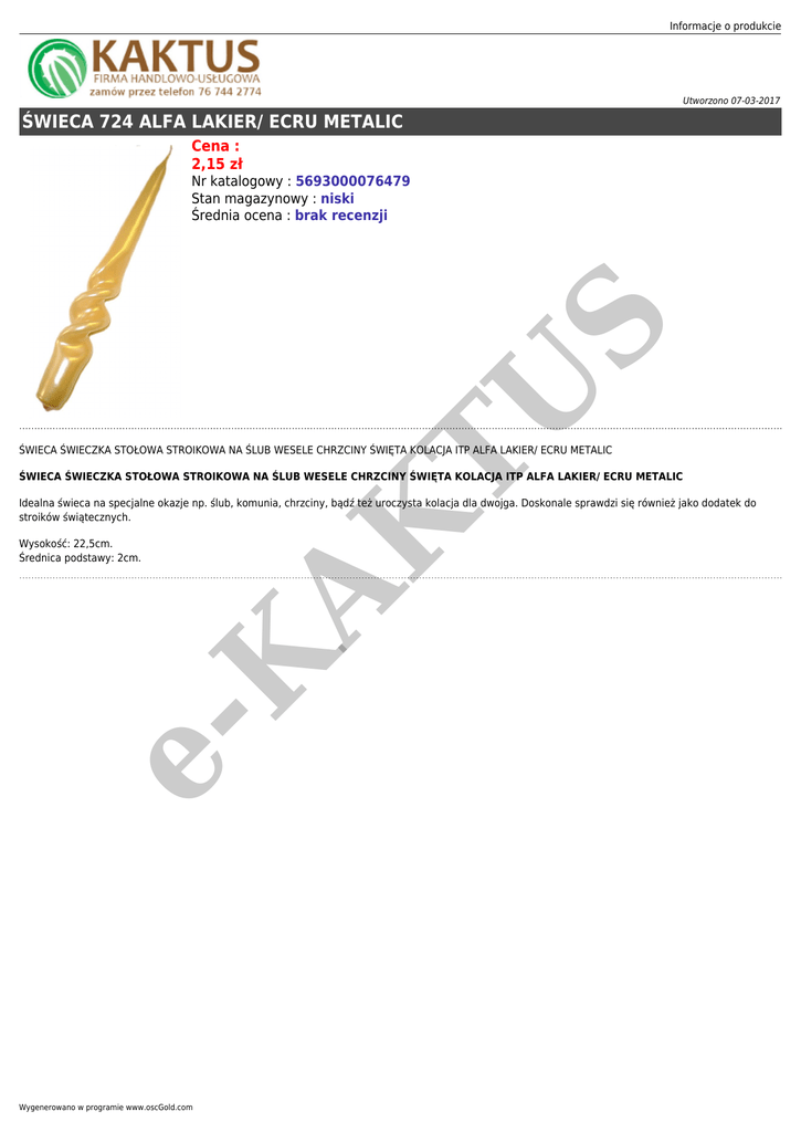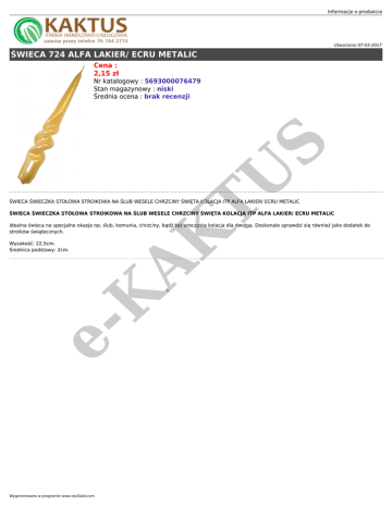 Informacje o produkcie Utworzono 07-03-2017 ŚWIECA 724 ALFA LAKIER/ ECRU METALIC Cena : 2,15 zł AK TU S Nr katalogowy : 5693000076479 Stan magazynowy : niski Średnia ocena : brak recenzji ŚWIECA ŚWIECZKA STOŁOWA STROIKOWA NA ŚLUB WESELE CHRZCINY ŚWIĘTA KOLACJA ITP ALFA LAKIER/ ECRU METALIC ŚWIECA ŚWIECZKA STOŁOWA STROIKOWA NA ŚLUB WESELE CHRZCINY ŚWIĘTA KOLACJA ITP ALFA LAKIER/ ECRU METALIC Idealna świeca na specjalne okazje np. ślub, komunia, chrzciny, bądź też uroczysta kolacja dla dwojga. Doskonale sprawdzi się również jako dodatek do stroików świątecznych. eK Wysokość: 22,5cm. Średnica podstawy: 2cm. Wygenerowano w programie www.oscGold.com