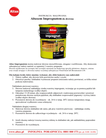 INSTRUKCJA MALOWANIA Altaxem Impregnatem do drewna Altax Impregnatem można malować drewno nieoszlifowane, strugane i oszlifowane. Aby skutecznie zabezpieczyć należy nanieść co najmniej 2 warstwy preparatu. Drewno użytkowane na zewnątrz lub wewnątrz narażone na biokorozję (grzyby pleśniowe, domowe, sinizna oraz owady żerujące w drewnie) należy wcześniej zabezpieczyć Penetrinem lub Boramonem C30. Oto kolejne kroki, które musimy wykonać, aby efekt końcowy nas zadowalał: 1. Należy zadbać, aby drewno było powietrzno-suche i czyste. 2. Otworzyć puszkę i dokładnie wymieszać preparat (mieszanie należy powtarzać, co kilka minut podczas malowania). Nakładanie pierwszej warstwy. 3. Drewno malować nakładając cienką warstwę impregnatu, wcierając go za pomocą pędzla lub tamponu malarskiego wzdłuż słojów. 4. Odczekać 15-20 minut, aby rozpuszczalnik odparował z malowanej powierzchni i przetrzeć pomalowane drewno suchym pędzlem, aby dokładnie rozprowadzić pigmenty i żywicę (także wzdłuż słojów drewna). 5. Pozostawić drewno do wyschnięcia – ok. 24 h w temp. 20oC (niższe temperatury mogą spowodować wydłużenie czasu schnięcia). Nakładanie drugiej warstwy. 6. Malować drewno dokładnie tak samo, jak przy warstwie pierwszej – nakładając cienką warstwę preparatu. 7. Pozostawić drewno do całkowitego wyschnięcia – ok. 24 h w temp. 20oC. 8. Jeżeli chcemy nałożyć trzecią warstwę robimy to dokładnie tak, jak nakładaliśmy poprzednie warstwy 9. Pozostawić do wyschnięcia. www.altax.pl INFOLINIA PORADNICZA: 0801 000 173 (pn.-pt. 8:00–16:00)
