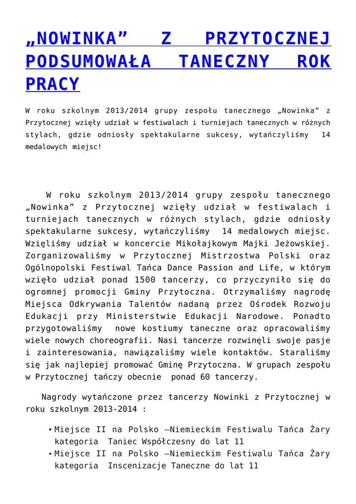 „NOWINKA” Z PRZYTOCZNEJ PODSUMOWAŁA TANECZNY ROK PRACY W roku szkolnym 2013/2014 grupy zespołu tanecznego „Nowinka” z Przytocznej wzięły udział w festiwalach i turniejach tanecznych w różnych stylach, gdzie odniosły spektakularne sukcesy, wytańczyliśmy 14 medalowych miejsc! W roku szkolnym 2013/2014 grupy zespołu tanecznego „Nowinka” z Przytocznej wzięły udział w festiwalach i turniejach tanecznych w różnych stylach, gdzie odniosły spektakularne sukcesy, wytańczyliśmy 14 medalowych miejsc. Wzięliśmy udział w koncercie Mikołajkowym Majki Jeżowskiej. Zorganizowaliśmy w Przytocznej Mistrzostwa Polski oraz Ogólnopolski Festiwal Tańca Dance Passion and Life, w którym wzięło udział ponad 1500 tancerzy, co przyczyniło się do ogromnej promocji Gminy Przytoczna. Otrzymaliśmy nagrodę Miejsca Odkrywania Talentów nadaną przez Ośrodek Rozwoju Edukacji przy Ministerstwie Edukacji Narodowe. Ponadto przygotowaliśmy nowe kostiumy taneczne oraz opracowaliśmy wiele nowych choreografii. Nasi tancerze rozwinęli swoje pasje i zainteresowania, nawiązaliśmy wiele kontaktów. Staraliśmy się jak najlepiej promować Gminę Przytoczna. W grupach zespołu w Przytocznej tańczy obecnie ponad 60 tancerzy. Nagrody wytańczone przez tancerzy Nowinki z Przytocznej w roku szkolnym 2013-2014 : Miejsce II na Polsko –Niemieckim Festiwalu Tańca Żary kategoria Taniec Współczesny do lat 11 Miejsce II na Polsko –Niemieckim Festiwalu Tańca Żary kategoria Inscenizacje Taneczne do lat 11 Miejsce II na Polsko –Niemieckim Festiwalu Tańca Żary kategoria Taniec współczesny 12-15 lat Miejsce II na Polsko –Niemieckim Festiwalu Tańca Żary kategoria Disco show 12-15 lat Miejsce I na Ogólnopolskim Festiwalu Tańca Sulechów kategoria Taniec Współczesny do lat 11 Miejsce II na Ogólnopolskim Festiwalu Tańca Sulechów kategoria Inscenizacja Taneczna do lat 11 Miejsce II na Ogólnopolskim Festiwalu Tańca Sulechów kategoria Taniec Współczesny 12-15 lat Miejsce I na Ogólnopolskim Festiwalu Tańca Sulechów kategoria Disco 12-15 lat Miejsce I na Ogólnopolskim Festiwalu Tańca Przytoczna kategoria Inscenizacje Taneczne do lat 6 Miejsce III na Ogólnopolskim Festiwalu Tańca Przytoczna kategoria Taniec Współczesny do lat 11 Miejsce II na Ogólnopolskim Festiwalu Tańca Przytoczna kategoria Inscenizacje Taneczne do lat 11 Miejsce I na Ogólnopolskim Festiwalu Tańca Przytoczna kategoria Disco 12-15 lat Miejsce I na Ogólnopolskim Festiwalu Tańca Przytoczna kategoria Taniec Współczesny 12-15 lat Miejsce V na Mistrzostwach Polski Formacji Rock’n’Rolla Akrobatycznego – nominacja do kadry narodowej oraz udziału w Pucharze Świata Gratulacje dla wszystkich tancerzy naszego zespołu. Dziękujemy za cały rok ciężkiej i owocnej pracy oraz za wasze uśmiechy i energię. Podziękowanie kierujemy również w stronę rodziców za nieocenioną jak zawsze pomoc oraz naszych przyjaciół, bez których działalność naszego zespołu niebyła by możliwa. Nasze sukcesy niebyły możliwe, gdyby nie wkład finansowy Gminy Przytoczna, za którE bardzo dziękujemy. Serdeczne podziękowania kierujemy do Wójta Gminy Przytoczna Bartłomieja Kucharyka oraz Dyrektora Gminnego Ośrodka Kultury w Przytocznej Piotra Barskiego. Dzięki waszej bezinteresownej życzliwości i wielkiemu sercu możliwy jest rozwój naszego zespołu. Mamy nadzieję, że sukcesy jakie osiągają nasi tancerze są najlepszym tego dowodem. „Ciągle jeszcze istnieją wśród nas anioły, Nie mają wprawdzie żadnych skrzydeł, Lecz ich serce jest bezpiecznym Portem dla wszystkich, którzy są w potrzebie. Wyciągają ręce i proponują swoją pomoc” Dziękujemy!!! Zespół Taneczny „NOWINKA”, Stowarzyszenie „NEW DANCE 1 18 2 3 4 2 5 28 1004944_800139036669877_610580000_n dsc05154 4 dsc05491 4 dsc05529 4 dsc06990 10 dsc06994 10 dsc07069 10 dsc07072 10 dsc07079 10 dsc07905 2 dsc07991 2 dsc08131 2 dsc08133 2 dsc08142 2 img_0234 img_1042 img_1112 img_1532 3 img_1934 img_2156 4 img_2159 3 img_2167 img_2173 img_2176 img_2351 img_2352 3 img_2361 4 img_2372 img_2382 img_2701 3 img_2711 3 img_2714 3 img_2718 img_2719 4 img_2983 img_2991 4 img_3016 4 img_3042 3 img_3075 4 img_9668 img_9711 img_9767