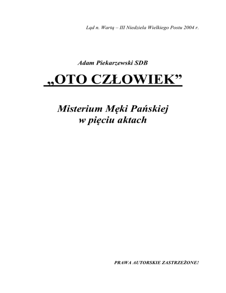Ląd n. Wartą – III Niedziela Wielkiego Postu 2004 r. Adam Piekarzewski SDB „OTO CZŁOWIEK” Misterium Męki Pańskiej w pięciu aktach PRAWA AUTORSKIE ZASTRZEŻONE! WPROWADZENIE Na przestrzeni wieków odbyło się już wiele prób scenicznego ujęcia ostatnich chwil życia Jezusa Chrystusa. Każda z nich, oparta przede wszystkim o przekaz czterech Ewangelii, ukazywała te same wydarzenia zbawcze, w różnym ujęciu, z wykorzystaniem szerokiej gamy środków, jakimi dysponuje teatr. Przesłanie jednak, zawsze pozostawało niezmienne – unaocznić Ewangelię śmierci i zmartwychwstania Mistrza z Nazaretu i zaproponować widzowi nie tylko obraz i dźwięk, ale także klimat i emocje, towarzyszące tym niezwykłym dziejom naszego odkupienia. Misterium Męki Pańskiej pt. „Oto Człowiek”, opierając się o zapis czterech ewangelistów oraz o dzieło Romana Brandstaettera „Jezus z Nazaretu”, stara się uczynić to samo. Akcentując kontekst, w jakim dokonywał się proces, męka, śmierć i zmartwychwstanie Zbawiciela, próbuje dać odpowiedź na szereg pytań, jakie nasuwają się nam podczas rozważania tych wydarzeń... Dlaczego Sanhedryn zdecydował się aresztować Jezusa tuż przed świętem Paschy? Czy sąd, który zebrał się w nocy był zgodny z prawem? Czy Judasz rzeczywiście zdradził swego Mistrza tylko dla marnych trzydziestu srebrników? Dlaczego Jezus nie poniósł śmierci przez ukamienowanie? Czemu żydzi nie chcieli wejść do pretorium namiestnika Piłata? Czy pośród Najwyższej Rady Żydowskiej byli kapłani sprzyjający Jezusowi? Po co przy grobie postawiono straż? Dlaczego apostołom tak trudno było uwierzyć w zmartwychwstanie? Na te, i wiele innych pytań próbuje odpowiedzieć właśnie Misterium „Oto Człowiek”, które powstało jako owoc modlitwy, lektury Pisma Świętego i rozważania wielkiej tajemnicy Bożego cierpienia. Jest ono jakby echem słów, mocno wybrzmiewających w czas Wielkiego Postu: „To nie gwoździe Cię przybiły, lecz mój grzech; to nie ludzie Cię skrzywdzili, lecz mój grzech. To nie gwoździe Cię trzymały, lecz mój grzech; choć tak dawno to się stało, widziałeś mnie...” OSOBY: Narrator, Jezus z Nazaretu, Sanhedryn (Najwyższa Rada): Kajfasz, Annasz, Józef z Arymatei, Nikodem, Gamaliel, Kapłan_1, Kapłan_2, Kapłan_3, Kapłan_4, Nahum, Malchus, Słudzy arcykapłana, Apostołowie: Judasz Iskariota, Jakub, Piotr, Tomasz, Jan, Bartłomiej, Kleofas, Baruk, Filip, Rzymianie: Piłat, Setnik, Decymus, Septymus, Kwintus, Oktawius, Sługa Piłata, Żydzi: Żyd_1, Żyd_2, Żyd_3, (Uwaga! Podany skład jest minimalny. Zaleca się, aby w miarę możliwości poszerzyć grono Sanhedrynu, Apostołów, Żołnierzy rzymskich, Żydów i Sług, a podane role podzielić.) SCENOGRAFIA: Akt I – Komnata zebrań Sanhedrynu. Akt II – 1) Ogród oliwny. 2) Plac z żołnierskim ogniskiem. Akt III – Komnata zebrań Sanhedrynu. Akt IV – Plac przed pałacem Piłata. Akt V – 1) Wzgórze Golgoty. 2) Wieczernik. Akt I Pałac arcykapłana Scena 1 Wprowadzenie (Kurtyna jest opuszczona. Zupełne ciemności. Na tle spokojnej muzyki instrumentalnej recytacja tekstu przez Narratora.) Narrator: W maleńkim mieście Nazaret ujrzał matkę, która w cierpliwym posłuszeństwie wciąż na Niego czeka i rozprasza swoją samotność myślami o Jego powrocie, a chociaż nie wie, kiedy ten powrót nastąpi, nigdy nie zwątpiła o spotkaniu z Synem, o radosnym powitaniu Go pod dachem ich wspólnego domu. Ona czeka... W tym domu wszystko czeka... Czekają ławy i stół, miski i żarna, dzbany i lampy oliwne, czeka podwójnie złożona mata w kącie izby i czeka... szczęśliwy płacz matki, gdy wreszcie z dala ujrzy idącego doliną pod górę, z pochyloną głową, Syna jedynego, Syna umiłowanego, Syna, który rozdał swoje serce jawnogrzesznicom, celnikom, prostakom, trędowatym, kalekom, grzesznikom, bezdomnym włóczęgom i roztrwonił hojną, błogosławioną rozrzutnością swoją krew w dalekich krainach, i był najpokorniejszym sługą, niewolnikiem niewolników, a teraz zmęczony i wyczerpany wieloletnią tułaczką, wraca do domu, do ojcowskiego domu. Gdzie jest szata dla Niego? Gdzie jest pierścień na Jego palec? Gdzie są sandały na Jego nogi? Gdzie są muzycy witający Go u bram? Matka płacze... Płacze za tym, którego ukochała ponad wszystko. Nie płacz, Matko! On – niepojęty, wieczny i nieskończony wkrótce do Ciebie powróci, ale jeszcze nie dzisiaj, nie jutro... Powróci i spocznie w Twych ramionach, a Ty wówczas utulisz Go i ułożysz do snu... Scena 2 Rozmowa Kajfasza z Annaszem (Kurtyna podnosi się. Widać komnatę zebrań Sanhedrynu. Annasz przegląda jakiś papirusowy zwój. W głębi stoi, obrócony plecami do widowni, Kajfasz.) Annasz: I co zamierzasz z tym uczynić, Kajfaszu? (Kajfasz odwraca się i zaczyna spacerować po pokoju.) Kajfasz: Uczynię to, co raczysz mi doradzić, dostojny teściu. (Kajfasz lekko kłania się w stronę Annasza.) Annasz: Kajfasz: Annasz: Kajfasz: Annasz: Kajfasz: Annasz: Kajfasz: Nahum: Kajfasz: Annasz: Kajfasz: Annasz: Kajfasz: Annasz: Kajfasz: To zbyt ważna chwila, bym miał sam przesądzać o sprawie. Rozważmy ją wspólnie.(Annasz wskazuje ręką na stojące z boku krzesło i nadal przegląda zwój. Kajfasz siada na jednym z krzeseł.) Usiądź. Szczycę się, że jest mi dozwolone porównać mój sąd z twoim, Annaszu... (przerywając) Powiedz mi, co zamierzasz? Od czasu cudu proroka Elizeusza żaden z synów Izraela nie wskrzesił martwego. Czy z tego wynika, że ten, który wskrzesił przed kilkoma dniami człowieka z Betanii, jest prorokiem? Czy mąż, który nie przestrzega Szabatu i nie obmywa rąk przed posiłkiem może być prorokiem? Czy mąż, który odmienia Prawo może być prorokiem? Kim on jest?! Ale wskrzesił. Są świadkowie. Tak, wskrzesił i są świadkowie. Są nawet tacy, którzy idą za nim. Czy mam więc udać się do Wysokiej Rady i spytać, co zam