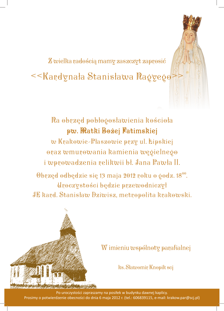 Z wielka radością mamy zaszczyt zaprosić <<Kardynała Stanisława Nagyego>> Na obrzęd pobłogosławienia kościoła pw. Matki Bożej Fatimskiej w Krakowie-Płaszowie przy ul. Lipskiej oraz wmurowania kamienia węgielnego i wprowadzenia relikwii bł. Jana Pawła II. Obrzęd odbędzie się 13 maja 2012 roku o godz. 18 00. Uroczystości będzie przewodniczył JE kard. Stanisław Dziwisz, metropolita krakowski. W imieniu wspólnoty parafialnej ks. Sławomir Knopik scj Po uroczystości zapraszamy na posiłek w budynku dawnej kaplicy. Prosimy o potwierdzenie obecności do dnia 6 maja 2012 r. (tel.: 606839115, e-mail: [email protected]) Zaproszenie