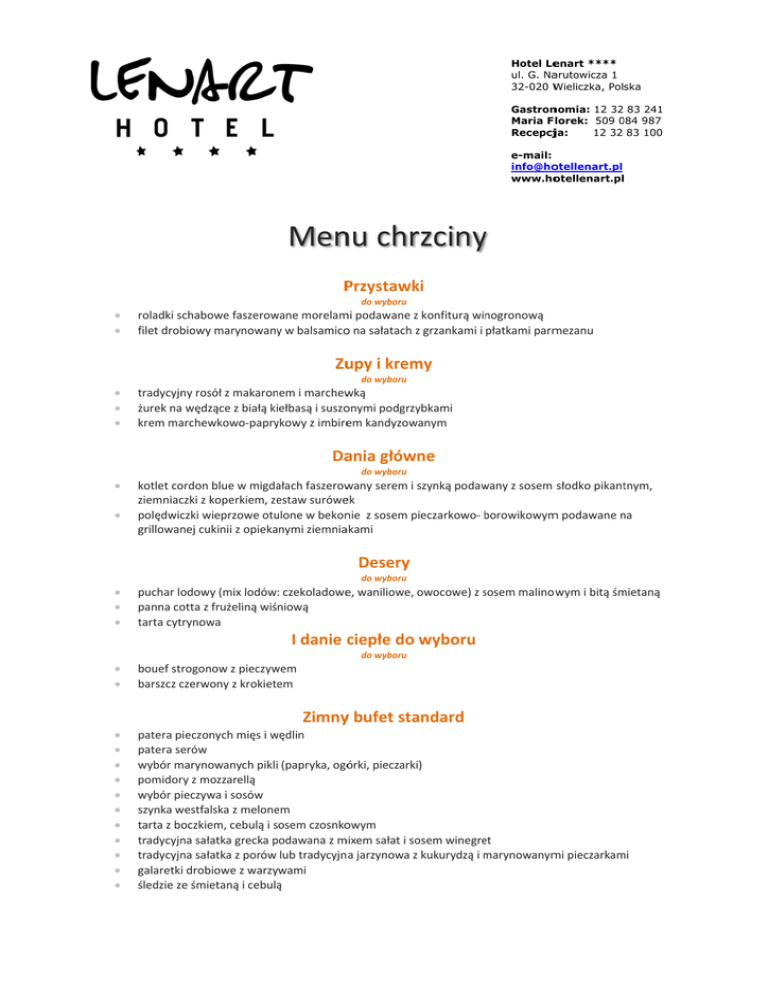 Hotel Le enart **** ul. G. Na arutowicza 1 32-020 W Wieliczka, Polska Gastron nomia: 12 32 83 241 Maria F lorek: 509 084 0 987 Recepcjja: 12 32 83 100 e-mail: info@ho otellenart.pl www.ho otellenart.pl Mennu chrrzcinyy P Przystawkki do wyboru roladki schabo owe faszerow wane morelam mi podawane zz konfiturą winogronową ffilet drobiowyy marynowanyy w balsamicoo na sałatach zz grzankami i płatkami parm mezanu Zu upy i krem my do wyboru ttradycyjny rossół z makaron nem i marchew wką żżurek na wędzące z białą kiiełbasą i suszoonymi podgrzyybkami wkowo‐papryykowy z imbireem kandyzow wanym krem marchew Daania głów wne do wyboru kotlet cordon blue w migda ałach faszerow wany serem i szynką podaw wany z sosem słodko pikanttnym, zziemniaczki z koperkiem, ze estaw suróweek wieprzowe otu ulone w bekonnie z sosem p pieczarkowo‐ b borowikowym m podawane n na polędwiczki w ggrillowanej cu ukinii z opiekanymi ziemniaakami Desery do wyboru puchar lodow wy (mix lodów: czekoladowee, waniliowe, owocowe) z ssosem malinoowym i bitą śm mietaną panna cotta zz frużeliną wiśniową ttarta cytrynow wa I danie ciepłe do wyboru do wyboru bouef strogon now z pieczyw wem barszcz czerw wony z krokietem patera pieczo onych mięs i w wędlin patera serów w wybór marynowanych piklii (papryka, ogóórki, pieczarki) pomidory z m mozzarellą w wybór pieczyw wa i sosów sszynka westfaalska z melone em ttarta z boczkieem, cebulą i ssosem czosnkoowym ttradycyjna sałłatka grecka p podawana z m mixem sałat i so osem winegre et ttradycyjna sałłatka z porów lub tradycyjnna jarzynowa zz kukurydzą i m marynowanym mi pieczarkam mi ggalaretki drob biowe z warzyywami śśledzie ze śmiietaną i cebulą ą Zimnyy bufet sta andard Hotel Le enart **** ul. G. Na arutowicza 1 32-020 W Wieliczka, Polska Gastron nomia: 12 32 83 241 Maria F lorek: 509 084 0 987 Recepcjja: 12 32 83 100 e-mail: info@ho otellenart.pl www.ho otellenart.pl Bufet słłodki patera owocó ów cciasta: strudel z jabłkiem i śśliwką, słodkiee babeczki Naapoje (wliiczone w ccenę zesta awu w we ersji bez liimitu) kkawa, herbataa, woda, soki, napoje gazow wane Grattis w rama ach chrzcin kklimatyzacja p parking dla go ości sstół nakryty białym obrusem m, serwetamii, świece d delikatna dekoracja kwiatowa p pokój do przeewijania dzieckka kkącik zabaw d dla dzieci (przyy większej licz bie dzieci bajkki wyświetlane na dużym p rojektorze a la kino) Cena za os C sobę doro osłą: 150złł/brutto d dzieci do lat 6 6‐ciu uczestnicczą w przyjęci u bezpłatnie, dzieci od lat 7 7 do 12 ‐ połoowa ceny O Osobna sala –– 500 zł Fontanna czekoladowa – 600 zł 50 zł/kg Pieczony udziec z kością – 5 Opcjon nalne usługi dodatkowe