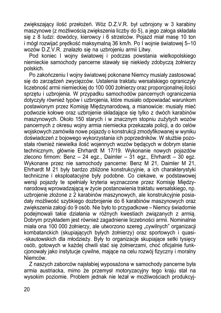 zwie˛kszaja˛cy ilość przełożeń. Wóz D.Z.V.R. był uzbrojony w 3 karabiny maszynowe (z możliwościa˛ zwie˛kszenia liczby do 5), a jego załoga składała sie˛ z 8 ludzi: dowódcy, kierowcy i 6 strzelców. Pojazd miał mase˛ 10 ton i mógł rozwijać pre˛dkość maksymalna˛ 36 km/h. Po I wojnie światowej 5–10 wozów D.Z.V.R. znalazło sie˛ na uzbrojeniu armii Litwy. Pod koniec I wojny światowej i podczas powstania wielkopolskiego niemieckie samochody pancerne stawały sie˛ niekiedy zdobycza˛ żołnierzy polskich. Po zakończeniu I wojny światowej pokonane Niemcy musiały zastosować sie˛ do zarza˛dzeń zwycie˛zców. Ustalenia traktatu wersalskiego ograniczyły liczebność armii niemieckiej do 100 000 żołnierzy oraz proporcjonalnej ilości sprze˛tu i uzbrojenia. W przypadku samochodów pancernych ograniczenia dotyczyły również typów i uzbrojenia, które musiało odpowiadać warunkom postawionym przez Komisje˛ Mie˛dzynarodowa˛, a mianowicie: musiały mieć podwozie kołowe oraz uzbrojenie składaja˛ce sie˛ tylko z dwóch karabinów maszynowych. Około 150 starych i w znacznym stopniu zużytych wozów pancernych z okresu wojny armia niemiecka przekazała policji, a do celów wojskowych zamówiła nowe pojazdy o konstrukcji zmodyfikowanej w wyniku doświadczeń z bojowego wykorzystania ich poprzedników. W służbie pozostała również niewielka ilość wojennych wozów be˛da˛cych w dobrym stanie technicznym, głównie Ehrhardt M 17/19. Wykonanie nowych pojazdów zlecono firmom: Benz – 24 egz., Daimler – 31 egz., Ehrhardt – 30 egz. Wykonane przez nie samochody pancerne: Benz M 21, Daimler M 21, Ehrhardt M 21 były bardzo zbliżone konstrukcyjnie, a ich charakterystyki techniczne i eksploatacyjne były podobne. Co ciekawe, w podstawowej wersji pojazdy te spełniały kryteria wyznaczone przez Komisje˛ Mie˛dzynarodowa˛ wprowadzaja˛ca˛ w życie postanowienia traktatu wersalskiego, np. uzbrojenie złożone z 2 karabinów maszynowych, ale konstrukcyjnie posiadały możliwość szybkiego dozbrojenie do 6 karabinów maszynowych oraz zwie˛kszenia załogi do 9 osób. Nie było to przypadkowe – Niemcy świadomie podejmowali takie działania w różnych kwestiach zwia˛zanych z armia˛. Dobrym przykładem jest również zagadnienie liczebności armii. Nominalnie miała ona 100 000 żołnierzy, ale utworzono szereg „cywilnych” organizacji kombatanckich (skupiaja˛cych byłych żołnierzy) oraz sportowych i quasi-skautowskich dla młodzieży. Były to organizacje skupiaja˛ce setki tysie˛cy osób, gotowych w każdej chwili stać sie˛ żołnierzami, choć oficjalnie funkcjonowały jako instytucje cywilne, maja˛ce na celu rozwój fizyczny i moralny Niemców. Z naszych zaborców najsłabiej wyposażona w samochody pancerne była armia austriacka, mimo że przemysł motoryzacyjny tego kraju stał na wysokim poziomie. Problem jednak nie leżał w możliwościach produkcyj20
