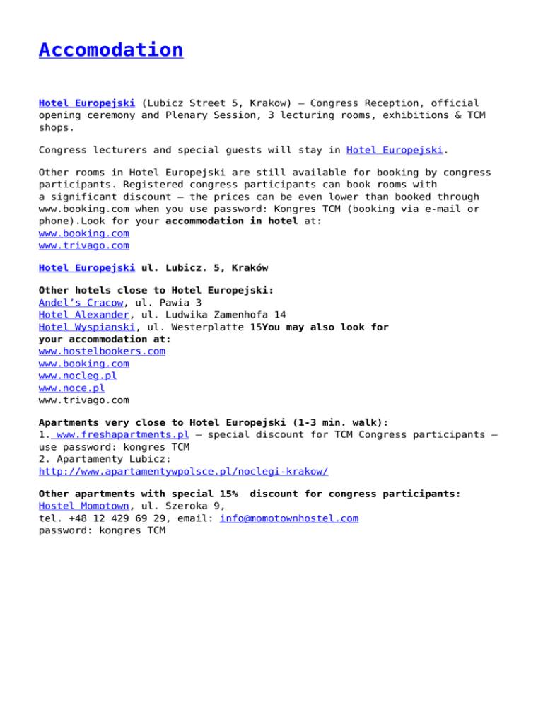 Accomodation Hotel Europejski (Lubicz Street 5, Krakow) – Congress Reception, official opening ceremony and Plenary Session, 3 lecturing rooms, exhibitions & TCM shops. Congress lecturers and special guests will stay in Hotel Europejski. Other rooms in Hotel Europejski are still available for booking by congress participants. Registered congress participants can book rooms with a significant discount – the prices can be even lower than booked through www.booking.com when you use password: Kongres TCM (booking via e-mail or phone).Look for your accommodation in hotel at: www.booking.com www.trivago.com Hotel Europejski ul. Lubicz. 5, Kraków Other hotels close to Hotel Europejski: Andel’s Cracow, ul. Pawia 3 Hotel Alexander, ul. Ludwika Zamenhofa 14 Hotel Wyspianski, ul. Westerplatte 15You may also look for your accommodation at: www.hostelbookers.com www.booking.com www.nocleg.pl www.noce.pl www.trivago.com Apartments very close to Hotel Europejski (1-3 min. walk): 1. www.freshapartments.pl – special discount for TCM Congress participants – use password: kongres TCM 2. Apartamenty Lubicz: http://www.apartamentywpolsce.pl/noclegi-krakow/ Other apartments with special 15% discount for congress participants: Hostel Momotown, ul. Szeroka 9, tel. +48 12 429 69 29, email: [email protected] password: kongres TCM
