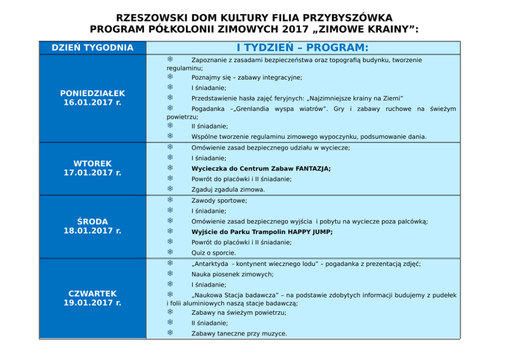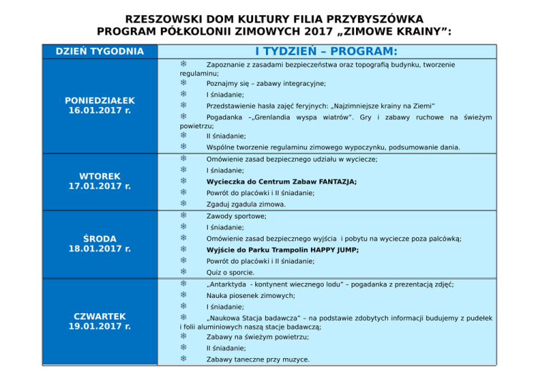 RZESZOWSKI DOM KULTURY FILIA PRZYBYSZÓWKA PROGRAM PÓŁKOLONII ZIMOWYCH 2017 „ZIMOWE KRAINY”: I TYDZIEŃ – PROGRAM: DZIEŃ TYGODNIA Zapoznanie z zasadami bezpieczeństwa oraz topografią budynku, tworzenie regulaminu; PONIEDZIAŁEK 16.01.2017 r. WTOREK 17.01.2017 r. ŚRODA 18.01.2017 r. CZWARTEK 19.01.2017 r. Poznajmy się – zabawy integracyjne; II śniadanie; Zabawy na świeżym powietrzu; I śniadanie; Przedstawienie hasła zajęć feryjnych: „Najzimniejsze krainy na Ziemi” Pogadanka –„Grenlandia wyspa wiatrów”. Gry i zabawy ruchowe na świeżym powietrzu; Wspólne tworzenie regulaminu zimowego wypoczynku, podsumowanie dania. Omówienie zasad bezpiecznego udziału w wyciecze; I śniadanie; Wycieczka do Centrum Zabaw FANTAZJA; Powrót do placówki i II śniadanie; Zgaduj zgadula zimowa. Zawody sportowe; I śniadanie; Omówienie zasad bezpiecznego wyjścia i pobytu na wyciecze poza palcówką; Wyjście do Parku Trampolin HAPPY JUMP; Powrót do placówki i II śniadanie; Quiz o sporcie. „Antarktyda - kontynent wiecznego lodu” – pogadanka z prezentacją zdjęć; Nauka piosenek zimowych; I śniadanie; „Naukowa Stacja badawcza” – na podstawie zdobytych informacji budujemy z pudełek i folii aluminiowych naszą stacje badawczą; II śniadanie; Zabawy taneczne przy muzyce. PIĄTEK 20.01.2017 r. Jutro Dzień Babci i Dziadka – robimy śmieszne kartki – wycinanki; I śniadanie; Wyjście do Kina; Powrót do placówki. Podsumowanie I tygodnia ferii - wręczenie nagród. II TYDZIEŃ – PROGRAM: DZIEŃ TYGODNIA Zapoznanie się z placówka, regulaminem wypoczynku i przepisami bezpieczeństwa; Poznajmy się – zabawy integracyjne; PONIEDZIAŁEK 23.01.2017 r. WTOREK 24.01.2017 r. ŚRODA 25.01.2017 r. I śniadanie; Zgadywanki muzyczne. Pogadanka –„Islandia - kraj reniferów, lisów i niedźwiedzi polarnych”; Białe szaleństwo – praca malarska; Zabawy sprawnościowe na świeżym powietrzu; II śniadanie; Nauka piosenki „Mały Eskimosek”. Omówienie zasad bezpiecznego udziału w wyciecze; I śniadanie; Wyjście do Kręgielni (Galeria Nowy Świat); Powrót do placówki i II śniadanie; Quiz sportowy. Zawody sportowe; I śniadanie; Omówienie zasad bezpiecznego wyjścia i pobytu na wyciecze poza placówką; Warsztaty w Muzeum Etnograficznym: dawne zabawki - co zamiast Barbi i Lego, dowiesz się kolego!; Powrót do placówki i II śniadanie; „Syberia - kraina tundry i tajgi” – pogadanka z prezentacją zdjęć, wyjaśnienie pojęć; CZWARTEK 26.01.2017 r. PIĄTEK 27.01.2017 r. Śpiewanie piosenek zimowych z dobrana gestykulacją; I śniadanie; „Mieszkańcy Alaski i Kanady” – Eskimosi i ich domostwa: zajęcia plastyczne; Zabawy na świeżym powietrzu; II śniadanie; Zgaduj zgadula zimowa. Gimnastyka na wesoło: ruch na dobry początek dnia; I śniadanie; Wyjście na Ściankę wspinaczkową; Wizyta w pizzerii; Powrót do placówki. Podsumowanie II tygodnia ferii - wręczenie nagród.