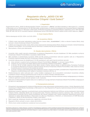 Regulamin oferty „6000 Citi Mil dla klientów Citigold i Gold Select” I. Organizator Organizatorem oferty „6000 Citi Mil dla klientów Citigold i Gold Select” („Oferta”) jest Bank Handlowy w Warszawie S.A. z siedzibą w Warszawie, przy ul. Senatorskiej 16, 00–923 Warszawa, zarejestrowany w rejestrze przedsiębiorców Krajowego Rejestru Sądowego przez Sąd Rejonowy dla m.st. Warszawy w Warszawie, XII Wydział Gospodarczy Krajowego Rejestru Sądowego, pod nr KRS 000 000 1538; NIP 526–030–02–91, wysokość kapitału zakładowego wynosi 522.638.400 złotych; kapitał został w pełni opłacony („Bank”). II. Czas trwania Oferty Oferta obowiązuje od 22.12. 2014 r. do 31.03. 2015 r III. Uczestnicy Oferty 1. Z Oferty może skorzystać pełnoletnia osoba fizyczna (zwana dalej „Uczestnikiem”), która w okresie trwania Oferty złoży wniosek o Kartę Kredytową Citibank PremierMiles. 2. Z Oferty nie mogą skorzystać osoby, które przed rozpoczęciem obowiązywania Oferty złożyły już wniosek o Kartę Kredytową Citibank PremierMiles i nie otrzymały jeszcze informacji o ostatecznej decyzji kredytowej Banku. 3. Skorzystanie z Oferty jest dobrowolne. IV. Zasady skorzystania z Oferty 1. Uczestnik, który spełni warunki przewidziane w niniejszym Regulaminie otrzyma dodatkowe Citi Mile powitalne na Karcie Kredytowej Citibank PremierMiles w wysokości 4000 Citi Mil. 2. Mile powitalne w standardowej wysokości 2000 Citi Mil zostaną Uczestnikowi naliczone zgodnie z §5 ust. 2 Regulaminu Programu lojalnościowego dla Karty Kredytowej Citibank PremierMiles 3. Uczestnik nabywa prawo do dodatkowych Citi Mil powitalnych, jeśli spełni łącznie poniższe warunki: a) złoży wniosek o wydanie Karty Kredytowej Citibank PremierMiles(„Wniosek”) w okresie trwania Oferty; b) zostanie mu przyznana przez Bank główna Karta Kredytowa Citibank PremierMiles ( „Karta”) ; c) w okresie 30 dni od daty zawarcia przez Bank umowy o Kartę, wykona Kartą co najmniej jedną Transakcję Punktową w rozumieniu Regulaminu Programu lojalnościowego dla Karty Kredytowej Citibank PremierMiles. Datę zawarcia Umowy Uczestnik pozna w momencie otrzymania tej umowy; d) na koniec miesiąca poprzedzającego datę podpisania umowy o Kartę przez Bank, posiadał konto Citigold Select lub konto Citigold ze średniomiesięcznym saldem w wysokości minimum 200 tys. zł; 4. Średniomiesięczne saldo wyliczane jest z sumy środków znajdujących się na wszystkich rachunkach Uczestnika w Banku w kolejnych dniach miesiąca podzielonej przez liczbę dni w danym miesiącu kalendarzowym. 5. Naliczenie dodatkowych Citi Mil powitalnych nastąpi do końca kolejnego miesiąca kalendarzowego następującego po miesiącu, w którym spełnione zostały warunki opisane w ust. 3 powyżej . 6. Naliczenie Citi Mil powitalnych będzie widoczne na najbliższym wyciągu dla Karty Kredytowej Citibank PremierMiles następującym po dacie ich naliczenia. V. Postanowienia końcowe 1. W kwestiach nieuregulowanych niniejszym Regulaminem mają zastosowanie postanowienia umowy o Kartę, Regulaminu Kart Kredytowych Citibank Banku Handlowego w Warszawie S.A. oraz Regulaminu Programu lojalnościowego dla Karty Kredytowej Citibank PremierMiles. 2. Reklamacje mogą być zgłaszane za pośrednictwem serwisu bankowości telefonicznej CitiPhone, serwisu bankowości internetowej Citibank Online, oddziałów Banku lub korespondencyjnie. Pisemna reklamacja powinna zawierać: imię, nazwisko, adres zamieszkania Uczestnika Oferty, telefon kontaktowy, jak również dokładny opis i powód reklamacji. Reklamacje powinny być zgłaszane na adres: Bank Handlowy w Warszawie S.A., Biuro ds. Współpracy z Klientem, ul. Goleszowska 6, 01–249 Warszawa, z dopiskiem „6000 Citi Mil dla klientów Citigold i Gold Select”. 3. Bank rozpatruje reklamacje niezwłocznie, najpóźniej w terminie 30 dni. 4. Regulamin Oferty wchodzi w życie z dniem 22.12 2014 r. Bank Handlowy w Warszawie S.A. z siedzibą w Warszawie, ul. Senatorska 16, 00-923 Warszawa, zarejestrowany w rejestrze przedsiębiorców Krajowego Rejestru Sądowego przez Sąd Rejonowy dla m. st. Warszawy w Warszawie, XII Wydział Gospodarczy Krajowego Rejestru Sądowego, pod nr KRS 000 0001538; NIP: 526-030-02-91; wysokość kapitału zakładowego wynosi 522.638.400 złotych; kapitał został w pełni opłacony. Znaki Citi oraz Citi Handlowy stanowią zarejestrowane znaki towarowe Citigroup Inc., używane na podstawie licencji. Spółce Citigroup Inc. oraz jej spółkom zależnym przysługują również prawa do niektórych innych znaków towarowych tu użytych. 02/2015 5. Oferta może zostać przedłużona i powtarzać się w przyszłości.