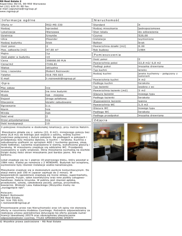 RS Real Estate 2 Kopernika 30/10, 00-950 Warszawa tel.(22) 629 01 80 fax. e-mail:[email protected] www.rsgroup.pl Informacje ogólne Nieruchomość Oferta nr RS2-MS-330 Standard 4 Rodzaj sprzedaż Rodzaj mieszkania jednopoziomowe Lokalizacja Warszawa Stan lokalu do odświeżenia Dzielnica Ursynów Czynsz 520,00 Ulica Meander Instalacje wymienione Rodzaj budynku blok Balkon brak Ilość pokoi 2 Powierzchnia działki [m2] 0.00 Pow. całkowita [m2] 47.00 m² Rok budowy 1984 Piętro 1p Ilość pięter w budynku 10 Cena 350000.00 PLN Pomieszczenia Ilość pokoi 2 Powierzchnia pokoi 22,8 m2/ 6,8 m2 Podłogi pokoi mozaika drewniana Typ kuchni aneks Rodzaj kuchni aneks kuchenny - połączony z salonem Powierzchnia kuchni 4 m2 Podłoga kuchni terakota nie Typ łazienki osobno z wc na inne budynki Powierzchnia łazienki [m2] 3 m2 tak - miejska Glazura łazienki nowego typu droga asfaltowa Podłoga łazienki terakota Otoczenie działki zabudowane Wyposażenie łazienki wanna Ogrzewanie c.o. Powierzchnia WC 1,5 m2 nie Glazura WC nowego typu tak Podłoga WC terakota Ilość wind 2 Podłoga przedpokoi mozaika drewniana Drzwi antywłamaniowe nie Zdjęcia Ilość kondygnacji 10 Cena/m2 7446.81 Status aktualna Imię i nazwisko Robert Rożnowski Telefon 516 705 023 E-mail [email protected] Opis Plac zabaw Widok Woda Dojazd Alarm Winda 2-pokojowe mieszkanie w doskonałej lokalizacji, przy metrze Natolin. Mieszkanie składa się z: salonu (22, 8 m2), mniejszego pokoju bez okna (6,8 m2) do którego jest wejście z salonu, widnej kuchni częściowo połączonej z dużym pokojem. Na podłogach w pokojach i przedpokoju leży mozaika dębowa, w kuchni – terakota. Kuchnia z zabudowana szafkami ze sprzętem AGD ( kuchenka gazowa, okap, mała lodówka). Łazienka wyposażona w wannę, wykończona glazurą i terakotą. W mieszkaniu znajduje się oddzielne WC. Przedpokój wyposażony w szafy wnękowe. Okna mieszkania wychodzą na wschód. Dzięki dużej ilości okien mieszkanie jest bardzo jasne. Nie ma balkonu. Lokal znajduje się na 1 piętrze 10-piętrowego bloku, który powstał w 1984 roku. Klatka po remoncie z 2 WINDAMI. Budynek był ocieplony, wymienione były również instalacje wodno-kanalizacyjne. Mieszkanie znajduje się w doskonałym punkcie komunikacyjnym. Do stacji metra jest 100 m (spacer zajmuje do 2 minut). W bezpośrednim sąsiedztwie znajdują się liczne sklepy, supermarkety, warzywnik, fryzjer, salon kosmetyczny oraz inne punkty usługowohandlowe. Galeria Ursynów. W pobliżu jest również apteka, przedszkole, szkoła, całodobowa poczta, policja, przychodnie, kawiarnie. Bliskość Lasu Kabackiego (Wszystko mamy na „wyciągnięcie ręki”. Polecam: Robert Rożnowski RS Real Estate, tel: 516 705 023, [email protected] Prezentowane przez nas Nieruchomości oraz ich opisy nie stanowią oferty w rozumieniu Kodeksu Cywilnego. Pośrednik odpowiedzialny za realizację umowy pośrednictwa dotyczącej tej oferty posiada numer licencji zawodowej 20579 oraz obowiązkowe ubezpieczenie odpowiedzialności cywilnej. TYLKO SPRAWDZONE OFERTY © Wszelkie prawa zastrzeżone - RS Real Estate