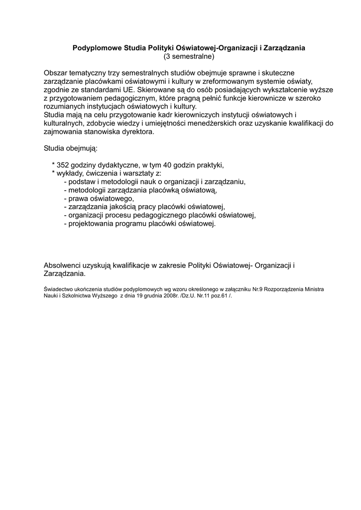 Podyplomowe Studia Polityki Oświatowej-Organizacji i Zarządzania (3 semestralne) Obszar tematyczny trzy semestralnych studiów obejmuje sprawne i skuteczne zarządzanie placówkami oświatowymi i kultury w zreformowanym systemie oświaty, zgodnie ze standardami UE. Skierowane są do osób posiadających wykształcenie wyższe z przygotowaniem pedagogicznym, które pragną pełnić funkcje kierownicze w szeroko rozumianych instytucjach oświatowych i kultury. Studia mają na celu przygotowanie kadr kierowniczych instytucji oświatowych i kulturalnych, zdobycie wiedzy i umiejętności menedżerskich oraz uzyskanie kwalifikacji do zajmowania stanowiska dyrektora. Studia obejmują: * 352 godziny dydaktyczne, w tym 40 godzin praktyki, * wykłady, ćwiczenia i warsztaty z: - podstaw i metodologii nauk o organizacji i zarządzaniu, - metodologii zarządzania placówką oświatową, - prawa oświatowego, - zarządzania jakością pracy placówki oświatowej, - organizacji procesu pedagogicznego placówki oświatowej, - projektowania programu placówki oświatowej. Absolwenci uzyskują kwalifikacje w zakresie Polityki Oświatowej- Organizacji i Zarządzania. Świadectwo ukończenia studiów podyplomowych wg wzoru określonego w załączniku Nr.9 Rozporządzenia Ministra Nauki i Szkolnictwa Wyższego z dnia 19 grudnia 2008r. /Dz.U. Nr.11 poz.61 /.