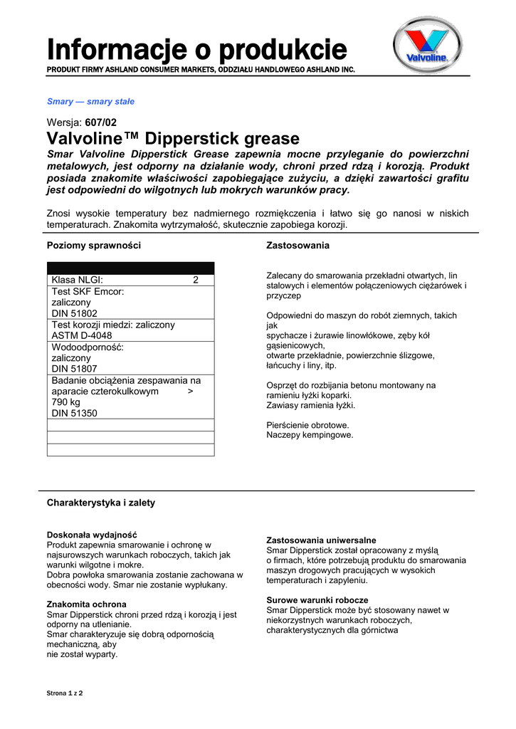 Informacje o produkcie PRODUKT FIRMY ASHLAND CONSUMER MARKETS, ODDZIAŁU HANDLOWEGO ASHLAND INC. Smary — smary stałe Wersja: 607/02 Valvoline™ Dipperstick grease Smar Valvoline Dipperstick Grease zapewnia mocne przyleganie do powierzchni metalowych, jest odporny na działanie wody, chroni przed rdzą i korozją. Produkt posiada znakomite właściwości zapobiegające zużyciu, a dzięki zawartości grafitu jest odpowiedni do wilgotnych lub mokrych warunków pracy. Znosi wysokie temperatury bez nadmiernego rozmiękczenia i łatwo się go nanosi w niskich temperaturach. Znakomita wytrzymałość, skutecznie zapobiega korozji. Poziomy sprawności Klasa NLGI: 2 Test SKF Emcor: zaliczony DIN 51802 Test korozji miedzi: zaliczony ASTM D-4048 Wodoodporność: zaliczony DIN 51807 Badanie obciążenia zespawania na aparacie czterokulkowym > 790 kg DIN 51350 Zastosowania Zalecany do smarowania przekładni otwartych, lin stalowych i elementów połączeniowych ciężarówek i przyczep Odpowiedni do maszyn do robót ziemnych, takich jak spychacze i żurawie linowłókowe, zęby kół gąsienicowych, otwarte przekładnie, powierzchnie ślizgowe, łańcuchy i liny, itp. Osprzęt do rozbijania betonu montowany na ramieniu łyżki koparki. Zawiasy ramienia łyżki. Pierścienie obrotowe. Naczepy kempingowe. Charakterystyka i zalety Doskonała wydajność Produkt zapewnia smarowanie i ochronę w najsurowszych warunkach roboczych, takich jak warunki wilgotne i mokre. Dobra powłoka smarowania zostanie zachowana w obecności wody. Smar nie zostanie wypłukany. Znakomita ochrona Smar Dipperstick chroni przed rdzą i korozją i jest odporny na utlenianie. Smar charakteryzuje się dobrą odpornością mechaniczną, aby nie został wyparty. Strona 1 z 2 Zastosowania uniwersalne Smar Dipperstick został opracowany z myślą o firmach, które potrzebują produktu do smarowania maszyn drogowych pracujących w wysokich temperaturach i zapyleniu. Surowe warunki robocze Smar Dipperstick może być stosowany nawet w niekorzystnych warunkach roboczych, charakterystycznych dla górnictwa Informacje o produkcie PRODUKT FIRMY ASHLAND CONSUMER MARKETS, ODDZIAŁU HANDLOWEGO ASHLAND INC. Bezpieczeństwo People Who Know, Use Valvoline™ Niniejszy produkt prawdopodobnie nie stwarza znaczącego zagrożenia dla zdrowia lub bezpieczeństwa, o ile jest używany prawidłowo w odpowiednim zastosowaniu. Kartę charakterystyki (MSDS) można uzyskać na życzenie od lokalnego dystrybutora lub pobrać ją z witryny pod adresem http://msds.ashland.com Działając w ponad 100 krajach na całym świecie, firma Valvoline to wiodący sprzedawca, dystrybutor i producent wysokiej jakości produktów i usług samochodowych i przemysłowych. Do produktów tej firmy należą smary samochodowe, m. in. MaxLife™ — pierwszy olej silnikowy o formule przeznaczonej specjalnie do pojazdów o wyższym przebiegu; płyny przekładniowe, oleje przekładniowe, smary hydrauliczne, chemikalia motoryzacyjne, produkty specjalne; smary oraz produkty do układu chłodzenia. Ochrona środowiska Zużyty olej i smar należy oddawać do odpowiedniego punktu zbiórki. Nie spuszczać do ścieków, gleby lub cieków wodnych. Aby uzyskać więcej informacji na temat produktów i usług firmy Valvoline, odwiedź www.valvolineeurope.com Charakterystyczne właściwości Charakterystyka typowych właściwości jest oparta na aktualnie produkowanym preparacie. W przyszłości produkcja będzie zgodna ze specyfikacjami Valvoline™, natomiast mogą wystąpić zmiany tej charakterystyki. Smar stały Dipperstick Klasa NLGI Mydlany Penetracja po ugniataniu, 25ºC. ASTM D-217 Lepkość oleju, mm2/s w temperaturze 40ºC. ASTM D-445 Lepkość oleju, mm2/s w temperaturze 100ºC. ASTM D-445 Temperatura kroplenia ºC ASTM D-566 Temperatura nanoszenia ºC. Kolor Konsystencja Autor: AdG Zastępuje - 607/01 2 Środek do smarowania przekładni 265-295 660 45 250 min. -20 do + 140 Szary/czarny lepki Niniejsze informacje dotyczą wyłącznie produktów wytwarzanych w następujących lokalizacjach: Europa *Znak towarowy będący własnością osoby trzeciej ™ Znak towarowy Ashland lub przedsiębiorstw zależnych, zarejestrowany w różnych krajach © 2011, Ashland Uważa się, że wszelkie informacje oraz dane przedstawione w niniejszym dokumencie są dokładne i wiarygodne, ale nie mogą być traktowane jako gwarancja, gwarancja wyraźna lub dorozumiana, gwarancja przydatności handlowej lub przydatności do określonego celu, lub reprezentacja, wyraźna lub dorozumiana, za którą Ashland Inc. i jej spółki zależne ponoszą odpowiedzialność prawną. Strona 2 z 2