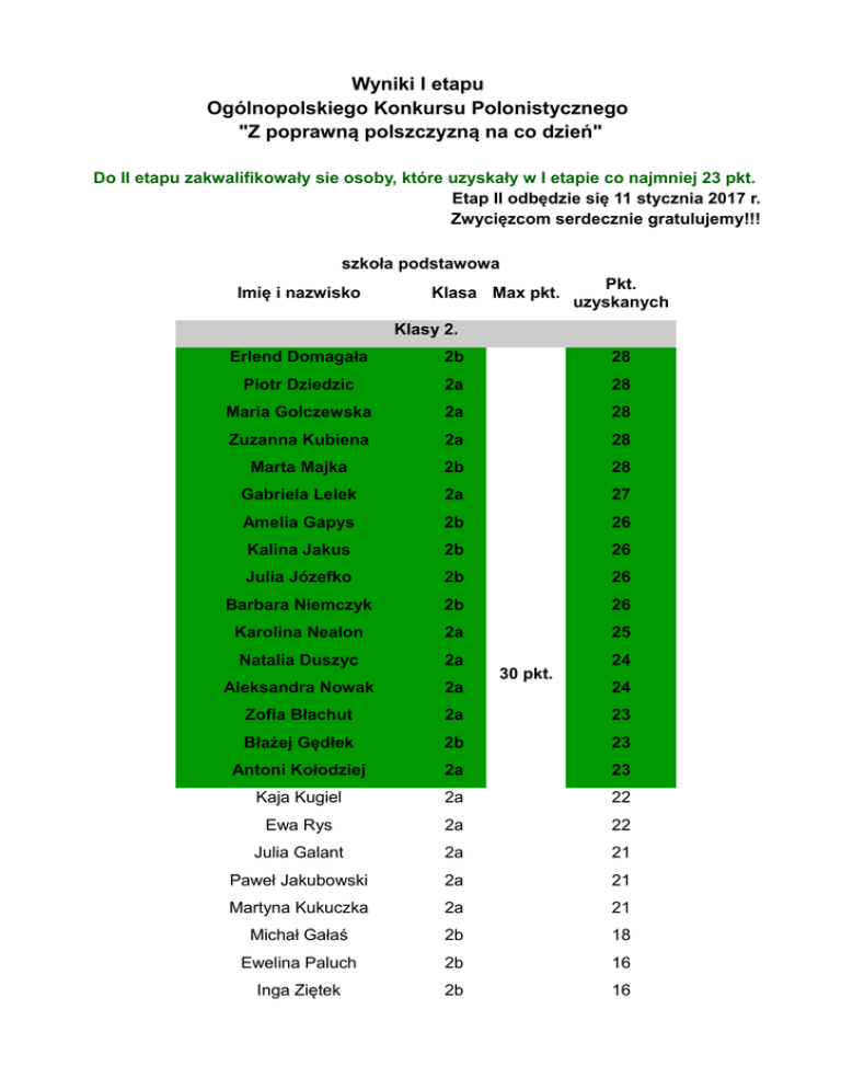 Wyniki I etapu Ogólnopolskiego Konkursu Polonistycznego "Z poprawną polszczyzną na co dzień" Do II etapu zakwalifikowały sie osoby, które uzyskały w I etapie co najmniej 23 pkt. Etap II odbędzie się 11 stycznia 2017 r. Zwycięzcom serdecznie gratulujemy!!! szkoła podstawowa Imię i nazwisko Klasa Max pkt. Pkt. uzyskanych Klasy 2. Erlend Domagała 2b 28 Piotr Dziedzic 2a 28 Maria Golczewska 2a 28 Zuzanna Kubiena 2a 28 Marta Majka 2b 28 Gabriela Lelek 2a 27 Amelia Gapys 2b 26 Kalina Jakus 2b 26 Julia Józefko 2b 26 Barbara Niemczyk 2b 26 Karolina Nealon 2a 25 Natalia Duszyc 2a Aleksandra Nowak 2a Zofia Błachut 2a 23 Błażej Gędłek 2b 23 Antoni Kołodziej 2a 23 Kaja Kugiel 2a 22 Ewa Rys 2a 22 Julia Galant 2a 21 Paweł Jakubowski 2a 21 Martyna Kukuczka 2a 21 Michał Gałaś 2b 18 Ewelina Paluch 2b 16 Inga Ziętek 2b 16 30 pkt. 24 24 Klasy 3. Imię i nazwisko Klasa Max pkt. Pkt. uzyskanych Dobrochna Kołoczek 3d 30 Nina Billen 3a 29 Fabian Biesaga 3a 28 Tomasz Furgał 3c 27 Adam Domżał 3b 26 Marta Kmiecik 3a 24 Olga Chlebek 3d 24 Jan Stoianov 3a 24 Marcin Kowal 3a 23 Wiktoria Kasperzec 3d Karolina Miączyńska 3d Julia Król 3a 20 Jakub Wojakowski 3a 20 Grzegorz Ciepał 3a 19 Wojtek Laskowski 3b 19 Piotrek Śledziewski 3b 19 Hanna Mirowska 3a 18 Pola Gawenda 3a 16 Adrian Jerzak 3c 14 Natalia Siwik 3a 11 30 pkt. 22 22 Klasy 4. Imię i nazwisko klasa Max pkt. 30 pkt. Pkt. uzyskanych Franciszek Dynda 4a 23 Kamila Jurkowska 4a 23 Alicja Klatka 4a 23 Maria Ślusarczyk 4a 23 Karol Jarominek 4b 22 Wojciech Ciągała 4a 21 Michalina Dynda 4a 21 Zofia Nealon 4c 21 Adam Kubiena 4c 21 Wioletta Dula 4a 18 Łukasz Krawczyk 4a 17 Patryk Kwiatkowski 4a 17 Maciej Wróblewski 4c 16 Tomasz Rusinowski 4c 15 Hubert Jaros 4a 14 Wojciech Pałys 4a 14 Michał Wąs 4c 13 Ania Klimek 4c 12 Franciszek Krajewski 4a 12 Aleksandra Pawlak 4c 11 Michał Golański 4a 10 Szymon Kumala 4a 6 Klasy 5. Imię i nazwisko Klasa Max pkt. Pkt. uzyskanych Mateusz Jaźwiecki 5a 30 Amelia Niewdana 5b 30 Magdalena Suchanek 5a 26 Maria Czyżewska 5b 25 Adam Ledwoń 5b Zofia Hołda 5a 23 Wiktor Orłowski 5b 23 Emilia Lipiarz 5a 18 Jan Mączka 5a 15 30 pkt. 25 Klasy 6. Imię i nazwisko Klasa Max pkt. 30 pkt. Pkt. uzyskanych Inga Nawrot 6b 29 Ignacy Lippa 6b 27 Katarzyna Neuberg 6b 27 Stanisław Gwiazda 6b 26 Małgorzata Opydo 6b 26 Tadeusz Widz 6b 26 Katarzyna Miga 6b 25 Jaśmina Tatarczuch 6b 25 Julia Biłko 6b 24 Katarzyna Klimek 6b 24 Anna Szyma 6b 23 Bartłomiej Kopta 6b 22 Kamil Kwiatkowski 6a 20 Zuzanna Borek 6a 19 Szymon Rosiek 6b 19 Marta Hayduk 6a 18 Aleksandra Mrzygłód 6a 18 Joanna Siwek 6a 18 Anna Żurek 6a 17 Maria Dera 6a 16 Michał Gretschel 6b 16 GIMNAZJUM Klasy I Imię i naziwsko Klasa Max pkt. 30 pkt. Pkt. uzyskanych Antoni Ciągała 1a 26 Weronika Duda 1c 26 Monika Natkaniec 1a 26 Natalia Pawłowska 1a 26 Julia Rak 1a 26 Paweł Stojak 1a 26 Zuzanna Broszkiewicz 1a 23 Katarzyna Chmielowska 1a 23 Zofia Socha 1a 21 Weronika Przybyło 1a 21 Stanisław Czoba 1d 20 Magdalena Pietrzyk 1a 20 Anna Kowalczuk 1c 18 Weronika Miechowicz 1d 17 Kacper Prusek 1d 17 Bartłomiej Wesołowski 1a 17 Hanna Żminkowska 1d 17 Katarzyna Helbin 1d 16 Marta Wróbel 1b 16 Natalia Wydmańska 1c 16 Maria Andrijew 1c 15 Emilia Rychlicka 1a 15 Michał Trzcionka 1d 15 Michał Urbaniak 1d 15 Hanna Flajszer 1b 14 Gabriela Fielek 1b 13 Mateusz Kaniecki 1b 13 Aleksandra Korpas 1b 13 Anna Wilk 1b 13 Jan Pagacz 1c 13 Leon Słomka 1d 13 Jakub Kraczka 1c 12 Maria Kowal 1b 11 Magdalena Kajdrowicz 1d 10 Zofia Lechowicz 1d 10 Amelia Kapel 1b 8 Bartłomiej Woźniacki 1b 8 Maciej Więckowski 1d 9 Klasy II Imię i naziwsko Klasa Max pkt. 30 pkt. Pkt. uzyskanych Jan Firlit 2b 28 Alicja Jarosz 2b 28 Agnieszka Fudali 2c 26 Aleksandra Janik 2c 26 Martyna Leśniak 2c 26 Grzegorz Polak 2b 26 Magdalena Soja 2b 26 Magdalena Szyma 2c 26 Wiktoria Majewska 2c 26 Jan Biłko 2d 25 Karol Kowalski 2d 25 Weronika Witkowska 2c 25 Maciej Lipski 2d 24 Marianna Wantuch 2a 24 Stanisław Plich 2b 23 Justyna Strachowicz 2c 23 Bogumiła Walczewska 2c 23 Kacper Sawczak 2c 22 Maja Liszkiewicz 2b 21 Gabriela Starosielec 2b 21 Pola Czubak 2b 19 Kaya Paranič 2b 19 Ania Wieczorek 2a 18 Katarzyna Buksa 2b 16 Julia Rotter 2a 17 Ewa Dereń 2b 16 Aleksandra Halesiak 2c 11 Kamila Wiejacka 2a 9 Klasy III Imię i naziwsko Klasa Max pkt. 30 pkt. Pkt. uzyskanych Alicja Marciniszyn 3a 28 Milena Muniak 3a 28 Wiktor Paleczny 3b 28 Tomasz Ślusarczyk 3a 28 Małgorzata Niziołek 3c 26 Zuzanna Tarczyńska 3b 26 Maja Dziedzic 3c 25 Paulina Kania 3c 25 Olga Kowalska 3c 25 Magdalena Suszyna 3b 25 Maja Szostak 3b 25 Antoni Żminkowski 3b 25 Agnieszka Szpotowska 3c 24 Grzegorz Baran 3c 23 Jan Latosiński 3a 23 Zuzanna Nepelska 3b 22 Zuzanna Wszołek 3c 22 Szymon Krzyżanowski 3a 20 Jakub Przelaskowski 3a 20 Piotr Nieckarz 3b 19 Maria Życzkowska 3a 18 Adam Kuszewski 3a 17 Maurycy Strzyżewski 3b 17 Tomasz Augustynowicz-Lejeune 3a 16 Wojtek Duczakowski 3a 12 Aleksandra Nawrot 3a 12 Jan Łyczak 3a 10 Hubert Kowalczyk 3a 9 Liceum Imię i naziwsko Paulina Gąsiorek Klasa Max pkt. 2g 30 pkt. Pkt. uzyskanych 27 Do II etapu zakwalifikowały sie osoby, które uzyskały w I etapie co najmniej 23 pkt. Etap II odbędzie się 11 stycznia 2017 r. Zwycięzcom serdecznie gratulujemy!!!