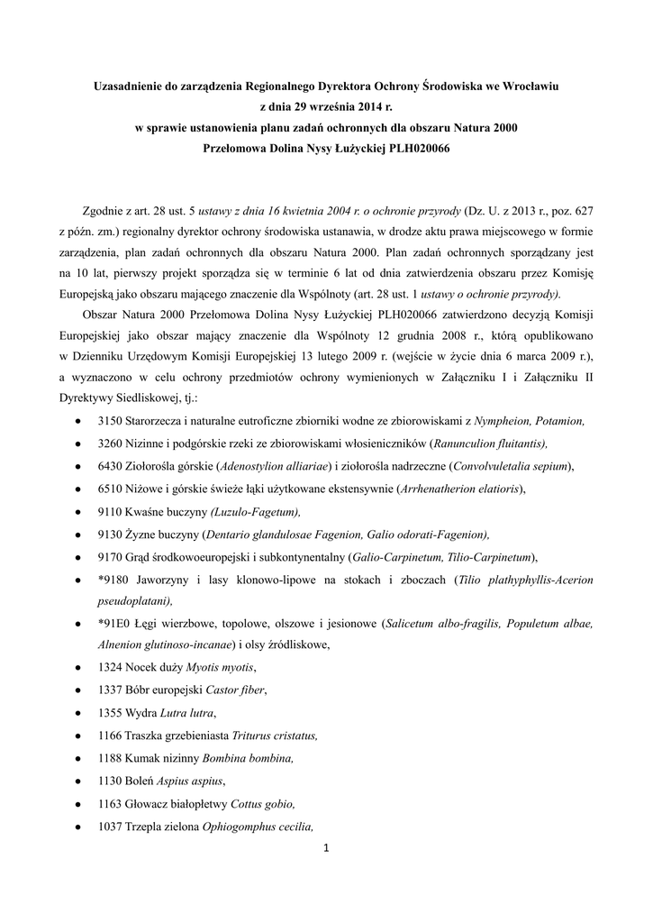 Uzasadnienie do zarządzenia Regionalnego Dyrektora Ochrony Środowiska we Wrocławiu z dnia 29 września 2014 r. w sprawie ustanowienia planu zadań ochronnych dla obszaru Natura 2000 Przełomowa Dolina Nysy Łużyckiej PLH020066 Zgodnie z art. 28 ust. 5 ustawy z dnia 16 kwietnia 2004 r. o ochronie przyrody (Dz. U. z 2013 r., poz. 627 z późn. zm.) regionalny dyrektor ochrony środowiska ustanawia, w drodze aktu prawa miejscowego w formie zarządzenia, plan zadań ochronnych dla obszaru Natura 2000. Plan zadań ochronnych sporządzany jest na 10 lat, pierwszy projekt sporządza się w terminie 6 lat od dnia zatwierdzenia obszaru przez Komisję Europejską jako obszaru mającego znaczenie dla Wspólnoty (art. 28 ust. 1 ustawy o ochronie przyrody). Obszar Natura 2000 Przełomowa Dolina Nysy Łużyckiej PLH020066 zatwierdzono decyzją Komisji Europejskiej jako obszar mający znaczenie dla Wspólnoty 12 grudnia 2008 r., którą opublikowano w Dzienniku Urzędowym Komisji Europejskiej 13 lutego 2009 r. (wejście w życie dnia 6 marca 2009 r.), a wyznaczono w celu ochrony przedmiotów ochrony wymienionych w Załączniku I i Załączniku II Dyrektywy Siedliskowej, tj.: 3150 Starorzecza i naturalne eutroficzne zbiorniki wodne ze zbiorowiskami z Nympheion, Potamion, 3260 Nizinne i podgórskie rzeki ze zbiorowiskami włosieniczników (Ranunculion fluitantis), 6430 Ziołorośla górskie (Adenostylion alliariae) i ziołorośla nadrzeczne (Convolvuletalia sepium), 6510 Niżowe i górskie świeże łąki użytkowane ekstensywnie (Arrhenatherion elatioris), 9110 Kwaśne buczyny (Luzulo-Fagetum), 9130 Żyzne buczyny (Dentario glandulosae Fagenion, Galio odorati-Fagenion), 9170 Grąd środkowoeuropejski i subkontynentalny (Galio-Carpinetum, Tilio-Carpinetum), *9180 Jaworzyny i lasy klonowo-lipowe na stokach i zboczach (Tilio plathyphyllis-Acerion pseudoplatani), *91E0 Łęgi wierzbowe, topolowe, olszowe i jesionowe (Salicetum albo-fragilis, Populetum albae, Alnenion glutinoso-incanae) i olsy źródliskowe, 1324 Nocek duży Myotis myotis, 1337 Bóbr europejski Castor fiber, 1355 Wydra Lutra lutra, 1166 Traszka grzebieniasta Triturus cristatus, 1188 Kumak nizinny Bombina bombina, 1130 Boleń Aspius aspius, 1163 Głowacz białopłetwy Cottus gobio, 1037 Trzepla zielona Ophiogomphus cecilia, 1 6177 Modraszek telejus Maculinea (Phengaris) teleius, 1060 Czerwończyk nieparek Lycaena dispar, 6179 Modraszek nausitous Maculinea (Phengaris) nausithous. Projekt planu zadań ochronnych dla obszaru mającego znaczenie dla Wspólnoty Przełomowa Dolina Nysy Łużyckiej PLH020066 (zwanego dalej Obszarem) został sporządzony z uwzględnieniem wymagań określonych w art. 28 ust. 10 ustawy o ochronie przyrody (Dz. U. z 2013 r., poz. 627 z późn. zm.) oraz zgodnie z zapisami rozporządzenia Ministra Środowiska z dnia 17 lutego 2010 roku w sprawie sporządzania projektu planu zadań ochronnych dla obszaru Natura 2000 (Dz. U. Nr 34, poz. 186 z późn. zm.). Założeniem do opracowania projektu planu zadań ochronnych dla Obszaru jest utrzymanie lub odtworzenie właściwego stanu przedmiotów ochrony, który to obowiązek wynika z art. 6 (1) Dyrektywy Siedliskowej (dyrektywa Rady 92/43/EWG z dnia 21 maja 1992 r. w sprawie ochrony siedlisk przyrodniczych oraz dzikiej fauny i flory – Dz.U.UE.L.92.206.7, Dz.U.UE-sp.15-2-102 z późn. zm.). Prace nad projektem planu zadań ochronnych dla Obszaru rozpoczęły się w marcu 2012 roku w ramach realizacji projektu POIS.05.03.00-00-186/09 „Opracowanie planów zadań ochronnych dla obszarów Natura 2000 na obszarze Polski”, współfinansowanego ze środków Programu Operacyjnego Infrastruktura i Środowisko w ramach działania 5.3 priorytetu V. Przedmiotowy projekt planu zadań ochronnych zawiera wszystkie niezbędne elementy wynikające z zapisów ww. ustawy o ochronie przyrody i ww. rozporządzenia w sprawie sporządzania projektu planu zadań ochronnych dla obszaru Natura 2000. Obszar mający znaczenia dla Wspólnoty Przełomowa Dolina Nysy Łużyckiej PLH020066 położony jest w dolinie rzeki Nysa Łużycka, na terenie powiatu zgorzeleckiego, w gminach: Miasto i Gmina Bogatynia, Gmina wiejska Zgorzelec, Miasto Zgorzelec. Obszar obejmuje silnie zróżnicowany krajobraz doliny rzecznej, od partii przełomowych między Trzcińcem a Posadą, po łagodnie płynący ciek obszaru podgórskiego, z mozaikowym układem siedlisk i wieloma cennymi gatunkami biotopów nadrzecznych. Częste wylewy Nysy powodują dobry stan zachowania towarzyszących jej siedlisk. Na skarpach pradoliny i na odcinku przełomowym wykształcają się zbiorowiska leśne, zajmujące łącznie około 35% powierzchni obszaru. Na przełomowym odcinku między Trzcińcem i Bratkowem znajdują się najcenniejsze kompleksy leśne grądów oraz buczyn, miejscami łęgów i lasów zboczowych o charakterze podgórskim. Bardzo często zespoły grądów schodzą do samego koryta rzecznego. Kompleksy grądów i łęgów są dobrze zachowane. W okolicy miejscowości Posada grądy zostały objęte ochroną rezerwatową. Występują tu ponadto rozległe obszary łąk świeżych, wilgotnych i zmiennowilgotnych, szuwarów, ziołorośli oraz gruntów ornych. Teren w większości objęty jest ekstensywną gospodarką rolną. Licznie występują tu starorzecza połączone systemami rowów oraz oczka wodne, a także sztuczne zbiorniki będące miejscem bytowania i rozrodu płazów. 2 W trakcie prac terenowych zweryfikowano listę przedmiotów ochrony w obszarze. W wyniku prac inwentaryzacyjnych stwierdzono, iż powierzchnia siedliska 6410 zmiennowilgotne łąki trzęślicowe (Molinion), znajdującego się w Standardowym Formularzu Danych, zwanym dalej „SDF” obszaru z oceną reprezentatywności D, jest około czterokrotnie większa od dotychczasowo podawanej – z tego względu siedlisko uznano za przedmiot ochrony obszaru. Ponadto w trakcie badań terenowych w 2012 roku nie potwierdzono występowania w obszarze gatunków 113