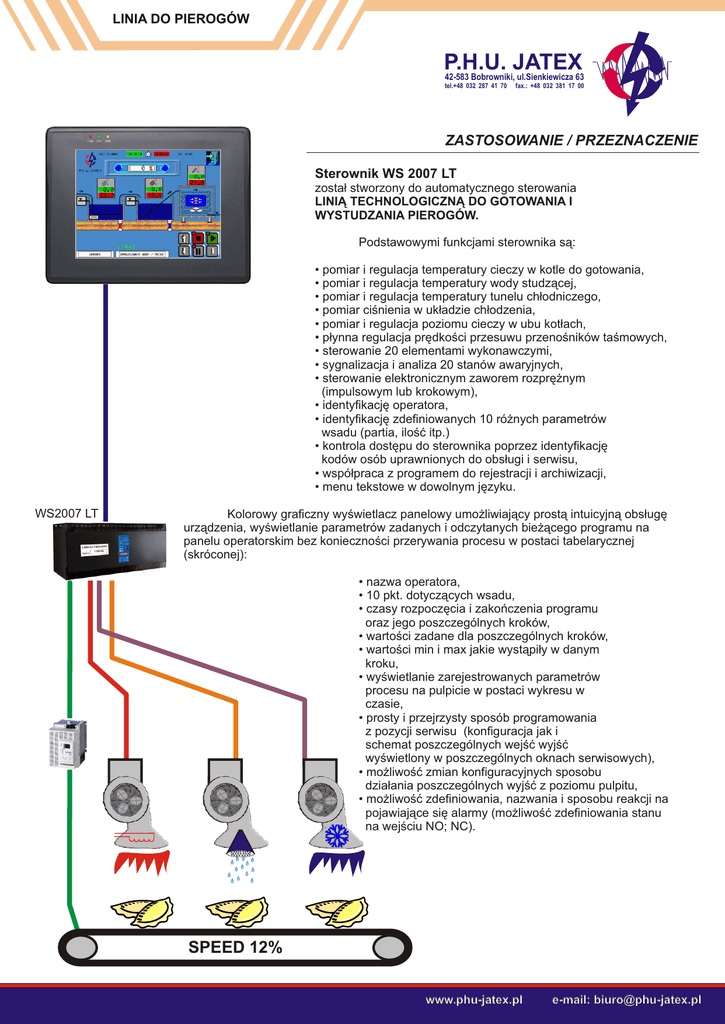 LINIA DO PIEROGÓW P.H.U. JATEX 42-583 Bobrowniki, ul.Sienkiewicza 63 tel.+48 032 287 41 70 fax.: +48 032 381 17 00 ZASTOSOWANIE / PRZEZNACZENIE Sterownik WS 2007 LT zosta³ stworzony do automatycznego sterowania LINI¥ TECHNOLOGICZN¥ DO GOTOWANIA I WYSTUDZANIA PIEROGÓW. Podstawowymi funkcjami sterownika s¹: • pomiar i regulacja temperatury cieczy w kotle do gotowania, • pomiar i regulacja temperatury wody studz¹cej, • pomiar i regulacja temperatury tunelu ch³odniczego, • pomiar ciœnienia w uk³adzie ch³odzenia, • pomiar i regulacja poziomu cieczy w ubu kot³ach, • p³ynna regulacja prêdkoœci przesuwu przenoœników taœmowych, • sterowanie 20 elementami wykonawczymi, • sygnalizacja i analiza 20 stanów awaryjnych, • sterowanie elektronicznym zaworem rozprê¿nym (impulsowym lub krokowym), • identyfikacjê operatora, • identyfikacjê zdefiniowanych 10 ró¿nych parametrów wsadu (partia, iloœæ itp.) • kontrola dostêpu do sterownika poprzez identyfikacjê kodów osób uprawnionych do obs³ugi i serwisu, • wspó³praca z programem do rejestracji i archiwizacji, • menu tekstowe w dowolnym jêzyku. WS2007 LT Kolorowy graficzny wyœwietlacz panelowy umo¿liwiaj¹cy prost¹ intuicyjn¹ obs³ugê urz¹dzenia, wyœwietlanie parametrów zadanych i odczytanych bie¿¹cego programu na panelu operatorskim bez koniecznoœci przerywania procesu w postaci tabelarycznej (skróconej): • nazwa operatora, • 10 pkt. dotycz¹cych wsadu, • czasy rozpoczêcia i zakoñczenia programu oraz jego poszczególnych kroków, • wartoœci zadane dla poszczególnych kroków, • wartoœci min i max jakie wyst¹pi³y w danym kroku, • wyœwietlanie zarejestrowanych parametrów procesu na pulpicie w postaci wykresu w czasie, • prosty i przejrzysty sposób programowania z pozycji serwisu (konfiguracja jak i schemat poszczególnych wejœæ wyjœæ wyœwietlony w poszczególnych oknach serwisowych), • mo¿liwoœæ zmian konfiguracyjnych sposobu dzia³ania poszczególnych wyjœæ z poziomu pulpitu, • mo¿liwoœæ zdefiniowania, nazwania i sposobu reakcji na pojawiaj¹ce siê alarmy (mo¿liwoœæ zdefiniowania stanu na wejœciu NO; NC). SPEED 12% 13 www.phu-jatex.pl e-mail: [email protected] LINIA DO PIEROGÓW P.H.U. JATEX 42-583 Bobrowniki, ul.Sienkiewicza 63 tel.+48 032 287 41 70 fax.: +48 032 381 17 00 DANE TECHNICZNE / specyfikacja komponentów Ws-508TV Panel operatorski LCD Zasilanie: 24± 5% VDC Temperatura pracy: 0-45°C/90%RH Wyœwietlacz: 8,5”; 256 kolorów Stopieñ ochrony: front IP65 Wyjœcia/Wyjœcia: PRINTER, PC[RS-232], PLC[RS-485], PLC[RS-232] Obudowa: do monta¿u zatablicowego IP65 WYMIARY: str. 21 rys.2 Ws-32MC Modu³ procesora/zasilacza Zasilanie: 100~240 VAC Wyjœcia: 24 VDC (zasilanie pozosta³ych modu³ów) 12x AC/DC (przekaŸnikowe zwierne Imax=2A Umax=250V) Wejœcia: 20x 24 VDC 120 Khz (wejœcia alarmowe,programowalne 0/24V) Komunikacja: 1xRS232 (magistrala do komunikacji z pozosta³ymi modu³ami) Obudowa: do monta¿u na szynê TS35(DIN) WYMIARY: str. 22 rys.4 Ws-8EY Modu³ wyjœæ przekaŸnikowych Zasilanie: 24 VDC (z zasilacza modu³u Ws-32MC) Wyjœcia: 8x AC/DC (przekaŸnikowe zwierne Imax=2A Umax=250V) Komunikacja: 1xRS232 (magistrala do komunikacji z pozosta³ymi modu³ami) Obudowa: do monta¿u na szynê TS35(DIN) WYMIARY: str. 22 rys.5 Ws-RTD6 Modu³ wejœæ analogowych, rezystancyjnych Zasilanie: 24 VDC (z zasilacza modu³u Ws-32MC) Wejœcia: 6x Pt100 (-200~850°C; rozdzielczoœæ 0,1°C; tolerancja~1% Komunikacja: 1xRS232 (magistrala do komunikacji z pozosta³ymi modu³ami) Obudowa: do monta¿u na szynê TS35(DIN) WYMIARY: str. 22 rys.5 Ws-4A2D Modu³ wejœæ analogowych, napiêciowo-pr¹dowych Zasilanie: 24 VDC (z zasilacza modu³u Ws-32MC) Wejœcia: 4x programowalne 0~10V lub 4~20mA Wyjœcia: 2x programowalne 0~10V lub 4~20mA Komunikacja: 1xRS232 (magistrala do komunikacji z pozosta³ymi modu³ami) Obudowa: do monta¿u na szynê TS35(DIN) WYMIARY: str. 22 rys.5 Ws-CBE Modu³ karty sieciowej -Do monta¿u w z³¹czu PIN obudowy procesora Zasilanie: z zasilacza modu³u Ws-32MC Wyjœcia: 1x Ethernet Ws-SPD24301 Modu³ zasilacza panelu operatorskiego Zasilanie: 100-240VAC 47-63Hz 800mA Wyjœcia: 24VDC 1.25A Obudowa: do monta¿u na szynê TS35(DIN) WYMIARY: str. 22 rys.7 Ws-232PO-9M-400 Kabel do transmisji procesor/panel operatorski Rs232- 9pin D-sub connector D³ugoœæ: standartowo 150, 180, 400 cm Ws-CD1 P³yta z oprogramowaniem -Program do podgl¹du, rejestracji i archiwizacji parametrów procesu technologicznego i zdarzeñ alarmowych -Instrukcja obs³ugi -Dokumentacja techniczna www.phu-jatex.pl e-mail: [email protected]