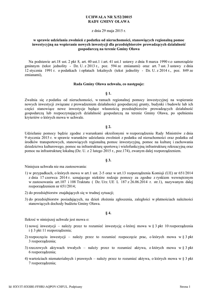 UCHWAŁA NR X/52/20015 RADY GMINY OŁAWA z dnia 29 maja 2015 r. w sprawie udzielania zwolnień z podatku od nieruchomości, stanowiących regionalną pomoc inwestycyjną na wspieranie nowych inwestycji dla przedsiębiorców prowadzących działalność gospodarczą na terenie Gminy Oława Na podstawie art.18 ust. 2 pkt 8, art. 40 ust.1 i art. 41 ust.1 ustawy z dnia 8 marca 1990 r.o samorządzie gminnym (tekst jednolity - Dz. U. z 2013 r., poz. 594 ze zmianami) oraz art. 7 ust. 3 ustawy z dnia 12 stycznia 1991 r. o podatkach i opłatach lokalnych (tekst jednolity - Dz. U. z 2014 r., poz. 849 ze zmianami), Rada Gminy Oława uchwala, co następuje: § 1. Zwalnia się z podatku od nieruchomości, w ramach regionalnej pomocy inwestycyjnej na wspieranie nowych inwestycji związane z prowadzeniem działalności gospodarczej grunty, budynki i budowle lub ich części stanowiące nowe inwestycje będące własnością przedsiębiorców prowadzących działalność gospodarczą lub rozpoczynających działalność gospodarczą na terenie Gminy Oława, po spełnieniu kryteriów o których mowa w uchwale. § 2. Udzielanie pomocy będzie zgodne z warunkami określonymi w rozporządzeniu Rady Ministrów z dnia 9 stycznia 2015 r. w sprawie warunków udzielania zwolnień z podatku od nieruchomości oraz podatku od środków transportowych, stanowiących regionalną pomoc inwestycyjną, pomoc na kulturę i zachowania dziedzictwa kulturowego, pomoc na infrastrukturę sportową i wielofunkcyjną infrastrukturę rekreacyjną oraz pomoc na infrastrukturę lokalną (Dz. U. z 2 lutego 2015 r., poz.174), zwanym dalej rozporządzeniem. § 3. Niniejsza uchwała nie ma zastosowania: 1) w przypadkach, o których mowa w art.1 ust. 2-5 oraz w art.13 rozporządzenia Komisji (UE) nr 651/2014 z dnia 17 czerwca 2014 r. uznającego niektóre rodzaje pomocy za zgodne z rynkiem wewnętrznym w zastosowaniu art.107 i 108 Traktatu ( Dz. Urz. UE L 187 z 26.06.2014 r. str.1), nazywanym dalej rozporządzeniem nr 651/2014; 2) do przedsiębiorstw znajdujących się w trudnej sytuacji; 3) do przedsiębiorstw posiadających, na dzień złożenia zgłoszenia, zaległości w płatnościach należności stanowiących dochody budżetu Gminy Oława. § 4. Ilekroć w niniejszej uchwale jest mowa o: 1) nowej inwestycji – należy przez to rozumieć inwestycję o której mowa w § 3 pkt 10 rozporządzenia i § 3 pkt 11 rozporządzenia; 2) rozpoczęciu inwestycji – należy przez to rozumieć rozpoczęcie prac, o których mowa w § 3 pkt 3 rozporządzenia; 3) rzeczowych aktywach trwałych – należy przez to rozumieć aktywa, o których mowa w § 3 pkt 6 rozporządzenia; 4) wartościach niematerialnych i prawnych – należy przez to rozumieć aktywa, o których mowa w § 3 pkt 7 rozporządzenia; Id: HXVJT-HXSBE-FFHRJ-AQPOV-CHFUL. Podpisany Strona 1 5) beneficjencie pomocy – należy przez to rozumieć podmiot prowadzący działalność gospodarczą bez względu na formę organizacyjno – prawną oraz sposób finansowania, który otrzymał pomoc publiczną; 6) dużych przedsiębiorstwach – należy przez to rozumieć przedsiębiorstwa nie spełniające kryteriów dla małych lub średnich przedsiębiorstw, o których mowa w załączniku I do rozporządzenia nr 651/2014; 7) przedsiębiorstwie znajdującym się w trudnej sytuacji – należy przez to rozumieć przedsiębiorstwo, wobec którego zachodzi co najmniej jedna z okoliczności, o których mowa w art.2 pkt 18 rozporządzenia nr 651/2014; 8) pomocy – należy przez to rozumieć każdy środek spełniający wszystkie kryteria, o których mowa w art.107 ust.1 Traktatu o funkcjonowaniu Unii Europejskiej ( Dz.U. UE 2012, C 326 z 26.10.2012 r.), zwanego dalej Traktatem; 9) udziale własnym – należy przez to rozumieć nakłady inwestycyjne pochodzące ze środków własnych lub zewnętrznych źródeł finansowania, nie pochodzące ze wsparcia ze środków publicznych; 10) intensywności pomocy – należy przez to rozumieć kwotę pomocy brutto, o której mowa w § 3 pkt 4 rozporządzenia, wyrażoną jako odsetek kosztów kwalifikowanych, przed potrąceniem podatku lub innych opłat; 11) zgłoszeniu – należy przez to rozumieć pisemne zgłoszenie zamiaru korzystania z regionalnej pomocy inwestycyjnej przeznaczonej dla przedsiębiorców prowadzących działalność gospodarczą na terenie Gminy Oława. § 5. 1. Ustala się ogólne warunki dopuszczalności pomocy na podstawie niniejszej uchwały: 1) złożenie do Wójta Gminy Oława zgłoszenia zamiaru korzystania z regionalnej pomocy inwestycyjnej, przy czym zgłoszenie musi być złożone przed rozpoczęciem prac związanych z nową inwestycją oraz zawierać co najmniej informacje o których mowa w ust. 2; 2) złożenie wymaganych informacji zgodnie z przepisami rozporządzenia Rady Ministrów z dnia 29 marca 2010 r w sprawie zakresu informacji przedstawianych przez podmiot ubiegający się o pomoc inną niż de minimis lub pomoc de minimis w rolnictwie lub rybołówstwie ( Dz. U. Nr 53, poz. 312 ze zmianami); 3) poniesienie nakładów na nową inwestycję po dokonaniu zgłoszenia; 4) utrzymanie nowej inwestycji na terenie Gminy Oława przez co najmniej 5 lat, lub 3 lat w przypadku małych i średnich przedsiębiorstw, licząc od końca roku kalendarzowego w którym zakończono korzystanie ze zwolnienia; 5) wniesienie udziału własnego przedsiębiorcy związanego z nową inwestycją, wynoszącego co najmniej 25 % kosztów kwalifikujących się do objęcia pomocą. 2. Zgłoszenie, o którym mowa w ust.1 pkt 1 powinno zawierać: 1) nazwę i siedzibę przedsiębiorcy; 2) informację o jego wielkości ( zgodnie z postanowieniem załącznika nr I do rozporządzenia nr 651/2014); 3) opis projektu; 4) termin rozpoczęcia i zakończenia nowej inwestycji; 5) lokalizację nowej inwestycji; 6) wykaz planowanych kosztów projektu; 7) rodzaj prowadzonej działalności. § 6. 1. Zwolnienie, o którym mowa w § 1 dotyczy gruntów, budynków or