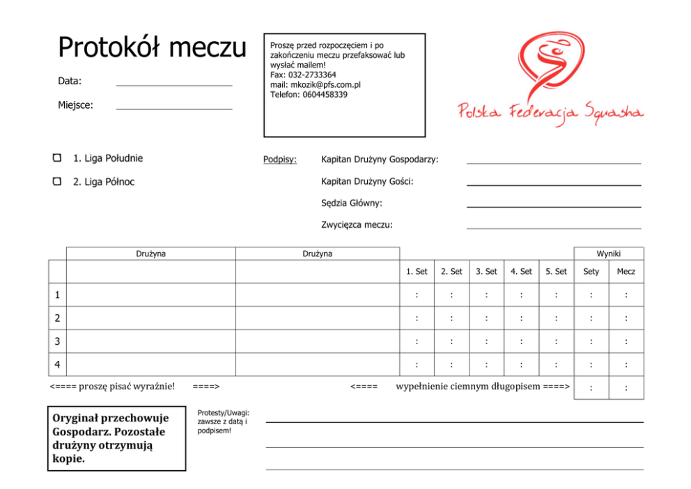 Protokół meczu Proszę przed rozpoczęciem i po zakończeniu meczu przefaksować lub wysłać mailem! Fax: 032-2733364 mail: [email protected] Telefon: 0604458339 Data: Miejsce: 1. Liga Południe Podpisy: 2. Liga Północ Kapitan Drużyny Gospodarzy: Kapitan Drużyny Gości: Sędzia Główny: Zwycięzca meczu: Drużyna Drużyna Wyniki 1. Set 2. Set 3. Set 4. Set 5. Set Sety Mecz 1 : : : : : : : 2 : : : : : : : 3 : : : : : : : 4 : : : : : : : : : <==== proszę pisać wyraźnie! Oryginał przechowuje Gospodarz. Pozostałe drużyny otrzymują kopie. ====> <==== Protesty/Uwagi: zawsze z datą i podpisem! wypełnienie ciemnym długopisem ====>