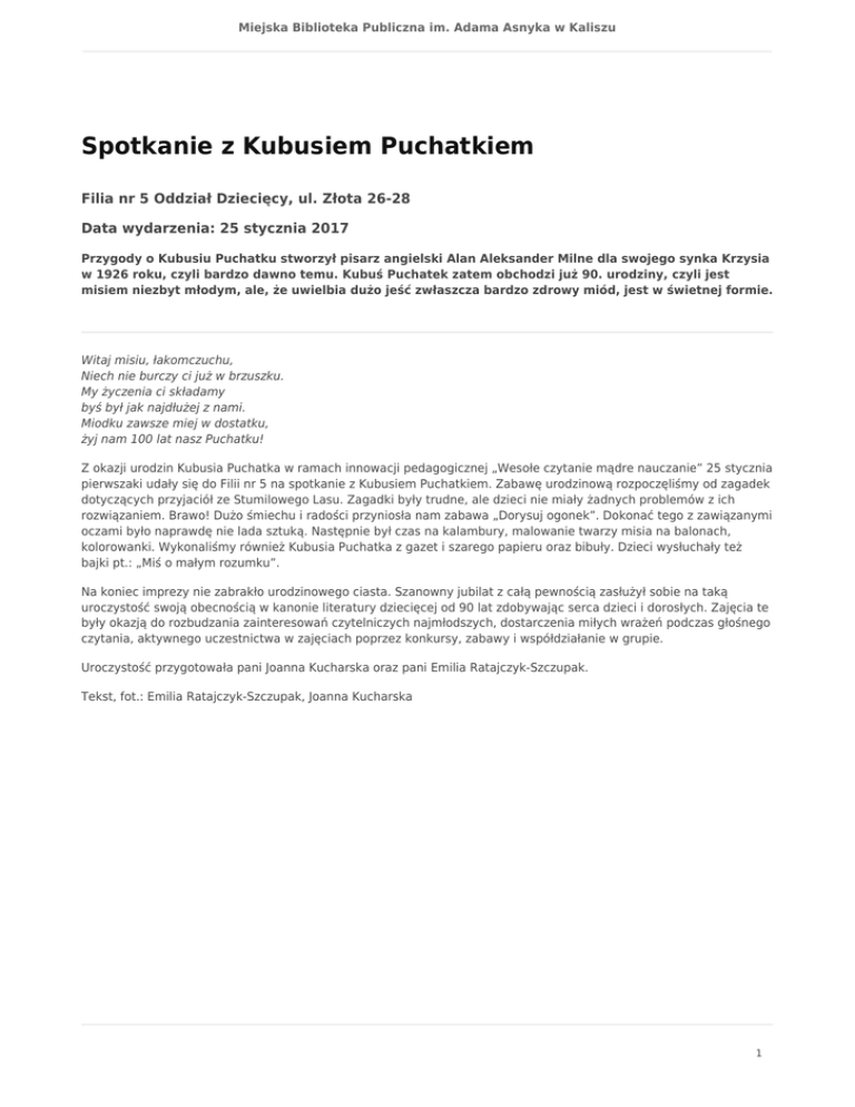 Miejska Biblioteka Publiczna im. Adama Asnyka w Kaliszu Spotkanie z Kubusiem Puchatkiem Filia nr 5 Oddział Dziecięcy, ul. Złota 26-28 Data wydarzenia: 25 stycznia 2017 Przygody o Kubusiu Puchatku stworzył pisarz angielski Alan Aleksander Milne dla swojego synka Krzysia w 1926 roku, czyli bardzo dawno temu. Kubuś Puchatek zatem obchodzi już 90. urodziny, czyli jest misiem niezbyt młodym, ale, że uwielbia dużo jeść zwłaszcza bardzo zdrowy miód, jest w świetnej formie. Witaj misiu, łakomczuchu, Niech nie burczy ci już w brzuszku. My życzenia ci składamy byś był jak najdłużej z nami. Miodku zawsze miej w dostatku, żyj nam 100 lat nasz Puchatku! Z okazji urodzin Kubusia Puchatka w ramach innowacji pedagogicznej „Wesołe czytanie mądre nauczanie” 25 stycznia pierwszaki udały się do Filii nr 5 na spotkanie z Kubusiem Puchatkiem. Zabawę urodzinową rozpoczęliśmy od zagadek dotyczących przyjaciół ze Stumilowego Lasu. Zagadki były trudne, ale dzieci nie miały żadnych problemów z ich rozwiązaniem. Brawo! Dużo śmiechu i radości przyniosła nam zabawa „Dorysuj ogonek”. Dokonać tego z zawiązanymi oczami było naprawdę nie lada sztuką. Następnie był czas na kalambury, malowanie twarzy misia na balonach, kolorowanki. Wykonaliśmy również Kubusia Puchatka z gazet i szarego papieru oraz bibuły. Dzieci wysłuchały też bajki pt.: „Miś o małym rozumku”. Na koniec imprezy nie zabrakło urodzinowego ciasta. Szanowny jubilat z całą pewnością zasłużył sobie na taką uroczystość swoją obecnością w kanonie literatury dziecięcej od 90 lat zdobywając serca dzieci i dorosłych. Zajęcia te były okazją do rozbudzania zainteresowań czytelniczych najmłodszych, dostarczenia miłych wrażeń podczas głośnego czytania, aktywnego uczestnictwa w zajęciach poprzez konkursy, zabawy i współdziałanie w grupie. Uroczystość przygotowała pani Joanna Kucharska oraz pani Emilia Ratajczyk-Szczupak. Tekst, fot.: Emilia Ratajczyk-Szczupak, Joanna Kucharska 1
