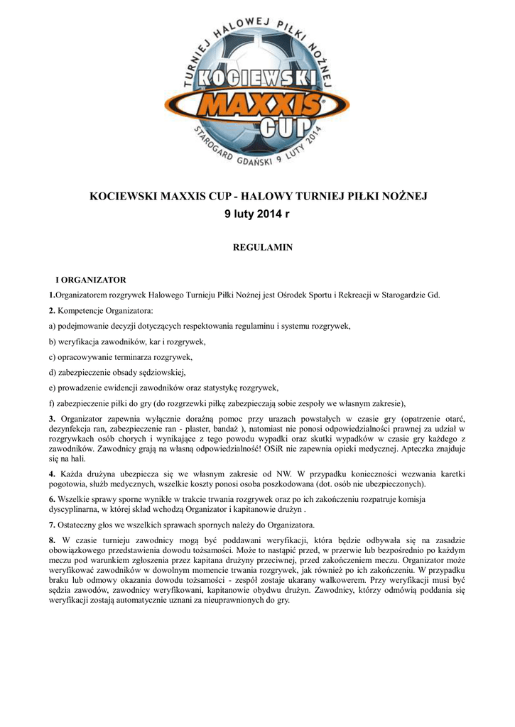 KOCIEWSKI MAXXIS CUP - HALOWY TURNIEJ PIŁKI NOŻNEJ 9 luty 2014 r REGULAMIN I ORGANIZATOR 1.Organizatorem rozgrywek Halowego Turnieju Piłki Nożnej jest Ośrodek Sportu i Rekreacji w Starogardzie Gd. 2. Kompetencje Organizatora: a) podejmowanie decyzji dotyczących respektowania regulaminu i systemu rozgrywek, b) weryfikacja zawodników, kar i rozgrywek, c) opracowywanie terminarza rozgrywek, d) zabezpieczenie obsady sędziowskiej, e) prowadzenie ewidencji zawodników oraz statystykę rozgrywek, f) zabezpieczenie piłki do gry (do rozgrzewki piłkę zabezpieczają sobie zespoły we własnym zakresie), 3. Organizator zapewnia wyłącznie doraźną pomoc przy urazach powstałych w czasie gry (opatrzenie otarć, dezynfekcja ran, zabezpieczenie ran - plaster, bandaż ), natomiast nie ponosi odpowiedzialności prawnej za udział w rozgrywkach osób chorych i wynikające z tego powodu wypadki oraz skutki wypadków w czasie gry każdego z zawodników. Zawodnicy grają na własną odpowiedzialność! OSiR nie zapewnia opieki medycznej. Apteczka znajduje się na hali. 4. Każda drużyna ubezpiecza się we własnym zakresie od NW. W przypadku konieczności wezwania karetki pogotowia, służb medycznych, wszelkie koszty ponosi osoba poszkodowana (dot. osób nie ubezpieczonych). 6. Wszelkie sprawy sporne wynikłe w trakcie trwania rozgrywek oraz po ich zakończeniu rozpatruje komisja dyscyplinarna, w której skład wchodzą Organizator i kapitanowie drużyn . 7. Ostateczny głos we wszelkich sprawach spornych należy do Organizatora. 8. W czasie turnieju zawodnicy mogą być poddawani weryfikacji, która będzie odbywała się na zasadzie obowiązkowego przedstawienia dowodu tożsamości. Może to nastąpić przed, w przerwie lub bezpośrednio po każdym meczu pod warunkiem zgłoszenia przez kapitana drużyny przeciwnej, przed zakończeniem meczu. Organizator może weryfikować zawodników w dowolnym momencie trwania rozgrywek, jak również po ich zakończeniu. W przypadku braku lub odmowy okazania dowodu tożsamości - zespół zostaje ukarany walkowerem. Przy weryfikacji musi być sędzia zawodów, zawodnicy weryfikowani, kapitanowie obydwu drużyn. Zawodnicy, którzy odmówią poddania się weryfikacji zostają automatycznie uznani za nieuprawnionych do gry. II SPOSÓB PRZEPROWADZENIA ROZGRYWEK 1. Zawodnik z drużyny A nie może grać w drużynie B. 2.Czas trwania spotkania wynosi: 1x16 minut. Czas gry wznawia i kończy gwizdek sędziego. Ostatnia minuta spotkania czas zatrzymywany na gwizdek sędziego. 3. Na ławce rezerwowych znajdować się mogą tylko i wyłącznie zawodnicy zgłoszeni w zespole grającym. 4. Sędzia Do prowadzenia zawodów musi być wyznaczony sędzia (2 sędziów w polu i 1 przy stoliku), który odpowiada za obiektywne prowadzenie zawodów. Uprawnienia sędziego i posługiwanie się prawem nadanym mu przez Przepisy Gry, rozpoczynają się z chwilą wejścia na obiekt gdzie rozgrywane będą zawody. Rozstrzygnięciom sędziowskim podlegają również przewinienia dokonywane podczas chwilowej przerwy w grze oraz gdy piłka jest poza grą. Zawodnik rezerwowy również podlega władzy i jurysdykcji sędziego. Ta sama sytuacja dotyczy wszystkich zawodników po zakończeniu spotkania, aż do momentu opuszczenia przez sędziego obiektu, na którym znajduje się boisko. Rozstrzygnięcia sędziego dotyczące faktów związanych z grą, jak również i wyniku meczu są ostateczne. W czasie spotkania sędzia nie może być zmieniony. Wyjątek stanowi niedyspozycja lub kontuzja sędziego, uniemożliwiająca mu kontynuowanie prowadzenia spotkania. Zawody dokończyć może jego następca, wyznaczony przez Organizatora bądź też tylko jeden sędzia. Sędzia ma prawo nie dopuścić zawodnika do gry wówczas, gdy zawodnik nie zachowuje się sportowo lub jest w stanie wskazującym na spożycie alkoholu. 5. Rozpoczęcie i wznowienie gry Z rozpoczęcia gry bramka nie może być zdobyta bezpośrednio. III ZAWODNICY 1. Zgłoszenia zawodników maks. 12 zawodników, W rozgrywkach mogą uczestniczyć zawodnicy, którzy ukończyli 18 lat. 2.Zawodnik zostaje dopuszczony do gry na podstawie złożonego i podpisanego własnoręcznie oświadczenia (lista zgłoszeniowa) w przedmiocie zapoznania się z niniejszym Regulaminem oraz przyjęciu do wiadomości uregulowań dotyczących odpowiedzialności organizatora jak i uczestników turnieju. 3. Każdy zawodnik, biorący udział w meczu HTPN ma obowiązek do posiadania przy sobie dokumentu tożsamości. Organizator ma prawo sprawdzić dokumenty tożsamości. 4. Drużyny zgłoszone do turnieju załatwiają we własnym zakresie sprawy związane z ubezpieczeniem zawodników. 5. Kierownik zespołu podpisuje oświadczenie o odpowiedzialności za szatnie (druk do pobrania u gospodarza hali) 6. Zespół który nie stawi się na mecz po upływie 5 min. od przewidzianego czasu rozpoczęcia rozgrywek otrzymuje walkower i przegrywa zgodnie z przepisami PZPN 0:5. 7. Stroje sportowe drużyna musi posiadać numery na koszulkach, jak i również obuwie z jasną podeszwą. 8. Kapitan drużyny musi posiadać na ramieniu widoczną opaskę, którą pobiera przed meczem przy stoliku sędziowskim. 9. W przypadku gdy podczas spotkania zespoły posiadają ten sam kolor koszulek, znaczniki ubiera zespół wymieniony w terminarzu jako gospodarz. 10. Ilość zawodników. Zespoły przystępują do gry w składzie pięcioosobowym (czterech zawodników + bramkarz). 11. Mecz nie może się rozpocząć, jeżeli którakolwiek z drużyn liczy mnie niż 3 zawodników, mecz należy zakończyć, jeśli w którejkolwiek z drużyn jest mniej niż 3 zawodników. 12. Wymiana bramkarza, każdy z zawodników rezerwowych może wymienić bramkarza bez informowania sędziów lub czekania na przerwę w grze – lotny bramkarz. Każdy zawodnik może zamienić się z bramkarzem, zawodnik zamieniający się z bramkarzem musi zrobić to podczas przerwy w grze i musi poinformować sędziów zanim zmiana