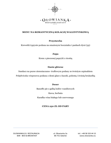 MENU NA ROMANTYCZNĄ KOLACJĘ WALENTYNKOWĄ Przystawka Krewetki tygrysie podana na smażonym boczniaku i paskach dyni (35) Zupa Krem z pieczonej papryki z ricottą Danie główne Sandacz na puree ziemniaczano- truflowym podany ze świeżym szpinakiem Polędwiczka wieprzowa podana z demi glace z kaczki, polentą i świeżą brukselką Deser Banoffe pie z gałką lodów waniliowych Kawa, herbata Karafka wina białego lub czerwonego CENA 250 ZŁ OD PARY OLOWIANKA.EU RESTAURACJA BAR BED & BREAKFAST ul. Ołowianka 3a 80-751 Gdańsk tel.: +48 58 333 44 15 www.olowianka.eu