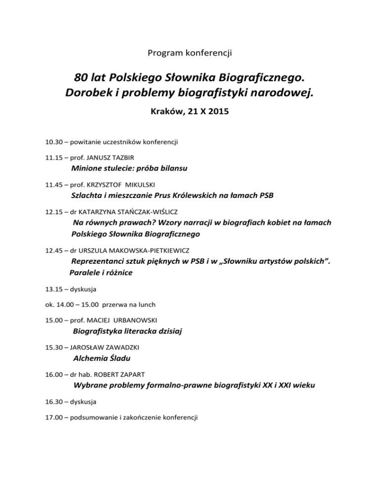Program konferencji 80 lat Polskiego Słownika Biograficznego. Dorobek i problemy biografistyki narodowej. Kraków, 21 X 2015 10.30 – powitanie uczestników konferencji 11.15 – prof. JANUSZ TAZBIR Minione stulecie: próba bilansu 11.45 – prof. KRZYSZTOF MIKULSKI Szlachta i mieszczanie Prus Królewskich na łamach PSB 12.15 – dr KATARZYNA STAŃCZAK-WIŚLICZ Na równych prawach? Wzory narracji w biografiach kobiet na łamach Polskiego Słownika Biograficznego 12.45 – dr URSZULA MAKOWSKA-PIETKIEWICZ Reprezentanci sztuk pięknych w PSB i w „Słowniku artystów polskich”. Paralele i różnice 13.15 – dyskusja ok. 14.00 – 15.00 przerwa na lunch 15.00 – prof. MACIEJ URBANOWSKI Biografistyka literacka dzisiaj 15.30 – JAROSŁAW ZAWADZKI Alchemia Śladu 16.00 – dr hab. ROBERT ZAPART Wybrane problemy formalno-prawne biografistyki XX i XXI wieku 16.30 – dyskusja 17.00 – podsumowanie i zakończenie konferencji