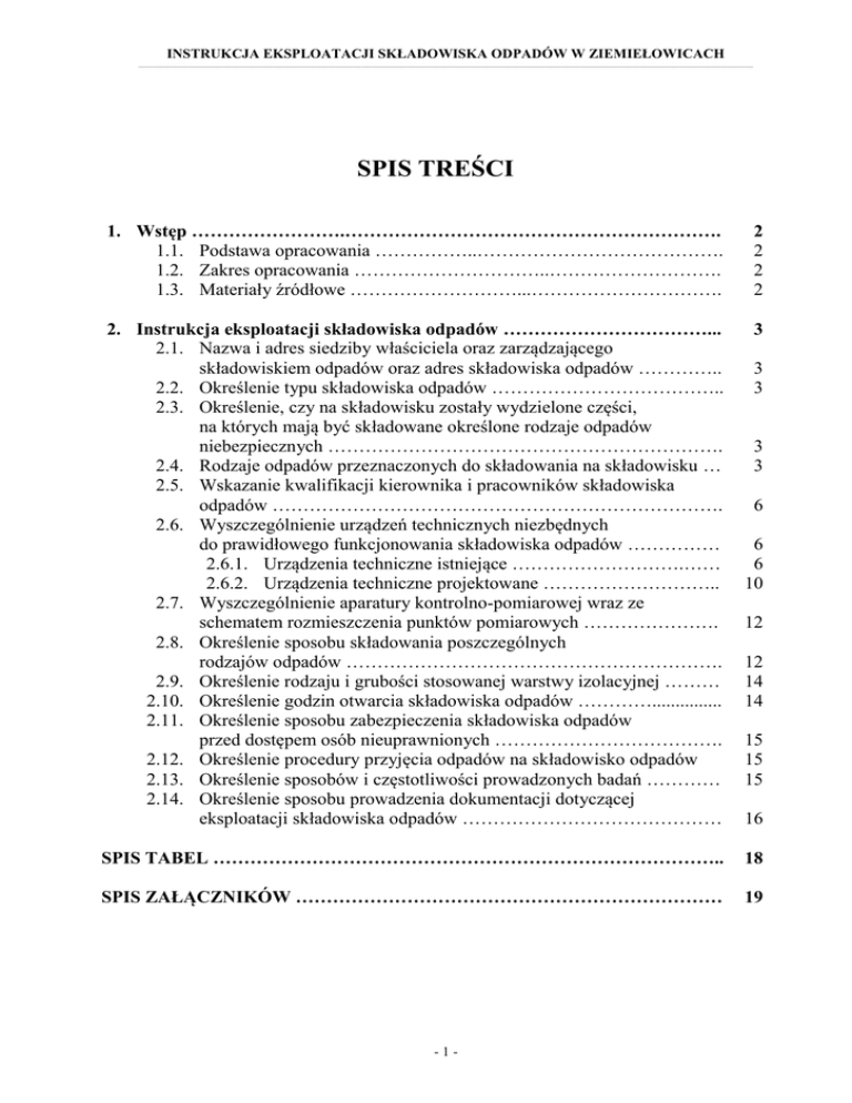 INSTRUKCJA EKSPLOATACJI SKŁADOWISKA ODPADÓW W ZIEMIEŁOWICACH _______________________________________________________________________________________________________________________________________________________________________________________________________________________ SPIS TREŚCI 1. Wstęp …………………….……………………………………………………. 1.1. Podstawa opracowania ……………..…………………………………. 1.2. Zakres opracowania …………………………..………………………. 1.3. Materiały źródłowe ………………………...…………………………. 2 2 2 2 2. Instrukcja eksploatacji składowiska odpadów ……………………………... 2.1. Nazwa i adres siedziby właściciela oraz zarządzającego składowiskiem odpadów oraz adres składowiska odpadów ………….. 2.2. Określenie typu składowiska odpadów ……………………………….. 2.3. Określenie, czy na składowisku zostały wydzielone części, na których mają być składowane określone rodzaje odpadów niebezpiecznych ………………………………………………………. 2.4. Rodzaje odpadów przeznaczonych do składowania na składowisku … 2.5. Wskazanie kwalifikacji kierownika i pracowników składowiska odpadów ………………………………………………………………. 2.6. Wyszczególnienie urządzeń technicznych niezbędnych do prawidłowego funkcjonowania składowiska odpadów …………… 2.6.1. Urządzenia techniczne istniejące ……………………….…… 2.6.2. Urządzenia techniczne projektowane ……………………….. 2.7. Wyszczególnienie aparatury kontrolno-pomiarowej wraz ze schematem rozmieszczenia punktów pomiarowych …………………. 2.8. Określenie sposobu składowania poszczególnych rodzajów odpadów ……………………………………………………. 2.9. Określenie rodzaju i grubości stosowanej warstwy izolacyjnej ……… 2.10. Określenie godzin otwarcia składowiska odpadów …………............... 2.11. Określenie sposobu zabezpieczenia składowiska odpadów przed dostępem osób nieuprawnionych ………………………………. 2.12. Określenie procedury przyjęcia odpadów na składowisko odpadów 2.13. Określenie sposobów i częstotliwości prowadzonych badań ………… 2.14. Określenie sposobu prowadzenia dokumentacji dotyczącej eksploatacji składowiska odpadów …………………………………… 3 6 6 10 SPIS TABEL ……………………………………………………………………….. 18 SPIS ZAŁĄCZNIKÓW …………………………………………………………… 19 -1- 3 3 3 3 6 12 12 14 14 15 15 15 16 INSTRUKCJA EKSPLOATACJI SKŁADOWISKA ODPADÓW W ZIEMIEŁOWICACH _______________________________________________________________________________________________________________________________________________________________________________________________________________________ 1. Wstęp. 1.1. Podstawa prawna opracowania. Podstawę prawną niniejszego opracowania stanowi ustawa z dnia 27 kwietnia 2001 r. o odpadach, która obliguje właściciela składowiska (zarządzającego składowiskiem) do uzyskania zatwierdzenia instrukcji jego eksploatacji. Ponadto podstawę prawną niniejszego opracowania stanowią w szczególności: rozporządzenie Ministra Środowiska z dnia 24 marca 2003 r. w sprawie szczegółowych wymagań dotyczących lokalizacji, budowy, eksploatacji i zamknięcia, jakim powinny odpowiadać poszczególne typy składowisk odpadów, rozporządzenie Ministra Środowiska z dnia 9 grudnia 2002 r. w sprawie zakresu, czasu, sposobu oraz warunków prowadzenia monitoringu składowisk odpadów, rozporządzenie Ministra Środowiska z dnia 27 września 2001 r. w sprawie katalogu odpadów, rozporządzenie Ministra Gospodarki i Pracy z dnia 7 września 2005 r. w sprawie kryteriów oraz procedur dopuszczania odpadów do składowania na składowisku odpadów danego typu, rozporządzenie Ministra Gospodarki z dnia 30 października 2002 r. w sprawie rodzajów odpadów, które mogą być składowane w sposób nieselektywny, rozporządzenie Ministra Środowiska z dnia 14 lutego 2006 r. w sprawie wzorów dokumentów stosowanych na potrzeby ewidencji odpadów. 1.2. Zakres opracowania. Opracowanie ustala zasady i przepisy dotyczące obsługi i eksploatacji składowiska odpadów innych niż niebezpieczne i obojętne w Ziemiełowicach dla: nowowybudowanej kwatery nr 2, zaprojektowanej kwatery nr 1. 1.3. Materiały źródłowe. Podstawowy materiał źródłowy opracowania stanowiła dokumentacja techniczna rozbudowy składowiska odpadów innych niż niebezpieczne i obojętne w Ziemiełowicach, opracowana przez Zakład Usługowo-Konsultingowy „Budopol P.B.” w Namysłowie w październiku 2004 r. -2- INSTRUKCJA EKSPLOATACJI SKŁADOWISKA ODPADÓW W ZIEMIEŁOWICACH _______________________________________________________________________________________________________________________________________________________________________________________________________________________ 2. Instrukcja eksploatacji składowiska odpadów. 2.1. Nazwa i adres siedziby właściciela oraz zarządzającego składowiskiem odpadów oraz adres składowiska odpadów. Nazwa i adres właściciela składowiska: Gmina Namysłów, ul. Stanisława Dubois 3, 46-100 Namysłów telefon: (077) 419 03 00, faks: (077) 410 03 34 e-mail: [email protected] www.namyslow.eu Nazwa i adres zarządzającego składowiskiem: Zakład Wodociągów i Usług Komunalnych „EKOWOD” Spółka z o.o. ul. Mariańska 2, 46-100 Namysłów telefon: (077) 410 14 82, 410 52 22, 410 09 62, 410 13 35 faks: (077) 410 14 82 e-mail: [email protected] www.ekowod.net Adres składowiska odpadów: Składowisko odpadów Ziemiełowice, 46-100 Namysłów telefon: (077) 410 40 11 2.2. Określenie typu składowiska odpadów. Składowisko odpadó
