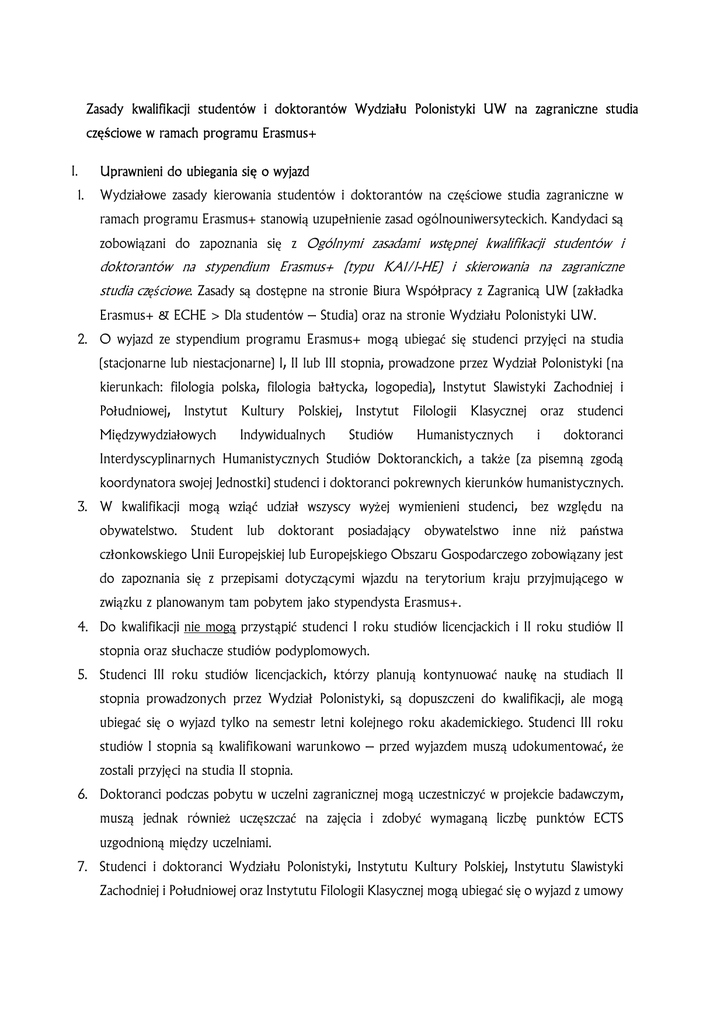 Zasady kwalifikacji studentów i doktorantów Wydziału Polonistyki UW na zagraniczne studia częściowe w ramach programu Erasmus+ I. 1. Uprawnieni do ubiegania się o wyjazd Wydziałowe zasady kierowania studentów i doktorantów na częściowe studia zagraniczne w ramach programu Erasmus+ stanowią uzupełnienie zasad ogólnouniwersyteckich. Kandydaci są zobowiązani do zapoznania się z Ogólnymi zasadami wstępnej kwalifikacji studentów i doktorantów na stypendium Erasmus+ (typu KA1/1-HE) i skierowania na zagraniczne studia częściowe. Zasady są dostępne na stronie Biura Współpracy z Zagranicą UW (zakładka Erasmus+ & ECHE > Dla studentów – Studia) oraz na stronie Wydziału Polonistyki UW. 2. O wyjazd ze stypendium programu Erasmus+ mogą ubiegać się studenci przyjęci na studia (stacjonarne lub niestacjonarne) I, II lub III stopnia, prowadzone przez Wydział Polonistyki (na kierunkach: filologia polska, filologia bałtycka, logopedia), Instytut Slawistyki Zachodniej i Południowej, Instytut Międzywydziałowych Kultury Polskiej, Indywidualnych Instytut Studiów Filologii Klasycznej Humanistycznych oraz i studenci doktoranci Interdyscyplinarnych Humanistycznych Studiów Doktoranckich, a także (za pisemną zgodą koordynatora swojej Jednostki) studenci i doktoranci pokrewnych kierunków humanistycznych. 3. W kwalifikacji mogą wziąć udział wszyscy wyżej wymienieni studenci, bez względu na obywatelstwo. Student lub doktorant posiadający obywatelstwo inne niż państwa członkowskiego Unii Europejskiej lub Europejskiego Obszaru Gospodarczego zobowiązany jest do zapoznania się z przepisami dotyczącymi wjazdu na terytorium kraju przyjmującego w związku z planowanym tam pobytem jako stypendysta Erasmus+. 4. Do kwalifikacji nie mogą przystąpić studenci I roku studiów licencjackich i II roku studiów II stopnia oraz słuchacze studiów podyplomowych. 5. Studenci III roku studiów licencjackich, którzy planują kontynuować naukę na studiach II stopnia prowadzonych przez Wydział Polonistyki, są dopuszczeni do kwalifikacji, ale mogą ubiegać się o wyjazd tylko na semestr letni kolejnego roku akademickiego. Studenci III roku studiów I stopnia są kwalifikowani warunkowo – przed wyjazdem muszą udokumentować, że zostali przyjęci na studia II stopnia. 6. Doktoranci podczas pobytu w uczelni zagranicznej mogą uczestniczyć w projekcie badawczym, muszą jednak również uczęszczać na zajęcia i zdobyć wymaganą liczbę punktów ECTS uzgodnioną między uczelniami. 7. Studenci i doktoranci Wydziału Polonistyki, Instytutu Kultury Polskiej, Instytutu Slawistyki Zachodniej i Południowej oraz Instytutu Filologii Klasycznej mogą ubiegać się o wyjazd z umowy prowadzonej przez kierunek pokrewny, o ile uzyskają pisemną zgodę koordynatora swojej Jednostki oraz koordynatora danej umowy. 8. Studenci i doktoranci chcący wyjechać z tzw. „cudzej umowy" przystępują do rekrutacji w Jednostce UW będącej stroną tej umowy, według zasad przez nią ustalonych. Opiekunem naukowym studenta przed oraz w trakcie wyjazdu jest koordynator ds. mobilności jednostki macierzystej. 9. Stypendium Erasmus+ może być przyznane tylko studentowi podejmującemu w uczelni zagranicznej studia na tym samym lub pokrewnym kierunku. Student wstępnie zakwalifikowany z tzw. „cudzej umowy" na kierunek niepokrewny otrzyma status uczestnika programu Erasmus+, o ile zagraniczna uczelnia partnerska wyrazi zgodę na jego przyjęcie na kierunek zgodny z realizowanym na UW. 10. Studenci uprawnieni do przystąpienia do kwalifikacji mogą ubiegać się o stypendium na studia częściowe w każdej uczelni, z którą umowę podpisał Wydział Polonistyki, Instytut Slawistyki Zachodniej i Południowej, Instytut Filologii Klasycznej lub Instytut Kultury Polskiej. 11. Student chcący ubiegać się o stypendium na częściowe studia zagraniczne na stopniu studiów nieprzewidzianym w danej umowie powinien przed kwalifikacją skonsultować się z jej koordynatorem. II. Czas trwania wyjazdu 12. Uczestnikom programu Erasmus+ przysługuje po 12 miesięcy kapitału mobilnościowego na każdy z trzech stopni studiów. Można go wykorzystać do wyjazdów na studia częściowe lub na praktyki zagraniczne. Kapitał niewykorzystany na niższym stopniu studiów nie dodaje się do kapitału przysługującego na kolejnym stopniu. 13. W jednym roku akademickim dopuszcza się jeden wyjazd na studia częściowe i jeden wyjazd na praktyki zagraniczne. 14. Każdy kandydat do stypendium Erasmus+ jest zobowiązany złożyć oświadczenie w formie pisemnej lub w systemie elektronicznym USOSweb dotyczące tego, czy w przeszłości został mu przyznany wyjazd w ramach programu LLP Erasmus lub Erasmus+. Należy określić, czy stypendium było wypłacane przez Uniwersytet Warszawski, czy przez inną uczelnię, czy też wyjazd nie był stypendiowany. 15. W jednym roku akademickim minimalny okres stypendium na studia częściowe wynosi 3 miesiące, maksymalny – 10 miesięcy. Długość wyjazdu jest uzależniona od szczegółów umowy. III. Wymagane dokumenty 16. Wszyscy kandydaci zobowiązani są do terminowego złożenia wymienionych dokumentów: a. formularz zgłoszenia kandydatury studenta na częściowe studia zagraniczne (dostępny na stronie internetowej Wydziału Polonistyki UW); b. list motywacyjny zawierający informacje na temat wybranej uczelni (kandydat ma prawo wskazać oprócz uczelni pierwszego wyboru dwie uczelnie rezerwowe); c. ramowy plan studiów, opracowany oddzielnie dla każdej ze wskazanych w liście motywacyjnym uczelni na podstawie siatek zajęć dostępnych na stronach internetowych tych ośrodków; d. potwierdzenie znajomości języka obcego na poziomie określonym przez umowę łączącą Wydział z każdą uczelnią zadeklarowaną przez kandydata. 17. Studenci studiów I stopnia są zobowiązani złożyć dodatkowo: a. opinię pracownika naukowego Wydziału, który ma stopień naukowy co 