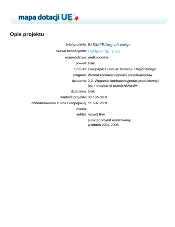 Opis projektu tytuł projektu: B153/IFE/Anglia/Londyn nazwa beneficjenta: H2Optim Sp. z o.o. województwo: wielkopolskie powiat: brak fundusz: Europejski Fundusz Rozwoju Regionalnego program: Wzrost konkurencyjności przedsiębiorstw działanie: 2.2. Wsparcie konkurencyjności produktowej i technologicznej przedsiębiorstw dziedzina: brak wartość projektu: 33 135.09 zł dofinansowanie z Unii Europejskiej: 11 597.28 zł ocena: sektor: rozwój firm punktor projekt realizowany w latach 2004-2006
