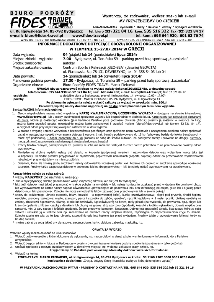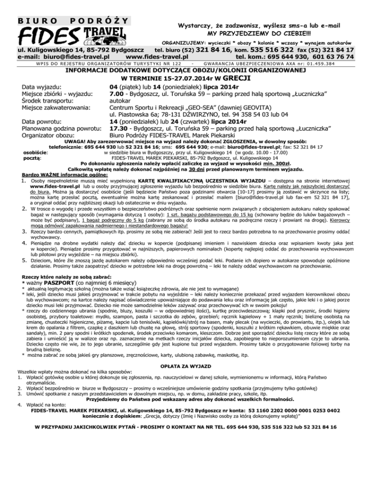 BIURO PODRÓŻY Wystarczy, że zadzwonisz, wyślesz sms-a lub e-mail MY PRZYJEDZIEMY DO CIEBIE!!! ORGANIZUJEMY: wycieczki * obozy * kolonie * wczasy * wynajem autokarów ul. Kuligowskiego 14, 85-792 Bydgoszcz tel. biuro (52) 321 84 16, kom. 535 516 322 fax (52) 321 84 17 e-mail: [email protected] www.fides-travel.pl tel. kom.: 695 644 930, 601 63 76 74 WPIS DO RE JE STRU ORG ANIZ ATORÓW TURY STYKI NR 122 - G WARAN CJ A U BE ZPIE CZE NIOW A AXA n r: 01.459.384 INFORMACJE DODATKOWE DOTYCZĄCE OBOZU/KOLONII ORGANIZOWANEJ W TERMINIE 15-27.07.2014r W GRECJI Data wyjazdu: 04 (piątek) lub 14 (poniedziałek) lipca 2014r Miejsce zbiórki - wyjazdu: 7.00 - Bydgoszcz, ul. Toruńska 59 – parking przed halą sportową „Łuczniczka” Środek transportu: autokar Miejsce zakwaterowania: Centrum Sportu i Rekreacji „GEO-SEA” (dawniej GEOVITA) ul. Piastowska 6a; 78-131 DŹWIRZYNO, tel. 94 358 54 03 lub 04 Data powrotu: 14 (poniedziałek) lub 24 (czwartek) lipca 2014r Planowana godzina powrotu: 17.30 - Bydgoszcz, ul. Toruńska 59 – parking przed halą sportową „Łuczniczka” Organizator obozu: Biuro Podróży FIDES-TRAVEL Marek Piekarski UWAGA! Aby zarezerwować miejsce na wyjazd należy dokonać ZGŁOSZENIA, w dowolny sposób: telefonicznie: 695 644 930 lub 52 321 84 16; sms: 695 644 930; e-mail: [email protected]; fax: 52 321 84 17 osobiście: w siedzibie biura w Bydgoszczy, przy ul. Kuligowskiego 14 (w godz. 10.00 - 17.00) pocztą: FIDES-TRAVEL MAREK PIEKARSKI, 85-792 Bydgoszcz, ul. Kuligowskiego 14 Po dokonaniu zgłoszenia należy wpłacić zaliczkę za wyjazd w wysokości min. 300zł. Całkowitą wpłatę należy dokonać najpóźniej na 30 dni przed planowanym terminem wyjazdu. Bardzo WAŻNE informacje ogólne: 1. Osoby niepełnoletnie muszą mieć wypełnioną KARTĘ KWALIFIKACYJNĄ UCZESTNIKA WYJAZDU – dostępna na stronie internetowej www.fides-travel.pl lub u osoby przyjmującej zgłoszenie wyjazdu lub bezpośrednio w siedzibie biura. Kartę należy jak najszybciej dostarczyć do biura. Można ją dostarczyć osobiście (jeśli będziecie Państwo poza godzinami otwarcia [10-17] prosimy ją zostawić w skrzynce na listy; można kartę przesłać pocztą, ewentualnie można kartę zeskanować i przesłać mailem [[email protected] lub fax-em 52 321 84 17], a oryginał oddać przy najbliższej okazji lub ostatecznie w dniu wyjazdu. 2. W trosce o wygodę i przede wszystkim o bezpieczeństwo podróżnych oraz spełnienie norm związanych z obciążeniem autokaru należy spakować bagaż w następujący sposób (wymagania dotyczą 1 osoby): 1 szt. bagażu podstawowego do 15 kg (schowany będzie do luków bagażowych – może być podpisany), 1 bagaż podręczny do 5 kg (zabrany ze sobą do środka autokaru na podręczne rzeczy i prowiant na drogę). Kierowcy mogą odmówić zapakowania nadmiernego i niestandardowego bagażu! 3. Rzeczy bardzo cennych, pamiątkowych itp. prosimy ze sobą nie zabierać! Jeśli jest to rzecz bardzo potrzebna to na przechowani e prosimy oddać wychowawcy. 4. Pieniądze na drobne wydatki należy dać dziecku w kopercie (podpisanej imieniem i nazwiskiem dziecka oraz wpisaniem kwoty jaka jest w kopercie). Pieniądze prosimy przygotować w najniższych, papierowych nominałach (kopertę najlepiej oddać do przechowania wychowawcom lub pilotowi przy wyjeździe – na miejscu zbiórki). 5. Dzieciom, które źle znoszą jazdę autokarem należy odpowiednio wcześniej podać leki. Podanie ich dopiero w autokarze spowoduje opóźnione działanie. Prosimy także zaopatrzyć dziecko w potrzebne leki na drogę powrotną – leki te należy oddać wychowawcom na przechowanie. Rzeczy które należy ze sobą zabrać: * ważny PASZPORT (co najmniej 6 miesięcy) * aktualną legitymację szkolną (można także wziąć książeczkę zdrowia, ale nie jest to wymagane) * leki, jeśli dziecko musi jakieś przyjmować w trakcie pobytu na wyjeździe – leki należy koniecznie przekazać przed wyjazdem kierownikowi obozu lub wychowawcom; na kartce należy napisać oświadczenie upoważniające do podawania leku oraz informację jak często, jakie leki i o jakiej porze dziecko musi leki przyjmować. Dziecko nie może samodzielnie leków zażywać oraz przechowywać ich w swoim pokoju! * rzeczy do codziennego ubrania (spodnie, bluzy, koszulki – w odpowiedniej ilości), kurtkę przeciwdeszczową; klapki pod prysznic, środki higieny osobistej, przybory toaletowe: mydło, szampon, pasta i szczotka do zębów, grzebień; ręcznik kąpielowy + 1 mały ręcznik; bieliznę osobistą na zmianę, chusteczki higieniczne, piżamę, kapcie lub tenisówki, kąpielówki/strój na basen, mały plecak (na wycieczki, do prowiantu, itp.), olejek lub krem do opalania z filtrem, czapkę z daszkiem lub chustę na głowę, strój sportowy (spodenki, koszulki z krótkim rękawkiem, obuwie miękkie oraz sandały), min. 2 pary spodni i krótkich spodenek, środek przeciwko komarom, kleszczom. Dobrze jest sporządzić dziecku listę rzeczy które ze sobą zabiera i umieścić ją w walizce oraz np. zaznaczenie na metkach rzeczy inicjałów dziecka, zapobiegnie to nieporozumieniom czy je to ubrania. Dziecko często nie wie, że to jego ubranie, szczególnie gdy jest kupione tuż przed wyjazdem. Prosimy także o przygotowanie fol iowej torby na brudną bieliznę. * można zabrać ze sobą jakieś gry planszowe, zręcznościowe, karty, ulubioną zabawkę, maskotkę, itp. OPŁATA ZA WYJAZD Wszelkie wpłaty można dokonać na kilka sposobów: 1. Wpłacić gotówkę osobie u której dokonuje się zgłoszenia, np. nauczycielowi w danej szkole, wymienionemu w informacji, którą Państwo otrzymaliście. 2. Wpłacić bezpośrednio w biurze w Bydgoszczy – prosimy o wcześniejsze umówienie godziny spotkania (przyjmujemy tylko gotówkę) 3. Umówić spotkanie z naszym przedstawicielem w dowolnym miejscu, np. w domu, zakładzie pracy, szkole, itp. Przyjedziemy do Państwa pod wskazany adres aby dokonać wszelki