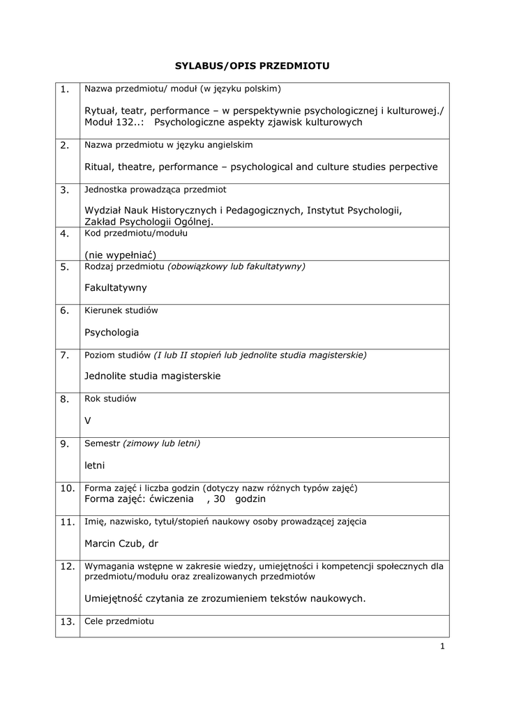 SYLABUS/OPIS PRZEDMIOTU 1. Nazwa przedmiotu/ moduł (w języku polskim) Rytuał, teatr, performance – w perspektywnie psychologicznej i kulturowej./ Moduł 132..: Psychologiczne aspekty zjawisk kulturowych 2. Nazwa przedmiotu w języku angielskim Ritual, theatre, performance – psychological and culture studies perpective 3. Jednostka prowadząca przedmiot Wydział Nauk Historycznych i Pedagogicznych, Instytut Psychologii, Zakład Psychologii Ogólnej. 4. Kod przedmiotu/modułu (nie wypełniać) 5. Rodzaj przedmiotu (obowiązkowy lub fakultatywny) Fakultatywny 6. Kierunek studiów Psychologia 7. Poziom studiów (I lub II stopień lub jednolite studia magisterskie) Jednolite studia magisterskie 8. Rok studiów V 9. Semestr (zimowy lub letni) letni 10. Forma zajęć i liczba godzin (dotyczy nazw różnych typów zajęć) Forma zajęć: ćwiczenia , 30 godzin 11. Imię, nazwisko, tytuł/stopień naukowy osoby prowadzącej zajęcia Marcin Czub, dr 12. Wymagania wstępne w zakresie wiedzy, umiejętności i kompetencji społecznych dla przedmiotu/modułu oraz zrealizowanych przedmiotów Umiejętność czytania ze zrozumieniem tekstów naukowych. 13. Cele przedmiotu 1 C1 Zapoznanie z wybranymi podejściami teoretycznymi analizującymi aspekty kulturowe w jakich osadzony jest człowiek, pokazanie w jaki sposób wyjaśnia się wpływ uwarunkowań kulturowych na człowieka i jego funkcjonowanie (CP) C2 . Zwrócenie uwagi na rozmaitość form jakie przybiera przekaz kulturowy. C3 Przygotowanie do rozpoznawania treści przekazu kulturowego. (CP). C4 Zapoznanie z możliwościami wykorzystania przekazu kulturowego do wspierania rozwoju, do terapii. C5 Zapoznanie z dynamiką przemian kulturowych i ich oddziaływaniem na funkcjonowanie ludzi. C6 Kształtowanie umiejętności wykorzystywania wiedzy z zakresu analizy zjawisk kulturowych do rozpoznawania zagrożeń wynikających z uwarunkowań kulturowych współczesnego człowieka.. C7 Uświadomienie wpływu uwarunkowań kulturowych na pracę psychologa.. C8 C8 Uwrażliwienie na etyczne aspekty pracy z ludźmi: uwzględnienie i poszanowanie ich kontekstu kulturowego, odniesienie się do niego w pracy.. C9 …………………………. C10 …………………………. C11 …………………………. C12 …………………………. 14. Zakładane efekty kształcenia (dla przedmiotu) EK_W_01 Wymienia wybrane podejścia teoretyczne analizujące aspekty kulturowe i wyjaśnia w jaki sposób wpływają na funkcjonowanie człowieka.. EK_W_02 Rozpoznaje treść przekazu kulturowego w różnorodnym materiale.. EK_W_03 ……………………. EK_W_04 ……………………. EK_W_05 ……………………. EK_U_01 ……………………. EK_U_02 ……………………. EK_U_03 ……………………. EK_U_04 ……………………. EK_U_05 ……………………. EK_K_01 ……………………. EK_K_02 ……………………. EK_K_03 ……………………. EK_K_04 ……………………. EK_K_05 ……………………. Symbole kierunkowych efektów kształcenia, np.: K_W01*, K_U05, K_K03 (symbole dla kierunku) K_W05 K_W11. ……………………………………. ……………………………………. 15. Treści programowe 1. Performatyka – zarys dyscypliny, podstawowe pojęcia – wg Schechnera 2 2. Performance – analiza zjawiska w kontekście struktury i funkcji rytuału. 3. Ryty przejścia w kulturach tradycyjnych. Od rytuału kolektywnego do indywidualnego 4. Trójetapowa struktura rytuału – separacja, faza liminalna, włączenie – koncepcja Van Geneppa 5. Od rytuału do teatru (V. Turner) 6. Współczesne formy rytów przejścia. 7. Ryty przejścia w tekstach kultury – (Propp) 8. Symulakry – rytuały w dobie postmodernizmu (Baudrillard) 9. Dramaty społeczne / przedstawienia w życiu codziennym 16. Zalecana literatura Obowiązkowa: 1. Schechner R. (2006) Performatyka. Wrocław. Ośrodek Badań Twórczości Jerzego Grotowskiego i Poszukiwań Teatralno-Kulturowych 2. Turner V. (2005) Od rytuału do teatru. Warszawa. Oficyna Wydawnicza Volumen 3. Rappaport R. (2006) Rytuał i religia w rozwoju ludzkości. Kraków. Zakład Wydawniczy „Nomos” Uzupełniająca: 1. Propp W. (2003) Historyczne korzenie bajki magicznej. Warszawa. Wydawnictwo KR 2. Goffman E. (2006) Rytuał interakcyjny. Warszawa PWN 3. Van Gennep A. (2006) Obrzędy przejścia. Warszawa PIW 17. Forma zaliczenia poszczególnych komponentów przedmiotu, sposób sprawdzenia osiągnięcia zamierzonych efektów kształcenia - wykład: ………… - ćwiczenia: F1: oceniona dyskusja i aktywność na zajęciach, F2: ocena krótkiej prezentacji dotyczącej jednostkowego zagadnienia, F3: ocena za projekt zaliczeniowy - laboratorium: ………… - konwersatorium: ………… - warsztat: …………… 3 - inne: …………… 18. Język wykładowy polski. 19. Obciążenie pracą studenta Forma aktywności studenta Średnia liczba godzin na zrealizowanie aktywności Godziny zajęć (wg planu studiów) z nauczycielem: - wykład: ………. godzin ćwiczenia: 30 godzin laboratorium: ………. godzin konwersatorium: ………. godzin warsztat: ………. godzin inne: ………. godzin 30 godzin Praca własna studenta np.: (podać tylko te, które dotyczą danego przedmiotu. Praca własna wyliczona z uwzględnieniem ECTS - patrz: opis pod tabelą**) - przygotowanie do zajęć: 30 godzin opracowanie wyników: ………. godzin czytanie wskazanej literatury: 20 godzin napisanie raportu z zajęć: 20 godzin przygotowanie do egzaminu: ………. godzin przygotowanie do kolokwium: ………. godzin Suma godzin Liczba punktów ECTS 70. godzin 100 godzin 4. 4