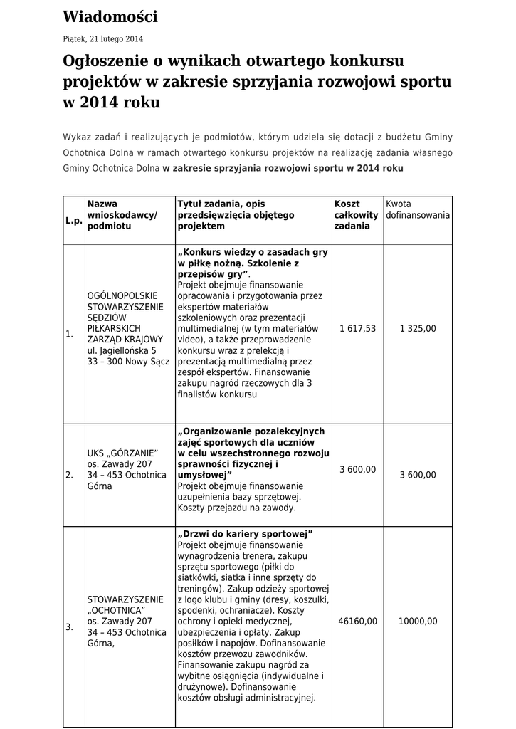 Wiadomości Piątek, 21 lutego 2014 Ogłoszenie o wynikach otwartego konkursu projektów w zakresie sprzyjania rozwojowi sportu w 2014 roku Wykaz zadań i realizujących je podmiotów, którym udziela się dotacji z budżetu Gminy Ochotnica Dolna w ramach otwartego konkursu projektów na realizację zadania własnego Gminy Ochotnica Dolna w zakresie sprzyjania rozwojowi sportu w 2014 roku Nazwa wnioskodawcy/ L.p. podmiotu 1. 2. 3. Tytuł zadania, opis przedsięwzięcia objętego projektem „Konkurs wiedzy o zasadach gry w piłkę nożną. Szkolenie z przepisów gry”. Projekt obejmuje finansowanie OGÓLNOPOLSKIE opracowania i przygotowania przez STOWARZYSZENIE ekspertów materiałów SĘDZIÓW szkoleniowych oraz prezentacji PIŁKARSKICH multimedialnej (w tym materiałów ZARZĄD KRAJOWY video), a także przeprowadzenie ul. Jagiellońska 5 konkursu wraz z prelekcją i 33 – 300 Nowy Sącz prezentacją multimedialną przez zespół ekspertów. Finansowanie zakupu nagród rzeczowych dla 3 finalistów konkursu UKS „GÓRZANIE” os. Zawady 207 34 – 453 Ochotnica Górna STOWARZYSZENIE „OCHOTNICA” os. Zawady 207 34 – 453 Ochotnica Górna, „Organizowanie pozalekcyjnych zajęć sportowych dla uczniów w celu wszechstronnego rozwoju sprawności fizycznej i umysłowej” Projekt obejmuje finansowanie uzupełnienia bazy sprzętowej. Koszty przejazdu na zawody. Koszt Kwota całkowity dofinansowania zadania 1 617,53 3 600,00 „Drzwi do kariery sportowej” Projekt obejmuje finansowanie wynagrodzenia trenera, zakupu sprzętu sportowego (piłki do siatkówki, siatka i inne sprzęty do treningów). Zakup odzieży sportowej z logo klubu i gminy (dresy, koszulki, spodenki, ochraniacze). Koszty ochrony i opieki medycznej, 46160,00 ubezpieczenia i opłaty. Zakup posiłków i napojów. Dofinansowanie kosztów przewozu zawodników. Finansowanie zakupu nagród za wybitne osiągnięcia (indywidualne i drużynowe). Dofinansowanie kosztów obsługi administracyjnej. 1 325,00 3 600,00 10000,00 4. 5. 6. „Wspieranie i upowszechnianie sportu motorowo - rowerowego w Gminie Ochotnica Dolna” ROWEROWO – Projekt obejmuje finansowanie MOTOCYKLOWY zakupu sprzętu sportowego dla KLUB TYLMANOWA zawodników (linki gazu, sprzęgła os. Gąszcze 207 A oraz hamulca, opony, dętki, klocki 34 – 451 Tylmanowa hamulcowe, akcesoria rowerowe i motocyklowe niezbędne do jazdy na tych sprzętach, zakup oklein na motory oraz rowery). LKS LUBAŃ TYLMANOWA „Szukajmy talentów” Projekt obejmuje finansowanie: przewozu zawodników na zawody ligowe i pucharowe oraz turnieje LKS „LUBAŃ piłki nożnej. Koszty opłat, TYLMANOWA” ubezpieczenia zawodników, os. Kozielce wynagrodzenie dla sędziów; koszty 34 – 451 Tylmanowa opieki medycznej dla zawodników. Dofinansowanie zakupu sprzętu sportowego (odzieży, obuwia, piłek) oraz posiłków i napojów dla zawodników. LZS KS „GORC OCHOTNICA” os. Dłubacze 173 B 34 – 452 Ochotnica Dolna „Ochotnica na sportowo 2014” Projekt obejmuje finansowanie wynagrodzenia trenera, kosztów związanych z utrzymaniem obiektu sportowego wraz z zapleczem socjalnym i zakupem materiałów. Koszty wynagrodzenia sędziów sędziujących zawody, koszty obsługi medycznej meczów. Opłaty związane z udziałem w rozgrywkach, wynajmu obiektów sportowych na potrzeby prowadzenia zajęć sportowych. Koszty transportu zawodników na zawody sportowe oraz wynajmu obiektów do treningów. Zakup napojów chłodzących i wyżywienia. Dofinansowanie zakupu sprzętu sportowego. 12000,00 10 000,00 35.000,00 33.200,00 35000,00 33200,00 7. MOTOCYKLOWY KLUB SPORTOWY TRIAL OCHOTNICA 34 – 453 Ochotnica Górna os. Białówka 331 „III WIELKI GORCZAŃSKI PODJAZD ENDURO – CROSS – TRIAL” Projekt obejmuje organizację rajdu w Ochotnicy Górnej w dniu 17 sierpnia 2014 r., a w szczególności dofinansowanie zakupu pucharów, nagród, koszulek dla zawodników, plakatów okolicznościowych. Zapewnienie bezpieczeństwa 12 000,00 (karetka), zabezpieczenie przeciwpożarowe, oznakowanie i przygotowanie trasy (jej zabezpieczenie). Zakup materiałów biurowych. Koszty dzierżawy parkingu, zaplecza sanitarnego. Wypłaty dla sędziów i biura, ubezpieczenie zawodów. 10 000,00 W ramach otwartego konkursu nie odrzucono żadnego projektu. Wszystkie projekty otrzymają dofinansowane wg. powyższego wykazu. Ochotnica Dolna, 21.02.2014 r. Wójt Gminy /-/ Kazimierz Konopka