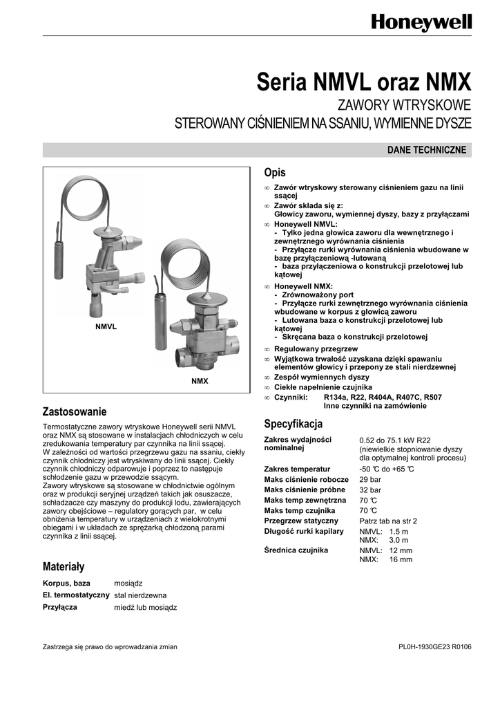 Seria NMVL oraz NMX ZAWORY WTRYSKOWE STEROWANY CIŚNIENIEM NA SSANIU, WYMIENNE DYSZE DANE TECHNICZNE Opis • Zawór wtryskowy sterowany ciśnieniem gazu na linii ssącej • Zawór składa się z: Głowicy zaworu, wymiennej dyszy, bazy z przyłączami • Honeywell NMVL: - Tylko jedna głowica zaworu dla wewnętrznego i zewnętrznego wyrównania ciśnienia - Przyłącze rurki wyrównania ciśnienia wbudowane w bazę przyłączeniową -lutowaną - baza przyłączeniowa o konstrukcji przelotowej lub kątowej • Honeywell NMX: - ZrównowaŜony port - Przyłącze rurki zewnętrznego wyrównania ciśnienia wbudowane w korpus z głowicą zaworu - Lutowana baza o konstrukcji przelotowej lub kątowej - Skręcana baza o konstrukcji przelotowej NMVL NMX Zastosowanie Termostatyczne zawory wtryskowe Honeywell serii NMVL oraz NMX są stosowane w instalacjach chłodniczych w celu zredukowania temperatury par czynnika na linii ssącej. W zaleŜności od wartości przegrzewu gazu na ssaniu, ciekły czynnik chłodniczy jest wtryskiwany do linii ssącej. Ciekły czynnik chłodniczy odparowuje i poprzez to następuje schłodzenie gazu w przewodzie ssącym. Zawory wtryskowe są stosowane w chłodnictwie ogólnym oraz w produkcji seryjnej urządzeń takich jak osuszacze, schładzacze czy maszyny do produkcji lodu, zawierających zawory obejściowe – regulatory gorących par, w celu obniŜenia temperatury w urządzeniach z wielokrotnymi obiegami i w układach ze spręŜarką chłodzoną parami czynnika z linii ssącej. • Regulowany przegrzew • Wyjątkowa trwałość uzyskana dzięki spawaniu elementów głowicy i przepony ze stali nierdzewnej • Zespół wymiennych dyszy • Ciekłe napełnienie czujnika • Czynniki: R134a, R22, R404A, R407C, R507 Inne czynniki na zamówienie Specyfikacja Zakres wydajności nominalnej Zakres temperatur Maks ciśnienie robocze Maks ciśnienie próbne Maks temp zewnętrzna Maks temp czujnika Przegrzew statyczny Długość rurki kapilary Średnica czujnika Materiały Korpus, baza 0.52 do 75.1 kW R22 (niewielkie stopniowanie dyszy dla optymalnej kontroli procesu) -50 °C do +65 °C 29 bar 32 bar 70 °C 70 °C Patrz tab na str 2 NMVL: 1.5 m NMX: 3.0 m NMVL: 12 mm NMX: 16 mm mosiądz El. termostatyczny stal nierdzewna Przyłącza miedź lub mosiądz Zastrzega się prawo do wprowadzania zmian PL0H-1930GE23 R0106 SERIA NMVL ORAZ NMX Napełnienie czujnika oraz przegrzew statyczny Kod napełnienia czujnika Przegrzew R134a R22 R404A R407C R507 DA - 15 K 21 K 12 K 21 K TA 15 K 30 K 35 K 26 K 35 K LB 30 K Inne czynniki na zamówienie. Przegrzew w oparciu o t0 = +0 °C. 45 K - 40 K - Wydajności Typ NMVL NMX Rozmiar dyszy Wydajność nominalna (kW*) R134a R22 R404A R407C R507 0.3 0.36 0.52 0.36 0.50 0.36 0.5 0.69 0.99 0.68 0.95 0.69 0.7 0.96 1.4 0.97 1.3 0.98 1.0 1.4 2.0 1.4 1.9 1.4 1.5 2.2 3.2 2.2 3.1 2.3 2.0 2.9 4.0 2.8 3.9 2.9 2.5 4.0 5.8 4.1 5.6 4.1 3.0 6.6 9.3 6.5 8.9 6.6 3.5 8.7 12.2 8.6 11.7 8.7 4.5 11.8 17.0 12.0 16.4 12.1 4.75 15.9 22.4 15.8 21.6 15.9 4.5 11.8 17.0 12.0 16.4 12.1 4.75 15.9 22.4 15.8 21.6 15.9 5 20.0 29.1 20.5 28.0 20.7 6 27.6 42.4 29.8 40.8 30.1 7 35.3 54.5 38.3 52.5 38.7 8 43.3 64.1 45.1 61.8 45.6 10 51.0 75.1 52.8 72.3 53.3 * Wydajność przy następujących parametrach: t0 = +4 °C. t c = +38 °C i1 K dochłodzenia ciekłego czynnika na wlo cie zaworu. Dla innych parametrów patrz tab wydajności w katalogu Honeywell lub skorzystaj z programu doboru. PL0H-1930GE23 R0106 2 Zastrzega się prawo do wprowadzania zmian bez powiadomienia. SERIA NMVL ORAZ NMX Wymiary i wagi Typ Przyłącza NMVL VD VLS kątowy VLSX kątowy VLS przelotowy VLSX przelotowy Waga (kg) Wlot (A) Wylot (B) Wyrównanie ciśnienia (C) - - - około 0.43 około 0.02 - - - 6 mm ODF 10 mm ODF - 1/4" ODF 3/8" ODF - 10 mm ODF 12 mm ODF - 3/8" ODF 1/2" ODF - 12 mm ODF 16 mm ODF - 1/2" ODF 5/8" ODF - 6 mm ODF 10 mm ODF 6 mm ODF 1/4" ODF 3/8" ODF 1/4" ODF 10 mm ODF 12 mm ODF 6 mm ODF 3/8" ODF 1/2" ODF 1/4" ODF 12 mm ODF 16 mm ODF 6 mm ODF 1/2" ODF 5/8" ODF 1/4" ODF 10 mm ODF 12 mm ODF - 3/8" ODF 1/2" ODF - 12 mm ODF 16 mm ODF - 1/2" ODF 5/8" ODF - 10 mm ODF 12 mm ODF 6 mm ODF 3/8" ODF 1/2" ODF 1/4" ODF 12 mm ODF 16 mm ODF 6 mm ODF 1/2" ODF 5/8" ODF 1/4" ODF około 0.16 około 0.17 około 0.16 około 0.17 NMVL VD VLS(X) - przelotowy Zastrzega się prawo do wprowadzania zmian bez powiadomienia 3 VLS(X) - kątowy PL0H-1930GE23 R0106 SERIA NMVL ORAZ NMX Typ Wlot (A) + (B) Przyłącza Wylot (C) + (D) Wyrównanie ciśnienia Waga (kg) - - 7/16" UNF około 0.6 około 0.14 NMX XD - - - XLS przelotowy 12 + 16 mm ODF 16 + 22 mm ODF - 1/2" + 5/8" ODF 5/8" + 7/8" ODF - XLS kątowy 12 + 15 mm ODF 16 + 22 mm ODF - 1/2" + 5/8" ODF 5/8" + 7/8" ODF - 7/8" UNF 7/8" UNF - XBS przelotowy około 0.41 około 0.32 około 0.49 NMX PL0H-1930GE23 R0106 XD XBS - przelotowy XLS - kątowy XLS - przelotowy 4 Zastrzega się prawo do wprowadzania zmian bez powiadomienia. SERIA NMVL ORAZ NMX Typ / Zamówienie (Program części) 2. Wymienna dysza 1. Korpus zaworu NMVL VD DA Seria (NMVL, NMX) Seria (VD, XD) Kod napełnienia czujnika Rozmiar dyszy 0.5 3. Baza przyłączeniowa VLS X 10 mm ODF x 12 mm ODF W Seria (VLS, XLS, XBS) Wyrównanie ciśnienia VLS: X = zewnętrzne () = wewnętrzne Rozmiar przyłączy (wlot x wylot) D = konstrukcja przelotowa W = konstrukcja kątowa Regulacja przegrzewu MontaŜ • Zawory mogą być montowane w dowolnym połoŜeniu. Honeywell zaleca montaŜ zaworów wtryskowych z ich ustawieniami fabrycznymi dla danego czynnika chłodniczego. • Przewód zewnętrznego wyrównania ciśnienia (VLSX and NMX) powinien mieć średnicę 6 mm lub 1/4”, powinien być Wartość przegrzewu jest ustawiona dla podanych wyŜej wartości oraz dla zapewnienia optymalnej kontroli pracy zamontowany zgodnie z kierunkiem przepływu czujnika, zaworu. Jeśli wystąpi konieczność regulacji wartości za czujnikiem zaworu termostatycznego. Zaleca się przegrzewu, naleŜy obrócić trzpień obrotowy zgodnie z poprowadzenie przew