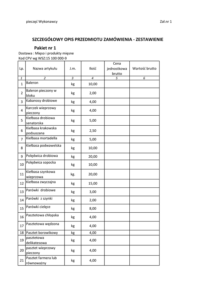 pieczęć Wykonawcy Zał.nr 1 SZCZEGÓŁOWY OPIS PRZEDMIOTU ZAMÓWIENIA - ZESTAWIENIE Pakiet nr 1 Dostawa : Mięso i produkty mięsne Kod CPV wg WSZ:15 100 000-9 Lp. Nazwa artykułu J.m. Ilość Cena jednostkowa brutto 1 2 3 4 5 kg 10,00 kg 2,00 kg 4,00 kg 4,00 kg 5,00 kg 2,50 kg 5,00 kg 10,00 kg 20,00 kg 10,00 kg. 20,00 kg 15,00 13 Parówki drobiowe kg 3,00 14 Parówki z szynki kg 2,00 15 Parówki cielęce kg 8,00 16 Pasztetowa chłopska kg 4,00 17 Pasztetowa wędzona kg 4,00 18 Pasztet borowikowy pasztetowa 19 delikatesowa pasztet wieprzowy 20 pieczony Pasztet farmera lub 21 równoważny kg 4,00 kg 4,00 kg 4,00 kg 4,00 1 Baleron Baleron pieczony w bloku 3 Kabanosy drobiowe 2 Karczek wieprzowy pieczony Kiełbasa drobiowa 5 senatorska Kiełbasa krakowska 6 podsuszana 7 Kiełbasa mortadella 4 8 Kiełbasa podwawelska 9 Polędwica drobiowa 10 Polędwica sopocka Kiełbasa szynkowa wieprzowa 12 Kiełbasa zwyczajna 11 Wartość brutto 6 Salceson królewski lub równoważny 23 Salceson ozorkowy 22 kg 4,00 kg 4,00 kg 4,00 Salceson wieprzowy 25 wiejski lub równoważny kg 5,00 26 Krupniok kg 10,00 kg 5,00 kg 10,00 kg 10,00 kg 10,00 kg 2,00 kg 2,00 kg 2,00 kg 4,00 kg 5,00 kg 20,00 kg 3,00 kg 4,00 kg 4,00 kg 5,00 kg 4,00 kg 5,00 kg 4,00 kg 4,00 kg 8,00 kg 4,00 kg 8,00 24 Salceson czarny Szynka mielona wieprzowa 28 Szynka dębicka 27 29 Szynka drobiowa 30 31 32 33 34 35 36 Szynka konserwowa wieprzowa Szynka kulka orzech Szynka mielona z pieczarkami Szynka tyrolska Szynka gotowana wiejska Szynka zielonogórska Szynka gotowana extra 37 Szynka cygańska 38 Filet z indyka Sopel Schab domowy pieczony Łopatka wieprzowa 40 pieczona 41 Pieczeń senatorska Pieczeń rzymska 42 39 43 44 45 46 47 Indyk faszerowany Kurczak faszerowany Kiełbasa parówkowa wieprzowa Kiełbasa żywiecka Kiełbasa biała parzona 48 Blok szynkowy wieprzowy Blok z piersi indyka kg 4,00 kg 5,00 kg 3,00 kg 3,00 kg 3,00 kg 5,00 kg 2,00 55 Kiełbasa kanapkowa kg 2,00 56 Kiełbasa lisiecka kg 3,00 57 Franfuterki kg 4,00 58 Kiełbasa jałowcowa kg 2,00 59 Mozaika boczkowa kg 2,00 60 Rolada pawie oczko kg 3,00 61 Rolada schabowa kg 3,00 kg 2,00 kg 5,00 kg 2,00 kg 1,00 66 Smalec staropolski kg 1,00 67 Kurczak udka świeże kg 100,00 68 Kurczaki świeże kg 10,00 kg 15,00 kg 10,00 kg 5,00 kg 30,00 kg 5,00 kg 5,00 kg 5,00 49 50 Boczek rolowany 51 Boczek z ziołami Kiełbasa czosnkowa wieprzowa 53 Kiełbasa kminkowa 52 54 62 63 Kiełbasa grillowa Kiełbasa krakowska pieczona Kiełbasa śląska Kiełbasa swojska wieprzowa 65 Smalec wieprzowy 64 69 70 Wątroba drobiowa Wątroba z indyka 71 Filety z piersi indyka 72 73 74 75 Filety z piersi kurczaka Udziec z indyka z kością Udziec z indyka bez kości Żołądki z indyka 76 Żołądki drobiowe kg 15,00 kg 5,00 kg 4,00 kg 30,00 kg 15,00 kg 30,00 kg 20,00 kg 15,00 kg 10,00 kg 10,00 86 Słonina świeża kg 10,00 87 Boczek świeży b/k kg 5,00 kg 5,00 kg 5,00 kg 2,00 kg 10,00 kg 3,00 kg 3,00 kg. 10,00 kg 10,00 kg 10,00 kg 20,00 kg 6,00 kg 5,00 100 Płuca wieprzowe kg 5,00 101 Nerki wieprzowe kg 5,00 102 Watroba wieprzowa kg 5,00 103 Łopatka cielęca b/k kg 2,00 77 78 Udka z kaczki czarnej Piersi z kaczki czarnej Kości rosołowe (kurczak - korpusy) Mięso łopatka 80 wieprzowa z kością Mięso łopatka 81 wieprzowa b/k Mięso schab bez kości 82 79 Karczek wieprzowy świeży b/k Pieczeń wieprzowa 84 extra 85 Żeberka wieprzowe 83 88 Boczek wędzony z /k Mięso wołowe z/k rosbratel 90 Pręga wołowa 89 91 92 93 Pieczeń wolowa extra Mięso mielone wieprzowo-wołowe Mieso mielone wołowe 94 Ozory wołowe Flaki wołowe parzone 95 nie krojone 96 Nogi wieprzowe 97 Kości wieprzowe świeże Kości wieprzowe wędzone 99 Serca wieprzowe 98 104 Mostek cielęcy kg 2,00 105 Udziec cielęcy b/k kg 2,00 Ogółem: Wartość brutto ogółem (poz.6) słownie: ……………………………………………………………. Warość brutto(poz.6) stanowi iloczyn poz.4(ilość) x poz. 5(cena jednostkowa brutto). Wartość brutto ogółem stanowi cenę oferty,którą należy wpisać do formularza ofertowego - zał. Nr 1a. w tym: wartość netto ogółem:………………..słownie:………………………………………………….. wartość Vat ogółem: Do oceny będzie brana pod uwagę tylko cena brutto oferty. Cena netto ogółem konieczna będzie do spisania umowy z wybranym Wykonawcą. Wysokość wynagrodzenia należnego Wykonawcy nie może ulec zmianie. W przypadku urzędowych zmian stawek podatku Vat Wykonawca musi się liczyć z obniżką jednostkowych cen netto. Dostawy mięsa i produktów mięsnych wg. potrzeb jednostki około 2 razy w tygodniu po zamówieniu telefonicznym. ……………………………………………………… Pieczęć i podpis Wykonawcy pieczęć Wykonawcy SZCZEGÓŁOWY OPIS PRZEDMIOTU ZAMÓWIENIA-ZESTAWIENIE Pakiet nr 2 Dostawa : Ryby i przetwory rybne Kod CPV wg WSZ:03311000 - 2 , 15221000 - 3 Lp. Nazwa artykułu J.m. Ilość Wartość jednostkowa brutto 1 2 3 4 5 kg 5,00 kg 60,00 kg 5,00 kg 5,00 kg kg 5,00 5,00 kg 5,00 kg kg 5,00 33,00 kg 20,00 szt 20,00 szt 20,00 szt 15,00 szt 20,00 szt 20,00 szt 20,00 szt 10,00 kg 5,00 Makrela wędzona od 300-500g Filet z dorsza SHPnorweski rozmiar 82 16 mrożony 1 Filet z morszczuka 3 morski SHP rozmiar 4-6 mrożony Kostka z łososia z fileta 4 5 Filet z łososia 6 Pstrąg świeży 7 Filet z karmazyna ze skórą 8 Filet z soli 9 Karp świeży żywy Matjas solony norweski 10 płaty - rozmiar 4-6 (netto) Filet z makreli w 11 pomidorach( w puszkach 170g) Tuńczyk w 12 oleju(kawałki w puszkach) 170g netto Śledź po gdańsku 160g 13 netto Szprot podwędzany w 14 oleju 170 g netto Paprykarz szczeciński 15 330g netto lub równoważny Filet z makreli w oleju 16 170g netto Filet ze śledzia w oleju 17 170g netto Paluszki rybne z fileta 18 Ogółem: Wartość brutto 6 Wartość brutto ogółem (poz.6) słownie: ……………………………………………………………. Warość brutto(poz.6) stanowi iloczyn poz.4(il