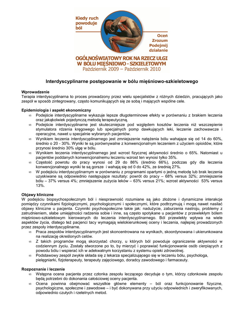 Interdyscyplinarne postępowanie w bólu mięśniowo-szkieletowego Wprowadzenie Terapia interdyscyplinarna to proces prowadzony przez wielu specjalistów z róŜnych dziedzin, pracujących jako zespół w sposób zintegrowany, często komunikujących się ze sobą i mających wspólne cele. Epidemiologia i aspekt ekonomiczny • Podejście interdyscyplinarne wykazuje lepsze długoterminowe efekty w porównaniu z brakiem leczenia oraz jakąkolwiek pojedynczą metodą terapeutyczną. • Podejście interdyscyplinarne jest skuteczniejsze pod względem kosztów leczenia niŜ wszczepienie stymulatora rdzenia kręgowego lub specjalnych pomp dawkujących leki, leczenie zachowawcze i operacyjne, nawet u specjalnie wybranych pacjentów. • Wynikiem leczenia interdyscyplinarnego jest zmniejszenie natęŜenia bólu wahające się od 14 do 60%, średnio o 20 - 30%. Wyniki te są porównywalne z konwencjonalnym leczeniem z uŜyciem opioidów, które przynosi średnio 30% ulgę w bólu. • Wynikiem leczenia interdyscyplinarnego jest wzrost fizycznej aktywności średnio o 65%. Natomiast u pacjentów poddanych konwencjonalnemu leczeniu wzrost ten wynosi tylko 35%. • Częstość powrotu do pracy wynosi od 29 do 86% (średnio 66%), podczas gdy dla leczenia konwencjonalnego wyniki te są gorsze i wahają się od 0 do 42%, ze średnią 27%. • W podejściu interdyscyplinarnym w porównaniu z programami opartymi o jedną metodę lub brak leczenia uzyskiwane są odpowiednio następujące rezultaty: powrót do pracy – 68% versus 32%; zmniejszenie bólu – 37% versus 4%; zmniejszenie zuŜycia leków – 63% versus 21%; wzrost aktywności 53% versus 13%. Objawy kliniczne W podejściu biopsychospołecznym ból i niesprawność rozumiane są jako złoŜone i dynamiczne interakcje pomiędzy czynnikami fizjologicznymi, psychologicznymi i społecznymi, które podtrzymują i mogą nawet nasilać objawy kliniczne u pacjenta. Czynniki psychospołeczne takie jak: naduŜycie, zaburzenia nastroju, problemy z zatrudnieniem, słabe umiejętności radzenia sobie i inne, są często spotykane u pacjentów z przewlekłym bólem mięśniowo-szkieletowym kierowanych do leczenia interdyscyplinarnego. Ból przewlekły wpływa na wiele aspektów Ŝycia, dlatego teŜ pacjenci tacy wymagają wielokierunkowej oceny i leczenia, najlepiej prowadzonych przez zespoły interdyscyplinarne. • Praca zespołów interdyscyplinarnych jest skoncentrowana na wynikach, skoordynowana i ukierunkowana na realizację określonych celów. • Z takich programów mogą skorzystać chorzy, u których ból powoduje ograniczenie aktywności w codziennym Ŝyciu. Zostały stworzone po to, by mierzyć i poprawiać funkcjonowanie osób cierpiących z powodu bólu i wspierać ich w adekwatnym korzystaniu z systemu opieki zdrowotnej. • Podstawowy zespół zwykle składa się z lekarza specjalizującego się w leczeniu bólu, psychologa, pielęgniarki, fizjoterapeuty, terapeuty zajęciowego, doradcy zawodowego i farmaceuty. Rozpoznanie i leczenie • Wstępna ocena pacjenta przez członka zespołu leczącego decyduje o tym, którzy członkowie zespołu będą potrzebni do dokonania całościowej oceny pacjenta. • Ocena powinna obejmować wszystkie główne elementy – ból oraz funkcjonowanie fizyczne, psychologiczne, społeczne i zawodowe – i być dokonywana przy uŜyciu odpowiednich i zweryfikowanych, odpowiednio czułych i rzetelnych metod. • • • Po dokonaniu oceny cały zespół tworzy ogólny plan leczenia. Zespół realizuje plan leczenia zgodnie z indywidualnymi potrzebami pacjenta, koncentrując się na osiąganiu mierzalnych celów terapeutycznych, które są ustalane wspólnie z pacjentem Cele terapeutyczne u pacjentów z bólem mięśniowo-szkieletowym odnoszą się zwykle do wielu aspektów Ŝycia. Niektóre z najczęściej ustalanych celów to: (1) zmniejszenie bólu, (2) poprawa funkcjonowania, (3) umoŜliwienie powrotu do pracy, (4) rozwiązanie problemów związanych z zaŜywaniem leków i (5) zmniejszone korzystanie z opieki medycznej. Piśmiennictwo 1. Gatchel RJ, Okifuji A. Evidence-based scientific data documenting the treatment and cost-effectiveness of comprehensive pain programs for chronic nonmalignant pain. J Pain 2006;7:779–93. 2. McCracken LM, Turk DC. Behavioral and cognitive-behavioral treatment for chronic pain: outcome, predictors of outcome, and treatment process. Spine 2002;27:2564–73. 3. Okifuji A. Interdisciplinary pain management with pain patients: evidence for its effectiveness. Semin Pain Med 2003;1:110–9. 4. Robbins H, Gatchel RJ, Noe C, Gajraj N, Polatin P, Deschner M, Vakharia A, Adams L. A prospective one-year outcome study of interdisciplinary chronic pain management: compromising its efficacy by managed care policies. Anesth Analg 2003;97:156–62. © 2010 International Association for the Study of Pain®