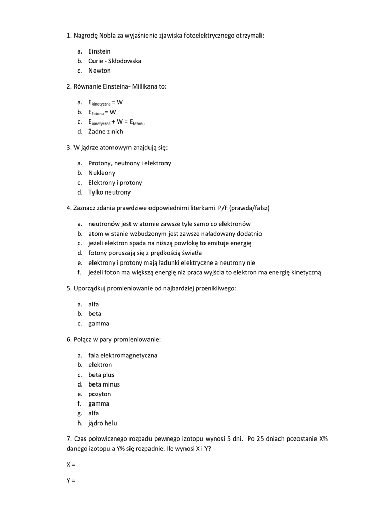 1. Nagrodę Nobla za wyjaśnienie zjawiska fotoelektrycznego otrzymali: a. Einstein b. Curie - Skłodowska c. Newton 2. Równanie Einsteina- Millikana to: a. b. c. d. Ekinetyczna = W Efotonu = W Ekinetyczna + W = Efotonu Żadne z nich 3. W jądrze atomowym znajdują się: a. b. c. d. Protony, neutrony i elektrony Nukleony Elektrony i protony Tylko neutrony 4. Zaznacz zdania prawdziwe odpowiednimi literkami P/F (prawda/fałsz) a. b. c. d. e. f. neutronów jest w atomie zawsze tyle samo co elektronów atom w stanie wzbudzonym jest zawsze naładowany dodatnio jeżeli elektron spada na niższą powłokę to emituje energię fotony poruszają się z prędkością światła elektrony i protony mają ładunki elektryczne a neutrony nie jeżeli foton ma większą energię niż praca wyjścia to elektron ma energię kinetyczną 5. Uporządkuj promieniowanie od najbardziej przenikliwego: a. alfa b. beta c. gamma 6. Połącz w pary promieniowanie: a. b. c. d. e. f. g. h. fala elektromagnetyczna elektron beta plus beta minus pozyton gamma alfa jądro helu 7. Czas połowicznego rozpadu pewnego izotopu wynosi 5 dni. Po 25 dniach pozostanie X% danego izotopu a Y% się rozpadnie. Ile wynosi X i Y? X= Y=