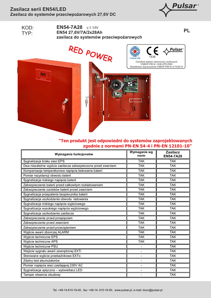 Pulsar Zasilacz serii EN54/LED Zasilacz do systemów przeciwpożarowych 27,6V DC KOD: TYP: EN54-7A28 v.1.1/IV PL EN54 27,6V/7A/2x28Ah zasilacz do systemów przeciwpożarowych RED POW ER 1438 Certyfikat stałości właściwości użytkowych CNBOP-PIB Nr 1438-CPR-0385 Świadectwo dopuszczenia CNBOP-PIB Nr 2174/2014 “Ten produkt jest odpowiedni do systemów zaprojektowanych zgodnie z normami PN-EN 54-4 i PN-EN 12101-10” Wymagania wg norm Zasilacz EN54-7A28 Sygnalizacja braku sieci EPS Dwa niezależne wyjścia zasilacza zabezpieczone przed zwarciem TAK TAK TAK TAK Kompensacja temperaturowa napięcia ładowania baterii Pomiar rezystancji obwodu baterii Sygnalizacja niskiego napięcia baterii TAK TAK TAK TAK TAK TAK Zabezpieczenie baterii przed całkowitym rozładowaniem Zabezpieczenie zacisków baterii przed zwarciem Sygnalizacja przepalenia bezpiecznika baterii TAK TAK TAK TAK TAK TAK Sygnalizacja uszkodzenia obwodu ładowania Sygnalizacja niskiego napięcia wyjściowego Sygnalizacja wysokiego napięcia wyjściowego TAK TAK TAK TAK TAK TAK Sygnalizacja uszkodzenia zasilacza Zabezpieczenie przed przepięciem Zabezpieczenie przed zwarciem TAK TAK TAK TAK TAK TAK Zabezpieczenie przed przeciążeniem Wyjście awarii zbiorczej ALARM Wyjście techniczne EPS Wyjście techniczne APS TAK TAK TAK TAK TAK TAK TAK TAK Wyjście techniczne PSU Wejście sygnału awarii zewnętrznej EXTi Sterowane wyjście przekaźnikowe EXTo Zdalny test akumulatorów - TAK TAK TAK TAK Pomiar napięcia sieci zasilającej 230V AC Sygnalizacja optyczna – wyświetlacz LED Tamper otwarcia obudowy - TAK TAK TAK Wymagania funkcjonalne Tel. +48-14-610-19-40, fax: +48-14- 610-19-50, www.pulsar.pl, e-mail: [email protected] ® Pulsar Zasilacz serii EN54/LED Zasilacz do systemów przeciwpożarowych 27,6V DC Cechy zasilacza: · zgodność z wymaganiami norm PN-EN 54-4, PN-EN12101-10 oraz pkt. 12.2 wg Rozp.MSWiA z dn.20.06.2007 · bezprzerwowe zasilanie 27,6V DC/ 7A · miejsce na akumulatory 2x28Ah/12V · niezależnie zabezpieczone wyjścia zasilacza AUX1 i AUX2 · wysoka sprawność 82% · niski poziom tętnień napięcia · mikroprocesorowy system automatyki · inteligentna ochrona zasilacza w stanie przeciążenia · pomiar rezystancji obwodu akumulatorów · automatyczna kompensacja temperaturowa ładowania akumulatorów · test akumulatorów · dwufazowy proces ładowania akumulatorów · funkcja przyspieszonego ładowania akumulatorów · kontrola ciągłości obwodu akumulatorów · kontrola napięcia akumulatorów · kontrola stanu bezpiecznika akumulatorów · kontrola ładowania i konserwacji akumulatorów · ochrona akumulatorów przed nadmiernym rozładowaniem (UVP) · ochrona akumulatorów przed przeładowaniem · zabezpieczenie wyjścia akumulatorów przed zwarciem i odwrotnym podłączeniem · kontrola prądu obciążenia · kontrola napięcia wyjściowego · kontrola stanu bezpieczników wyjść AUX1 i AUX2 · pomiar napięcia sieci zasilającej 230V · port komunikacyjny „SERIAL” z zaimplementowanym protokołem MODBUS RTU · darmowy program “PowerSecurity” do monitorowania parametrów pracy zasilacza w wersji na PC oraz mobilnej na telefony z systemem Android · zdalny monitoring (opcja: WiFi, Ethernet, RS485, USB) · zdalny test akumulatorów (wymagane dodatkowe moduły) · współpraca z modułami bezpiecznikowymi EN54-LB4 i EN54-LB8 (opcjonalnie) · optyczna sygnalizacja przeciążenia zasilacza OVL · sygnalizacja akustyczna awarii · wybór czasu sygnalizacji zaniku sieci 230V AC · wyjście przekaźnikowe awarii zbiorczej ALARM · wejście awarii zbiorczej EXTi · sterowane wyjście przekaźnikowe EXTo · wejścia/wyjścia techniczne z izolacją galwaniczną · wyjście techniczne EPS sygnalizacji zaniku sieci 230V AC · wyjście techniczne PSU sygnalizacji awarii zasilacza · wyjście techniczne APS sygnalizacji awarii akumulatorów · wewnętrzna pamięć stanu pracy zasilacza · sygnalizacja optyczna – panel LED · wskazania prądu wyjściowego · wskazania napięcia wyjściowego AUX1, AUX2 · wskazania rezystancji obwodu akumulatorów · wskazania napięcia sieci zasilającej 230V AC · kody awarii wraz z historią · zabezpieczenia: · przeciwzwarciowe SCP · przeciążeniowe OLP · termiczne OHP · nadnapięciowe OVP · przepięciowe · antysabotażowe: otwarcie obudowy -TAMPER · zamykanie obudowy - zamek · chłodzenie konwekcyjne · gwarancja - 5 lat od daty produkcji Opis ogólny Zasilacz buforowy przeznaczony jest do bezprzerwowego zasilania urządzeń sygnalizacji pożarowej, systemów kontroli rozprzestrzeniania dymu i ciepła oraz urządzeń przeciwpożarowych i automatyki pożarowej wymagających stabilizowanego napięcia 24V DC (±15%). Zasilacz wyposażony jest w dwa niezależnie zabezpieczone wyjścia AUX1 i AUX2 które dostarczają napięcia 27,6V DC o sumarycznej wydajności prądowej: Praca ciągła Prąd wyjściowy Imax a=5,5A Praca chwilowa Prąd wyjściowy Imax b=7A W przypadku zaniku napięcia sieciowego następuje bezprzerwowe przełączenie na źródło zasilania rezerwowego w postaci akumulatorów. Zasilacz umieszczony jest w obudowie metalowej (kolor RAL 3001 - czerwony) z miejscem na akumulatory 2x28Ah/12V. Zasilacz współpracuje z bezobsługowymi akumulatorami kwasowo-ołowiowymi wykonanymi w technologii AGM lub żelowej. Tel. +48-14-610-19-40, fax: +48-14- 610-19-50, www.pulsar.pl, e-mail: [email protected] ® Pulsar Zasilacz serii EN54/LED ® Zasilacz do systemów przeciwpożarowych 27,6V DC Klasa funkcjonalna PN-EN 12101-10:2007 Napięcie zasilania Pobór prądu Częstotliwość zasilania Moc zasilacza Sprawność Napięcie wyjściowe w 20 ºC Prąd wyjściowy Maksymalna rezystancja obwodu akumulatorów Napięcie tętnienia Pobór prądu na potrzeby własne zasilacza podczas pracy bateryjnej Prąd ładowania akumulatorów Współczynnik kompensacji temperaturowej napięcia akumulatorów Sygnalizacja niskiego napięcia akumulatorów Zabezpieczenie nadnapięciowe O