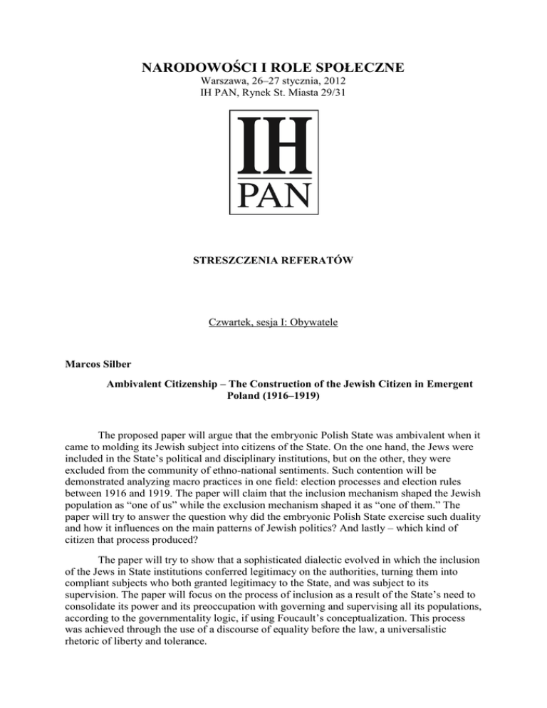 NARODOWOŚCI I ROLE SPOŁECZNE Warszawa, 26–27 stycznia, 2012 IH PAN, Rynek St. Miasta 29/31 STRESZCZENIA REFERATÓW Czwartek, sesja I: Obywatele Marcos Silber Ambivalent Citizenship – The Construction of the Jewish Citizen in Emergent Poland (1916–1919) The proposed paper will argue that the embryonic Polish State was ambivalent when it came to molding its Jewish subject into citizens of the State. On the one hand, the Jews were included in the State’s political and disciplinary institutions, but on the other, they were excluded from the community of ethno-national sentiments. Such contention will be demonstrated analyzing macro practices in one field: election processes and election rules between 1916 and 1919. The paper will claim that the inclusion mechanism shaped the Jewish population as “one of us” while the exclusion mechanism shaped it as “one of them.” The paper will try to answer the question why did the embryonic Polish State exercise such duality and how it influences on the main patterns of Jewish politics? And lastly – which kind of citizen that process produced? The paper will try to show that a sophisticated dialectic evolved in which the inclusion of the Jews in State institutions conferred legitimacy on the authorities, turning them into compliant subjects who both granted legitimacy to the State, and was subject to its supervision. The paper will focus on the process of inclusion as a result of the State’s need to consolidate its power and its preoccupation with governing and supervising all its populations, according to the governmentality logic, if using Foucault’s conceptualization. This process was achieved through the use of a discourse of equality before the law, a universalistic rhetoric of liberty and tolerance. However, such discourse served as a front for the ethno-national motive of anchoring ethnic distinctiveness in an institutional system of social and political inequality. My claim is that this dialectic led to the bankruptcy of the model of universal citizenship, blind to ascriptive differences and its replacement by the model of differential citizenship. The use of a universalistic discourse to preserve an ethno-national hierarchy, and the use of a democratic rhetoric to restrict rights, led to the collapse of the Jewish political leadership that embraced integration and universal citizenship, a political segment central and even hegemonic in the pre World War I period, and to its replacement by any other leadership, which its rising was meteoric during the Great War, that advocated differential citizenship. The dynamic trapped the Jewish minority in the same process of duality. On the one hand, the weakness of a civil identity turned the Jews into “alien” citizens, members of a group with interests foreign to the state. On the other hand, the very process that was supposed to turn Jews into legitimate citizens enabled the Jewish political leadership to voice their demands forcefully, sometimes in a manner that antagonized their opponents. Such dichotomous tension which emerged in the First World War, continued well into the interwar period, too. Shoshana Ronen Ozjasz Thon – Jewish Nation in Multi-National Polish State Ozjasz Thon (Lvov 1870 – Krakow1936), the Rabbi of Tempel, the progressive synagogue in Krakow (1897–1936), a member of the Polish parliament (1919–1935), a zealous Zionist thinker and activist. I would like to present the complexity of his concept of “Nation” in general, of the Jewish nation in particular, of the Jewish nation in Poland, and how it all fit together with his loyalty to the Polish state as a Polish citizen, a politician, and a Jew. This presentation will based mainly on his writing in Hebrew, but also Polish and German. According to Thon the Jews are not only a religious group but also a nation. He would like the Jews to have a stronger national identity. At the end of the nineteenth century and at the beginning of the twentieth century he observes the Jews as having a spiritual crisis because, as he sees it, the nation lost belief in its national future. His Zionism was a result of his concern for the spiritual state of the Jews. Nationalism is a remedy for a spiritual and mental degeneration. The future Jewish state should be, first of all, a spiritual and political center of the Jews. However, Zionism is not the only solution for the Jews. Not all the Jews should and will emigrate to Palestine, most of them will remain in the diaspora where they’ll cultivate their creative and spiritual life. Thon underlines also the idea of freedom. The Jews, in this time, are not free, but they can become free and it has a major value. True freedom, he argues, is not expressed only in the rights of the individual, but also in self-sovereignty. Ethnic or religious groups should decide of their future. Minority groups, in his view, should have equal rights to express their cultural, faithful, and habitual uniqueness whenever they live. “We don’t want any kind of Chauvinism” he said, “but only human dignity and human independence”. Anna Novikov Creation of the ‘New Pole’: Jews and Silesians in the Eastern Upper Silesia (1921–1934) After the plebiscite in the Upper Silesian region was conducted (1921), its eastern part – the Silesian Voivodeship with Kattowitz as its capital – was finally shifted from Germany to Poland. At the time of the plebiscite, the non-national minorities, namely, the Silesians and the Jews had to decide about their national affiliation, whereas neither of these groups considered itself either German or Polish. These new Polish citizens in the city now called Katowice, can be said migrated without actually migrating when the borders shifted. They had to rapidly redefine themselves in a national way according to the government’s demands. From the regional authorities’ point of view, both these groups were relatively easy targets for the process of Polo