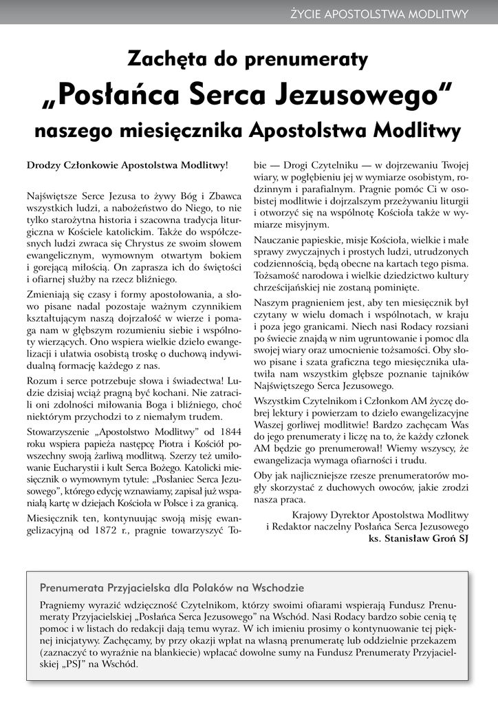 życie apostolstwa modlitwy Zachęta do prenumeraty „Posłańca Serca Jezusowego” naszego miesięcznika Apostolstwa Modlitwy Drodzy Członkowie Apostolstwa Modlitwy! Najświętsze Serce Jezusa to żywy Bóg i Zbawca wszystkich ludzi, a nabożeństwo do Niego, to nie tylko starożytna historia i szacowna tradycja liturgiczna w Kościele katolickim. Także do współczesnych ludzi zwraca się Chrystus ze swoim słowem ewangelicznym, wymownym otwartym bokiem i gorejącą miłością. On zaprasza ich do świętości i ofiarnej służby na rzecz bliźniego. Zmieniają się czasy i formy apostołowania, a słowo pisane nadal pozostaje ważnym czynnikiem kształtującym naszą dojrzałość w wierze i pomaga nam w głębszym rozumieniu siebie i wspólnoty wierzących. Ono wspiera wielkie dzieło ewangelizacji i ułatwia osobistą troskę o duchową indywidualną formację każdego z nas. Rozum i serce potrzebuje słowa i świadectwa! Ludzie dzisiaj wciąż pragną być kochani. Nie zatracili oni zdolności miłowania Boga i bliźniego, choć niektórym przychodzi to z niemałym trudem. Stowarzyszenie „Apostolstwo Modlitwy” od 1844 roku wspiera papieża następcę Piotra i Kościół powszechny swoją żarliwą modlitwą. Szerzy też umiłowanie Eucharystii i kult Serca Bożego. Katolicki miesięcznik o wymownym tytule: „Posłaniec Serca Jezusowego”, którego edycję wznawiamy, zapisał już wspaniałą kartę w dziejach Kościoła w Polsce i za granicą. Miesięcznik ten, kontynuując swoją misję ewangelizacyjną od 1872 r., pragnie towarzyszyć To- bie — Drogi Czytelniku — w dojrzewaniu Twojej wiary, w pogłębieniu jej w wymiarze osobistym, rodzinnym i parafialnym. Pragnie pomóc Ci w osobistej modlitwie i dojrzalszym przeżywaniu liturgii i otworzyć się na wspólnotę Kościoła także w wymiarze misyjnym. Nauczanie papieskie, misje Kościoła, wielkie i małe sprawy zwyczajnych i prostych ludzi, utrudzonych codziennością, będą obecne na kartach tego pisma. Tożsamość narodowa i wielkie dziedzictwo kultury chrześcijańskiej nie zostaną pominięte. Naszym pragnieniem jest, aby ten miesięcznik był czytany w wielu domach i wspólnotach, w kraju i poza jego granicami. Niech nasi Rodacy rozsiani po świecie znajdą w nim ugruntowanie i pomoc dla swojej wiary oraz umocnienie tożsamości. Oby słowo pisane i szata graficzna tego miesięcznika ułatwiła nam wszystkim głębsze poznanie tajników Najświętszego Serca Jezusowego. Wszystkim Czytelnikom i Członkom AM życzę dobrej lektury i powierzam to dzieło ewangelizacyjne Waszej gorliwej modlitwie! Bardzo zachęcam Was do jego prenumeraty i liczę na to, że każdy członek AM będzie go prenumerował! Wiemy wszyscy, że ewangelizacja wymaga ofiarności i trudu. Oby jak najliczniejsze rzesze prenumeratorów mogły skorzystać z duchowych owoców, jakie zrodzi nasza praca. Krajowy Dyrektor Apostolstwa Modlitwy i Redaktor naczelny Posłańca Serca Jezusowego ks. Stanisław Groń SJ Prenumerata Przyjacielska dla Polaków na Wschodzie Pragniemy wyrazić wdzięczność Czytelnikom, którzy swoimi ofiarami wspierają Fundusz Prenumeraty Przyjacielskiej „Posłańca Serca Jezusowego” na Wschód. Nasi Rodacy bardzo sobie cenią tę pomoc i w listach do redakcji dają temu wyraz. W ich imieniu prosimy o kontynuowanie tej pięknej inicjatywy. Zachęcamy, by przy okazji wpłat na własną prenumeratę lub oddzielnie przekazem (zaznaczyć to wyraźnie na blankiecie) wpłacać dowolne sumy na Fundusz Prenumeraty Przyjacielskiej „PSJ” na Wschód. PRENUMERATA „Posłańca Serca Jezusowego” W POLSCE Cena detaliczna miesięcznika „PSJ” — 5,00 zł. Cena w prenumeracie indywidualnej (1 lub 2 egz.) — 4,50 zł. Cena w prenumeracie zbiorowej (minimum 3 egz.) — 4,20 zł. Koszt prenumeraty indywidualnej 1 egz.: na kwartał — 13,50 zł; na pół roku — 27,00 zł; na rok — 54,00 zł. Bank Handlowy w Warszawie S.A.; nr 66103015080000000801945023; Wydawnictwo WAM, Prenumerata Czasopism; ul. Kopernika 26, 31-501 Kraków tel. 12 62 93 291; e-mail: [email protected]; www.poslaniec.net Zachęć swoich bliskich i przyjaciół do prenumeraty „PSJ” i przekaż im poniższy blankiet!