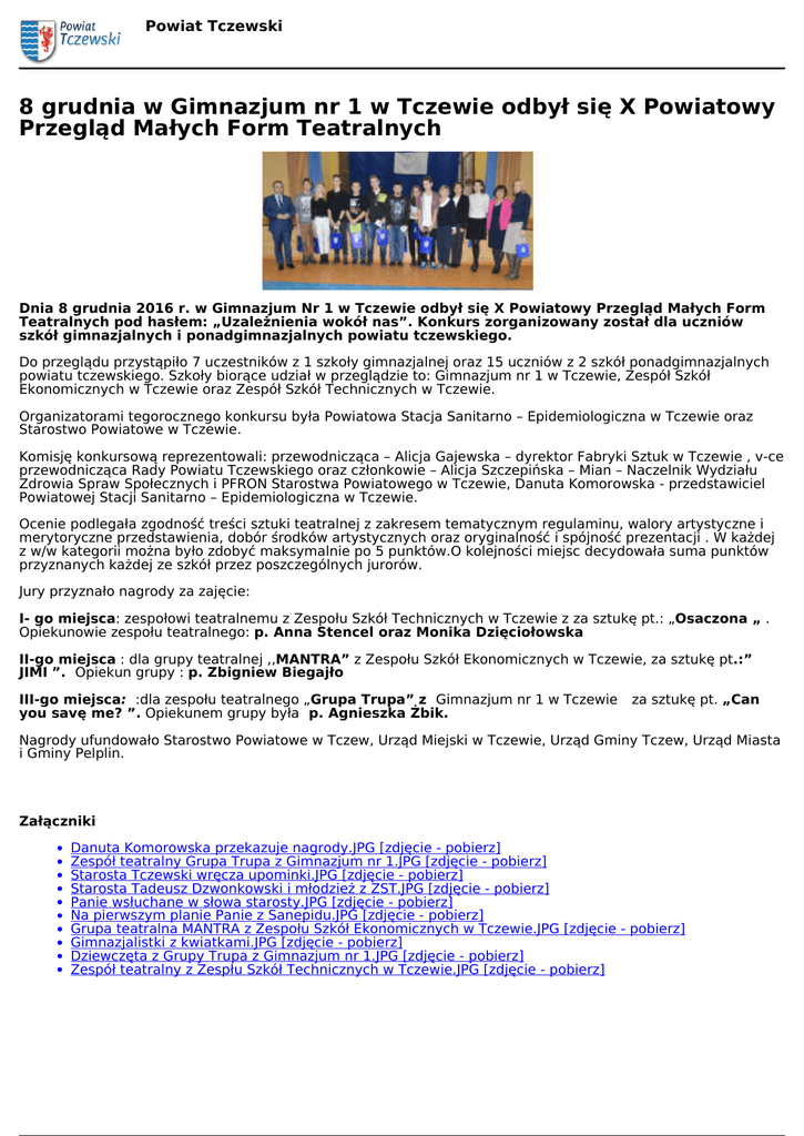 Powiat Tczewski 8 grudnia w Gimnazjum nr 1 w Tczewie odbył się X Powiatowy Przegląd Małych Form Teatralnych Dnia 8 grudnia 2016 r. w Gimnazjum Nr 1 w Tczewie odbył się X Powiatowy Przegląd Małych Form Teatralnych pod hasłem: „Uzależnienia wokół nas”. Konkurs zorganizowany został dla uczniów szkół gimnazjalnych i ponadgimnazjalnych powiatu tczewskiego. Do przeglądu przystąpiło 7 uczestników z 1 szkoły gimnazjalnej oraz 15 uczniów z 2 szkół ponadgimnazjalnych powiatu tczewskiego. Szkoły biorące udział w przeglądzie to: Gimnazjum nr 1 w Tczewie, Zespół Szkół Ekonomicznych w Tczewie oraz Zespół Szkół Technicznych w Tczewie. Organizatorami tegorocznego konkursu była Powiatowa Stacja Sanitarno – Epidemiologiczna w Tczewie oraz Starostwo Powiatowe w Tczewie. Komisję konkursową reprezentowali: przewodnicząca – Alicja Gajewska – dyrektor Fabryki Sztuk w Tczewie , v-ce przewodnicząca Rady Powiatu Tczewskiego oraz członkowie – Alicja Szczepińska – Mian – Naczelnik Wydziału Zdrowia Spraw Społecznych i PFRON Starostwa Powiatowego w Tczewie, Danuta Komorowska - przedstawiciel Powiatowej Stacji Sanitarno – Epidemiologiczna w Tczewie. Ocenie podlegała zgodność treści sztuki teatralnej z zakresem tematycznym regulaminu, walory artystyczne i merytoryczne przedstawienia, dobór środków artystycznych oraz oryginalność i spójność prezentacji . W każdej z w/w kategorii można było zdobyć maksymalnie po 5 punktów.O kolejności miejsc decydowała suma punktów przyznanych każdej ze szkół przez poszczególnych jurorów. Jury przyznało nagrody za zajęcie: I- go miejsca: zespołowi teatralnemu z Zespołu Szkół Technicznych w Tczewie z za sztukę pt.: „Osaczona „ . Opiekunowie zespołu teatralnego: p. Anna Stencel oraz Monika Dzięciołowska II-go miejsca : dla grupy teatralnej ,,MANTRA” z Zespołu Szkół Ekonomicznych w Tczewie, za sztukę pt.:” JIMI ”. Opiekun grupy : p. Zbigniew Biegajło III-go miejsca: :dla zespołu teatralnego „Grupa Trupa” z Gimnazjum nr 1 w Tczewie you savę me? ”. Opiekunem grupy była p. Agnieszka Żbik. za sztukę pt. „Can Nagrody ufundowało Starostwo Powiatowe w Tczew, Urząd Miejski w Tczewie, Urząd Gminy Tczew, Urząd Miasta i Gminy Pelplin. Załączniki Danuta Komorowska przekazuje nagrody.JPG [zdjęcie - pobierz] Zespół teatralny Grupa Trupa z Gimnazjum nr 1.JPG [zdjęcie - pobierz] Starosta Tczewski wręcza upominki.JPG [zdjęcie - pobierz] Starosta Tadeusz Dzwonkowski i młodzież z ZST.JPG [zdjęcie - pobierz] Panie wsłuchane w słowa starosty.JPG [zdjęcie - pobierz] Na pierwszym planie Panie z Sanepidu.JPG [zdjęcie - pobierz] Grupa teatralna MANTRA z Zespołu Szkół Ekonomicznych w Tczewie.JPG [zdjęcie - pobierz] Gimnazjalistki z kwiatkami.JPG [zdjęcie - pobierz] Dziewczęta z Grupy Trupa z Gimnazjum nr 1.JPG [zdjęcie - pobierz] Zespół teatralny z Zespłu Szkół Technicznych w Tczewie.JPG [zdjęcie - pobierz] Powered by TCPDF (www.tcpdf.org)