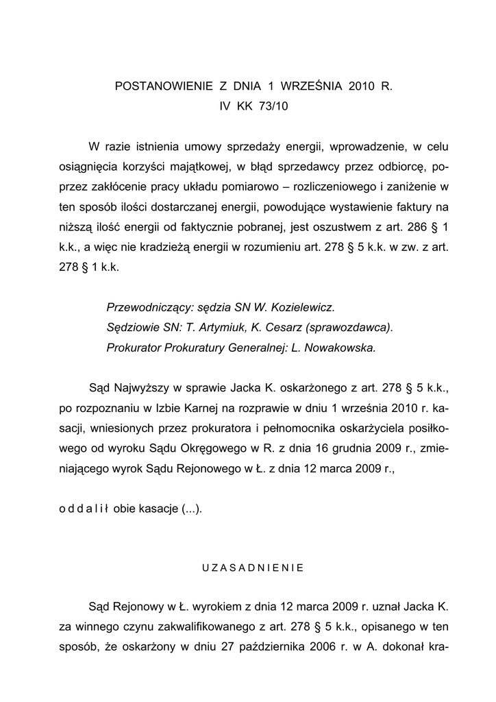 POSTANOWIENIE Z DNIA 1 WRZEŚNIA 2010 R. IV KK 73/10 W razie istnienia umowy sprzedaży energii, wprowadzenie, w celu osiągnięcia korzyści majątkowej, w błąd sprzedawcy przez odbiorcę, poprzez zakłócenie pracy układu pomiarowo – rozliczeniowego i zaniżenie w ten sposób ilości dostarczanej energii, powodujące wystawienie faktury na niższą ilość energii od faktycznie pobranej, jest oszustwem z art. 286 § 1 k.k., a więc nie kradzieżą energii w rozumieniu art. 278 § 5 k.k. w zw. z art. 278 § 1 k.k. Przewodniczący: sędzia SN W. Kozielewicz. Sędziowie SN: T. Artymiuk, K. Cesarz (sprawozdawca). Prokurator Prokuratury Generalnej: L. Nowakowska. Sąd Najwyższy w sprawie Jacka K. oskarżonego z art. 278 § 5 k.k., po rozpoznaniu w Izbie Karnej na rozprawie w dniu 1 września 2010 r. kasacji, wniesionych przez prokuratora i pełnomocnika oskarżyciela posiłkowego od wyroku Sądu Okręgowego w R. z dnia 16 grudnia 2009 r., zmieniającego wyrok Sądu Rejonowego w Ł. z dnia 12 marca 2009 r., o d d a l i ł obie kasacje (...). UZASADNIENIE Sąd Rejonowy w Ł. wyrokiem z dnia 12 marca 2009 r. uznał Jacka K. za winnego czynu zakwalifikowanego z art. 278 § 5 k.k., opisanego w ten sposób, że oskarżony w dniu 27 października 2006 r. w A. dokonał kra- 2 dzieży energii elektrycznej, poprzez połączenie zacisków „k” i „l” strony wtórnej przekładników prądowych na wszystkich trzech fazach w celu zafałszowania wskazań pobieranej energii elektrycznej na szkodę Zakładu Energetycznego w R., i na podstawie wymienionego przepisu wymierzył karę 10 miesięcy pozbawienia wolności, warunkowo zawieszając jej wykonanie na okres próby 2 lat, orzekł grzywnę w wysokości 60 stawek dziennych po 20 zł za stawkę i obciążył oskarżonego kosztami sądowymi. Apelację od tego wyroku złożył jedynie obrońca oskarżonego, który zarzucił obrazę szeregu przepisów postępowania i błędy w ustaleniach faktycznych, w tym bezpodstawne przyjęcie, że „kradzież energii elektrycznej polega nie tylko na jej faktycznym zaborze, ale także na uniemożliwieniu dokonania pomiaru oddawanej energii elektrycznej mimo, że przepis art. 278 § 5 k.k. przewiduje tylko zabór energii elektrycznej, a nie jej oddawanie z pominięciem układu pomiarowego”, po czym wniósł o zmianę wyroku przez uniewinnienie oskarżonego od przypisanego mu czynu, albo uchylenie zaskarżonego wyroku i przekazanie sprawy Sądowi Rejonowemu do ponownego rozpoznania. Wyrokiem z dnia 16 grudnia 2009 r. Sąd Okręgowy w R. zmienił zaskarżony wyrok i uniewinnił Jacka K. „od zarzutu popełnienia przestępstwa z art. 278 § 5 k.k. objętego aktem oskarżenia”, zaś kosztami procesu obciążył Skarb Państwa. Sąd odwoławczy uznał, że działanie oskarżonego „rozpatrywać należy w kategoriach art. 13 § 1 k.k. w zw. z art. 286 § 1 k.k., co w zaistniałej sytuacji procesowej wobec niemożności ingerencji w treść zaskarżonego rozstrzygnięcia na niekorzyść oskarżonego nie jest już jednak możliwe”. Kasacje od tego wyroku złożyli: prokurator i pełnomocnik oskarżyciela posiłkowego – PGE Obrót S.A., zarzucając w nich obrazę prawa materialnego w postaci art. 278 § 5 k.k., przez niezasadne przyjęcie, że zachowanie oskarżonego nie wypełniło znamion tego przepisu. Skarżący wnosili 3 o uchylenie zaskarżonego wyroku i przekazanie sprawy Sądowi Okręgowemu w R. do ponownego rozpoznania. Sąd Najwyższy zważył, co następuje. Skargi kasacyjne nie mogą być uwzględnione. Obie jako wiodący argument powołują pogląd Sądu Najwyższego wyrażony w uzasadnieniu wyroku z dnia 26 lutego 2004 r. (IV KK 302/03, OSPriPr, z. 7-8, poz. 2), że „przestępstwo kradzieży energii (elektrycznej, gazowej, cieplnej, wodnej, atomowej) uregulowane w art. 278 § 5 k.k. polega na bezprawnym uzyskaniu dostępu do źródła energii i korzystaniu z tej energii z pominięciem przyjmowanego w stosunkach danego rodzaju sposobu uzyskiwania lub korzystania z określonego rodzaju energii. Kradzież energii może przybierać różne formy czynności wykonawczej. Może ona polegać na podłączeniu do systemu dostarczającego dany rodzaj energii z pominięciem urządzenia mierzącego ilość wykorzystanej energii oraz określającego wysokość opłaty za korzystanie. Przejawem kradzieży energii będzie uszkodzenie urządzenia rejestrującego ilość pobranej energii, które następuje po legalnym przyłączeniu się sprawcy do systemu dostarczającego dany rodzaj energii, a także dokonywanie zmian zapisu w urządzeniach rejestrujących ilość pobranej energii w taki sposób, iż nie zawiera informacji o faktycznie wykorzystanej przez sprawcę ilości energii (tzw. cofanie licznika). Do znamion występku określonego w art. 278 § 5 k.k. należy skutek w postaci przejęcia w posiadanie lub zużytkowania odpowiedniego rodzaju energii bez względu na wielkość (wartość szkody).” Stanowisko to, bliżej nieumotywowane, zostało zaprezentowane tylko przy sposobności rozstrzygania problemu, czy niemożność wyliczenia wysokości szkody (wartości pobranej energii) musi prowadzić do ekskulpacji oskarżonego. W tej kwestii Sąd Najwyższy wypowiedział się w ostatnim zdaniu przytoczonej wyżej tezy, podtrzymując zapatrywanie zawarte w uzasadnieniu uchwały z dnia 13 grudnia 2000 r., I KZP 43/00, OSNKW 4 2001, z. 1-2, poz. 4. W uchwale tej wyrażony został kluczowy dla rozumienia art. 278 § 5 k.k. i rozstrzygnięcia kasacji pogląd, że zawarte w nim sformułowanie „Przepisy § 1, 3 i 4 stosuje się odpowiednio”, oznacza zastosowanie do wypadku kradzieży energii wyłącznie znamion przestępstwa kradzieży i przewidzianych za to przestępstwo sankcji. W konsekwencji, art. 278 § 5 k.k. należy odczytywać następująco: Kto zabiera w celu przywłaszczenia energię, podlega karze pozbawienia wolności od 3 miesięcy do 5 lat. Do wyodrębnienia kradzieży energii w oddzielnym przepis