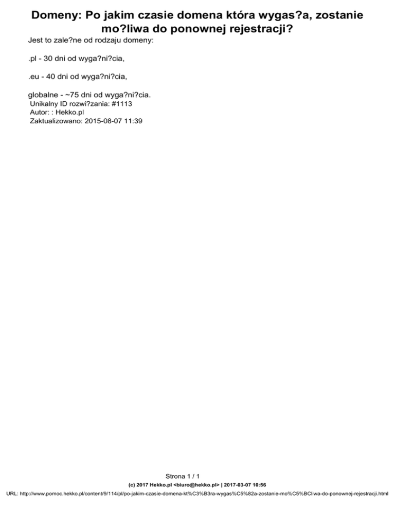 Domeny: Po jakim czasie domena która wygas?a, zostanie mo?liwa do ponownej rejestracji? Jest to zale?ne od rodzaju domeny: .pl - 30 dni od wyga?ni?cia, .eu - 40 dni od wyga?ni?cia, globalne - ~75 dni od wyga?ni?cia. Unikalny ID rozwi?zania: #1113 Autor: : Hekko.pl Zaktualizowano: 2015-08-07 11:39 Strona 1 / 1 (c) 2017 Hekko.pl <[email protected]> | 2017-03-07 10:56 URL: http://www.pomoc.hekko.pl/content/9/114/pl/po-jakim-czasie-domena-kt%C3%B3ra-wygas%C5%82a-zostanie-mo%C5%BCliwa-do-ponownej-rejestracji.html Powered by TCPDF (www.tcpdf.org)