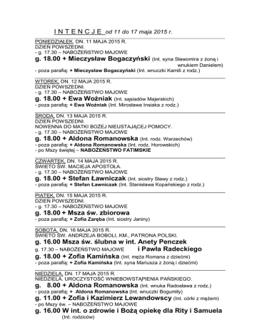 I N T E N C J E od 11 do 17 maja 2015 r. ___________________________________________________________________________________________________ PONIEDZIAŁEK, DN. 11 MAJA 2015 R. DZIEŃ POWSZEDNI. - g. 17.30 – NABOŻEŃSTWO MAJOWE g. 18.00 + Mieczysław Bogaczyński (Int. syna Sławomira z żoną i wnukiem Danielem) - poza parafią: + Mieczysław Bogaczyński (Int. wnuczki Kamili z rodz.) __________________________________________________________________ WTOREK, DN. 12 MAJA 2015 R. DZIEŃ POWSZEDNI. - g. 17.30 – NABOŻEŃSTWO MAJOWE g. 18.00 + Ewa Woźniak (Int. sąsiadów Majerskich) - poza parafią: + Ewa Woźniak (Int. Mirosława Insiaka z rodz.) __________________________________________________________________ ŚRODA, DN. 13 MAJA 2015 R. DZIEŃ POWSZEDNI. NOWENNA DO MATKI BOŻEJ NIEUSTAJĄCEJ POMOCY. - g. 17.30 – NABOŻEŃSTWO MAJOWE g. 18.00 + Aldona Romanowska (Int. rodz. Warzechów) - poza parafią: + Aldona Romanowska (Int. rodz. Horowskich) - po Mszy świętej – NABOŻEŃSTWO FATIMSKIE __________________________________________________________________ CZWARTEK, DN. 14 MAJA 2015 R. ŚWIETO ŚW. MACIEJA APOSTOŁA. - g. 17.30 – NABOŻEŃSTWO MAJOWE g. 18.00 + Stefan Ławniczak (Int. siostry Sławy z rodz.) - poza parafią: + Stefan Ławniczak (Int. Stanisława Kopańskiego z rodz.) __________________________________________________________________ PIĄTEK, DN. 15 MAJA 2015 R. DZIEŃ POWSZEDNI. - g. 17.30 – NABOŻEŃSTWO MAJOWE g. 18.00 + Msza św. zbiorowa - poza parafią: + Zofia Zaręba (Int. siostry Janiny) __________________________________________________________________ SOBOTA, DN. 16 MAJA 2015 R. ŚWIETO ŚW. ANDRZEJA BOBOLI, KM., PATRONA POLSKI. g. 16.00 Msza św. ślubna w int. Anety Penczek g. 17.30 – NABOŻEŃSTWO MAJOWE i Pawła Radeckiego g. 18.00 + Zofia Kamińska (Int. męża Romana z dziećmi) - poza parafią: + Zofia Kamińska (Int. syna Mariusza z żoną i dziećmi) __________________________________________________________________ NIEDZIELA, DN. 17 MAJA 2015 R. NIEDZIELA. UROCZYSTOŚĆ WNIEBOWSTĄPIENIA PAŃSKIEGO. g. 8.00 + Aldona Romanowska (Int. wnuka Radosława z rodz.) - poza parafią: + Aldona Romanowska (Int. wnuczki Bogumiły) g. 11.00 + Zofia i Kazimierz Lewandowscy (Int. córki z mężem) - po Mszy św. – NABOŻEŃSTWO MAJOWE g. 16.00 W int. o zdrowie i Bożą opiekę dla Rity i Samuela (Int. rodziców)