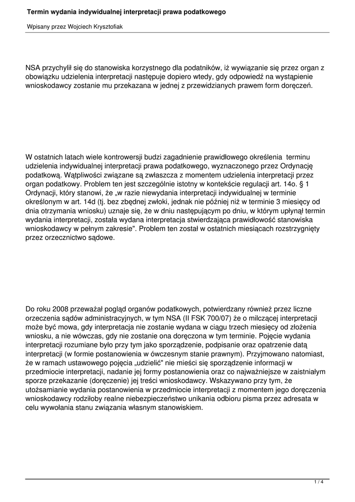 Termin wydania indywidualnej interpretacji prawa podatkowego Wpisany przez Wojciech Krysztofiak NSA przychylił się do stanowiska korzystnego dla podatników, iż wywiązanie się przez organ z obowiązku udzielenia interpretacji następuje dopiero wtedy, gdy odpowiedź na wystąpienie wnioskodawcy zostanie mu przekazana w jednej z przewidzianych prawem form doręczeń. W ostatnich latach wiele kontrowersji budzi zagadnienie prawidłowego określenia terminu udzielenia indywidualnej interpretacji prawa podatkowego, wyznaczonego przez Ordynację podatkową. Wątpliwości związane są zwłaszcza z momentem udzielenia interpretacji przez organ podatkowy. Problem ten jest szczególnie istotny w kontekście regulacji art. 14o. § 1 Ordynacji, który stanowi, że „w razie niewydania interpretacji indywidualnej w terminie określonym w art. 14d (tj. bez zbędnej zwłoki, jednak nie później niż w terminie 3 miesięcy od dnia otrzymania wniosku) uznaje się, że w dniu następującym po dniu, w którym upłynął termin wydania interpretacji, została wydana interpretacja stwierdzająca prawidłowość stanowiska wnioskodawcy w pełnym zakresie". Problem ten został w ostatnich miesiącach rozstrzygnięty przez orzecznictwo sądowe. Do roku 2008 przeważał pogląd organów podatkowych, potwierdzany również przez liczne orzeczenia sądów administracyjnych, w tym NSA (II FSK 700/07) że o milczącej interpretacji może być mowa, gdy interpretacja nie zostanie wydana w ciągu trzech miesięcy od złożenia wniosku, a nie wówczas, gdy nie zostanie ona doręczona w tym terminie. Pojęcie wydania interpretacji rozumiane było przy tym jako sporządzenie, podpisanie oraz opatrzenie datą interpretacji (w formie postanowienia w ówczesnym stanie prawnym). Przyjmowano natomiast, że w ramach ustawowego pojęcia „udzielić" nie mieści się sporządzenie informacji w przedmiocie interpretacji, nadanie jej formy postanowienia oraz co najważniejsze w zaistniałym sporze przekazanie (doręczenie) jej treści wnioskodawcy. Wskazywano przy tym, że utożsamianie wydania postanowienia w przedmiocie interpretacji z momentem jego doręczenia wnioskodawcy rodziłoby realne niebezpieczeństwo unikania odbioru pisma przez adresata w celu wywołania stanu związania własnym stanowiskiem. 1/4 Termin wydania indywidualnej interpretacji prawa podatkowego Wpisany przez Wojciech Krysztofiak Przełomowe znaczenie dla kwestii obliczenia terminu udzielenia interpretacji ma rozstrzygnięcie podjęte w formie uchwały siedmiu sędziów Naczelnego Sądu Administracyjnego z 4 listopada 2008 r. (sygnatura I FPS 2/08). NSA przychylił się do stanowiska korzystnego dla podatników, iż wywiązanie się przez organ z obowiązku udzielenia interpretacji następuje dopiero wtedy, gdy odpowiedź na wystąpienie wnioskodawcy zostanie mu przekazana, w jednej z przewidzianych prawem form doręczeń. Praktyczną konsekwencją wydanej uchwały jest to, iż w wyznaczonym przez Ordynację podatkową trzymiesięcznym terminie urzędnicy przygotowujący interpretację podatkową muszą ją nie tylko sporządzić i podpisać, co czynili dotychczas, ale także dostarczyć wnioskodawcy. W uzasadnieniu uchwały Sąd podkreślił, że dotychczasowa praktyka nie wyłączała ryzyka nadużycia prawa w sensie możliwości antydatowania sporządzanych przez właściwy organ interpretacji. Istniejące w omawianej sprawie orzecznictwo podkreśla w pierwszej kolejności, że interpretację indywidualną wydaje się bez zbędnej zwłoki, co oznacza, że jest to podstawowa przesłanka określania terminu przewidzianego dla załatwienia sprawy. Dotyczy on również sytuacji, gdy konieczne jest przeprowadzenia postępowania wyjaśniającego. Termin trzymiesięczny, który organy podatkowe uznawały za termin zasadniczy dla wydania interpretacji indywidualnej prawa podatkowego, jest terminem ostatecznym. Przepis art. 14d Ordynacji zawiera dyspozycję, iż organy w toku postępowania mają w taki sposób organizować podejmowane czynności, by załatwić sprawę i wydać stosowne rozstrzygnięcie bez zbędnej zwłoki. Trzymiesięczny termin na wydanie indywidualnej pisemnej interpretacji i tak jest terminem dłuższym niż zasadniczy termin na załatwienie sprawy liczony na podstawie art. 139 § 1 Ordynacji podatkowej. Przedłużanie zatem terminu wydania interpretacji indywidualnych powinno być zarezerwowane wyłącznie dla spraw szczególnie skomplikowanych; nie powinno stanowić normy zachowania organu podatkowego. Kolejną praktyczną wskazówką dla podatników zainteresowanych złożeniem wniosku jest to, iż trzymiesięczny termin na wydanie interpretacji liczony jest od dnia otrzymania pytania przez Biuro Krajowej Informacji Podatkowej, a nie od daty jego nadania na poczcie. Dlatego istotne jest posiadanie przez wnioskodawcę potwierdzenia odbioru wniosku (a nie tylko nadania). Informacja taka pozwoli ustalić, kiedy upływa czas przewidziany na udzielenie odpowiedzi przez organ podatkowy. W chwili powstania sporu z organem podatkowym, dokument potwierdzenia 2/4 Termin wydania indywidualnej interpretacji prawa podatkowego Wpisany przez Wojciech Krysztofiak odbioru będzie kluczowym dowodem toczącego się postępowania. Okres przewidziany na wydanie indywidualnej interpretacji prawa podatkowego ulega przedłużeniu w wyjątkowych sytuacjach. Zgodnie z regulacją art. 14d w zw. z art. 139 § 4 Ordynacji do trzymiesięcznego terminu na udzielenie interpretacji nie wlicza się terminów przewidzianych w przepisach prawa podatkowego dla dokonania określonych czynności, okresów zawieszenia postępowania oraz okresów opóźnień spowodowanych z winy strony albo z przyczyn niezależnych od organu. O ile nie budzi wątpliwości przesunięcie terminu udzielenia interpretacji w przypadku terminów przewidzianych w przepisach prawa podatkowego związanych np. z wezwaniem wnioskodawcy do usunięcia braków (art. 169 § 1 Ordynacji) oraz okresó