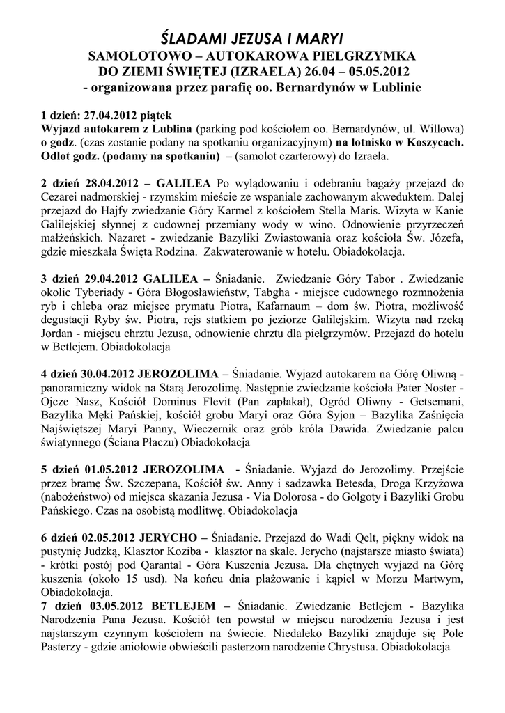 ŚLADAMI JEZUSA I MARYI SAMOLOTOWO – AUTOKAROWA PIELGRZYMKA DO ZIEMI ŚWIĘTEJ (IZRAELA) 26.04 – 05.05.2012 - organizowana przez parafię oo. Bernardynów w Lublinie 1 dzień: 27.04.2012 piątek Wyjazd autokarem z Lublina (parking pod kościołem oo. Bernardynów, ul. Willowa) o godz. (czas zostanie podany na spotkaniu organizacyjnym) na lotnisko w Koszycach. Odlot godz. (podamy na spotkaniu) – (samolot czarterowy) do Izraela. 2 dzień 28.04.2012 – GALILEA Po wylądowaniu i odebraniu bagaży przejazd do Cezarei nadmorskiej - rzymskim mieście ze wspaniale zachowanym akweduktem. Dalej przejazd do Hajfy zwiedzanie Góry Karmel z kościołem Stella Maris. Wizyta w Kanie Galilejskiej słynnej z cudownej przemiany wody w wino. Odnowienie przyrzeczeń małżeńskich. Nazaret - zwiedzanie Bazyliki Zwiastowania oraz kościoła Św. Józefa, gdzie mieszkała Święta Rodzina. Zakwaterowanie w hotelu. Obiadokolacja. 3 dzień 29.04.2012 GALILEA – Śniadanie. Zwiedzanie Góry Tabor . Zwiedzanie okolic Tyberiady - Góra Błogosławieństw, Tabgha - miejsce cudownego rozmnożenia ryb i chleba oraz miejsce prymatu Piotra, Kafarnaum – dom św. Piotra, możliwość degustacji Ryby św. Piotra, rejs statkiem po jeziorze Galilejskim. Wizyta nad rzeką Jordan - miejscu chrztu Jezusa, odnowienie chrztu dla pielgrzymów. Przejazd do hotelu w Betlejem. Obiadokolacja 4 dzień 30.04.2012 JEROZOLIMA – Śniadanie. Wyjazd autokarem na Górę Oliwną panoramiczny widok na Starą Jerozolimę. Następnie zwiedzanie kościoła Pater Noster Ojcze Nasz, Kościół Dominus Flevit (Pan zapłakał), Ogród Oliwny - Getsemani, Bazylika Męki Pańskiej, kościół grobu Maryi oraz Góra Syjon – Bazylika Zaśnięcia Najświętszej Maryi Panny, Wieczernik oraz grób króla Dawida. Zwiedzanie palcu świątynnego (Ściana Płaczu) Obiadokolacja 5 dzień 01.05.2012 JEROZOLIMA - Śniadanie. Wyjazd do Jerozolimy. Przejście przez bramę Św. Szczepana, Kościół św. Anny i sadzawka Betesda, Droga Krzyżowa (nabożeństwo) od miejsca skazania Jezusa - Via Dolorosa - do Golgoty i Bazyliki Grobu Pańskiego. Czas na osobistą modlitwę. Obiadokolacja 6 dzień 02.05.2012 JERYCHO – Śniadanie. Przejazd do Wadi Qelt, piękny widok na pustynię Judzką, Klasztor Koziba - klasztor na skale. Jerycho (najstarsze miasto świata) - krótki postój pod Qarantal - Góra Kuszenia Jezusa. Dla chętnych wyjazd na Górę kuszenia (około 15 usd). Na końcu dnia plażowanie i kąpiel w Morzu Martwym, Obiadokolacja. 7 dzień 03.05.2012 BETLEJEM – Śniadanie. Zwiedzanie Betlejem - Bazylika Narodzenia Pana Jezusa. Kościół ten powstał w miejscu narodzenia Jezusa i jest najstarszym czynnym kościołem na świecie. Niedaleko Bazyliki znajduje się Pole Pasterzy - gdzie aniołowie obwieścili pasterzom narodzenie Chrystusa. Obiadokolacja 8 dzień 04.05.2012 JEROZOLIMA – Śniadanie i wykwaterowanie z hotelu. Przejazd do Ein Karem (kościół Nawiedzenia św. Elżbiety i Narodzenia św. Jana Chrziciela). Wizyta pod Knessetem – Parlament Izraelski. Po południu czas na zakupy na tradycyjnym bazarze. Na koniec pobytu w Ziemi Świętej odpoczynek jako specjalny wieczór w namiocie Beduińskim (restauracja) ze specjalną kolacją. Wieczorem wyjazd na lotnisko, odprawa paszportowa, odlot do Polski. 9 dzień 05.05.2012 Lublin Po przylocie podstawionym autokarem powrót do Lublina (przewidziany przyjazd około godz. 14:00) Program jest ramowy (orientacyjny), kolejność realizacji poszczególnych punktów programu może ulec zmianie lub przestawieniu. W miarę możliwości czasowych, program może ulec rozszerzeniu. Msza święta w miarę możliwości codziennie w wybranym sanktuarium. Cena: 620 Euro (płatne na spotkaniu) + opłata za dojazd na lotnisko oraz ok. 100 USD (na wydatki w Izraelu) Świadczenia: - przelot samolotem Koszyce – Tel Aviv – Koszyce (SK) - ubezpieczenie KL i NNW - Na miejscu przejazdy klimatyzowanym autokarem w miejsca zwiedzania - polskojęzyczny przewodnik, - hotele *** ze śniadaniem i obiadokolacją pokoje 2-3 osobowe z łazienką. - Wszystkie wstępy płatne do obiektów podanych w programie plus napiwki - dodatkowo 75 usd płatne po przylocie do Izraela przewodnikowi (w tym m. in. - taksówka na Górę Tabor - prom po jeziorze Galilejskim - wieczór Beduiński Uwaga: Napoje do kolacji płatne dodatkowo Spotkanie informacyjne odbędzie się w niedzielę 18 marca o godz. 15 w salce klasztornej - Przypominamy o ważności paszportu minimum 6 miesięcy przed datą powrotu W zgłoszeniu (można dokonać osobiście lub przez Internet lub) należy podać: imiona i nazwisko, pesel, miejsce zamieszkania i nr tel. kontaktowego oraz numer i serię paszportu. - Zgłoszenia do wyczerpania miejsc - INFORMACJE I ZAPISY POD NUMEREM TELEFONU 604 695 927 v 509 903 503 oraz email: [email protected]