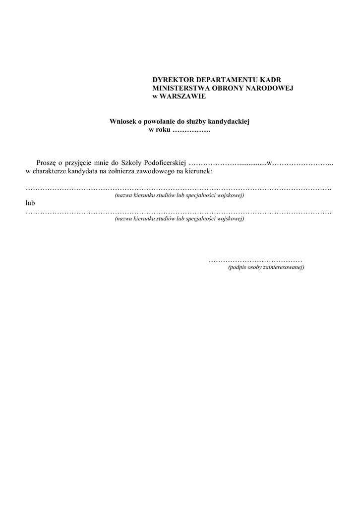 DYREKTOR DEPARTAMENTU KADR MINISTERSTWA OBRONY NARODOWEJ w WARSZAWIE Wniosek o powołanie do służby kandydackiej w roku ……………. Proszę o przyjęcie mnie do Szkoły Podoficerskiej …………………...............w…………………….. w charakterze kandydata na żołnierza zawodowego na kierunek: ………………………………………………………………………………………………………………. (nazwa kierunku studiów lub specjalności wojskowej) lub ………………………………………………………………………………………………………………. (nazwa kierunku studiów lub specjalności wojskowej) ………………………………… (podpis osoby zainteresowanej) KWESTIONARIUSZ OSOBOWY A. DANE DO CELÓW EWIDENCYJNYCH (W TYM DANE ADRESOWE MIEJSCA ZAMIESZKANIA) Nazwisko Pierwsze imię Drugie imię Nazwisko rodowe (kobiety) Imię ojca Imię matki Data urodzenia (dzień - miesiąc - rok) Miejsce urodzenia PESEL Adres e-mail Telefon kontaktowy Adres zamieszkania Ulica Nr domu Nr lokalu Miejscowość Poczta Województwo B. ADRES DO KORESPONDENCJI (jeżeli jest inny niż adres zamieszkania) Ulica Nr domu Nr lokalu Miejscowość Poczta Województwo C. WYKSZTAŁCENIE Rodzaj wykształcenia Nazwa szkoły Miejscowość Kierunek wykształcenia Rok uzyskania wykształcenia D. POSIADANE UPRAWNIENIA Rodzaj uprawnienia Data uzyskania uprawnienia Termin ważności uprawnienia E. PRZEBIEG PRACY ZAWODOWEJ Nazwa zakładu pracy Stanowisko Data rozpoczęcia pracy Data zakończenia pracy F. POSIADANE OBYWATELSTWA G. POSIADANE DOKUMENTY TOŻSAMOŚCI Nazwa Seria Nr Organ wydający H. STOSUNEK DO SŁUŻBY WOJSKOWEJ Uregulowany/nieuregulowany Seria i numer książeczki wojskowej Przydział terytorialny do WKU I. ZNAJOMOŚĆ JĘZYKÓW OBCYCH Język angielski Język obcy Poziom znajomości języka obcego: zaawansowany średni podstawowy Poziom znajomości języka obcego: zaawansowany średni podstawowy Inny język obcy J. ZAINTERESOWANIA K. DANE ANTROPOMETRYCZNE Wzrost Waga L. STAN CYWILNY Dzieci M. W RAZIE WYPADKU NALEŻY POWIADOMIĆ (IMIĘ, NAZWISKO I ADRES ZAMIESZKANIA WSKAZANEJ OSOBY) N. OŚWIADCZENIE Oświadczam, że dane podane we wniosku oraz oświadczeniu są zgodne ze stanem faktycznym i zobowiązuje się do poinformowania uczelni wojskowej /szkoły podoficerskiej/ ośrodka szkolenia* o każdej ich zmianie. *Niepotrzebne skreślić Data Podpis osoby zainteresowanej O. INFORMACJA DOTYCZĄCA EWENTUALNEGO ZWROTU KOSZTÓW NAUKI Zgodnie z postanowieniami art. 124 ust. 6 ustawy z dnia 11 września 2003 r. o służbie wojskowej żołnierzy zawodowych (Dz.U. z 2008 r. Nr 141, poz. 892, z późn. zm.) powołanie do służby kandydackiej może nastąpić po podpisaniu umowy z osobą ubiegającą się o przyjęcie do tej służby, określającej warunki zwrotu kosztów poniesionych na jej utrzymanie i naukę w przypadku: 1. zwolnienia ze służby kandydackiej na podstawie art. 134 ust. 1 pkt. 1 i 2 oraz 4-9; 2. niestawienia się do zawodowej służby wojskowej lub niepodpisania kontraktu na pełnienie służby kontraktowej; 3. zwolnienia z zawodowej służby wojskowej w okresie dwa razy dłuższym od czasu trwania nauki, na podstawie art. 111 pkt. 1,4,6 i 7, pkt. 9 lit. a i pkt. 11-16 oraz art. 112 ust. 1 pkt. 1, w wysokości proporcjonalnej do czasu służby po zakończeniu nauki. P. ZGODA NA PRZETWARZANIE DANYCH OSOBOWYCH Oświadczam, że zgadzam się na przetwarzanie, w rozumieniu art. 7 pkt. 2 ustawy z dnia 29 sierpnia 1997 r. o ochronie danych osobowych (Dz. U. z 2002 r., Nr 101, poz. 926, z późn. zm.), moich danych osobowych zawartych w niniejszym wniosku, z zastrzeżeniem ograniczeń wynikających w tym zakresie z wymienionej ustawy. Data Podpis osoby zainteresowanej R. ZAŁĄCZNIKI DO WNIOSKU Lp. Nazwa załącznika Uwagi S. ADNOTACJE (pracownik uczelni wojskowej/szkoły podoficerskiej/ośrodka szkolenia) Data przyjęcia dokumentów Numer Podpis pracownika Data odbioru dokumentów Data Decyzja Zobowiązuję się do uzupełnienia braków w złożonej dokumentacji do dnia ………………………………. Podpis osoby zainteresowanej Podpis osoby zainteresowanej T. ROZSTRZYGNIĘCIE KOMISJI REKRUTACYJNEJ Decyzją Komisji Rekrutacyjnej z dnia …………………………. osoba zainteresowana została przyjęta / nie została przyjęta* do uczelni wojskowej / szkoły podoficerskiej / ośrodka szkolenia * na kierunek (w specjalności wojskowej) ………………………………………………………………………………………………………………………………. (nazwa kierunku studiów lub specjalności wojskowej) ………………………………………………………………………………………………………………………………. *Niepotrzebne skreślić