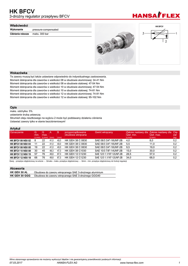 HK BFCV 3-drożny regulator przepływu BFCV Właściwości Wykonanie pressure-compensated Ciśnienie robocze maks. 300 bar Wskazówka Te zawory muszą być także ustawiane odpowiednio do indywidualnego zastosowania. Moment dokręcania dla zaworów o wielkości 08 w obudowie aluminiowej: 34-41 Nm Moment dokręcania dla zaworów o wielkości 08 w obudowie stalowej: 47-54 Nm Moment dokręcania dla zaworów o wielkości 10 w obudowie aluminiowej: 47-54 Nm Moment dokręcania dla zaworów o wielkości 10 w obudowie stalowej: 74-81 Nm Moment dokręcania dla zaworów o wielkości 12 w obudowie aluminiowej: 74-81 Nm Moment dokręcania dla zaworów o wielkości 12 w obudowie stalowej: 95-102 Nm Opis maks. odchyłka: 5% ustawianie śrubą ustawczą Strumień oleju resztkowego na wyjściu 2 może być poddawany działaniu ciśnienia Ustawiać zawory tylko w stanie bezciśnieniowym! Artykuł Oznaczenie HK HK HK HK HK HK BFCV BFCV BFCV BFCV BFCV BFCV 08 08 08 10 12 12 NS0 NS0 NS0 NS0 NS0 NS0 Q min. 02 03 05 08 15 18 Q A max. B (L/min) (L/min) (mm) (mm) 8 11 19 30 57 68 40,0 40,0 40,0 47,3 67,3 67,3 22 22 22 45 76 76 41,0 41,0 41,0 48,3 49,8 49,8 przyporządkowana obudowa wkręcana Gwint wkręcany Zakres nastawy dla Zakres nastawy dla Cię Qwł. min. Qwł. max. żar HK GEH 38 C 0830 HK GEH 38 C 0830 HK GEH 38 C 0830 HK GEH 38 C1030 HK GEH 12 C1230 HK GEH 12 C1230 SAE 08/3 3/4"-16UNF-2B SAE 08/3 3/4"-16UNF-2B SAE 08/3 3/4"-16UNF-2B SAE 10/3 7/8"-14UNF-2B SAE 12/3 1.1/16"-12UNF-2B SAE 12/3 1.1/16"-12UNF-2B (L/min) (L/min) (kg) 4,0 5,5 9,5 15,0 28,5 34,0 8,0 11,0 19,0 30,0 57,0 68,0 0,2 0,2 0,2 0,2 0,2 0,2 Qwej. - przepływ objętościowy na wlocie – Qmaks - maks. przepływ objętościowy – Qmin - min. przepływ objętościowy do funkcji regulacji Akcesoria HK GEH 30 AL HK GEH 30 GGG Obudowa do zaworu wkręcanego SAE 3-drożnego aluminium Obudowa do zaworu wkręcanego SAE 3-drożnego GGG40 Mimo starannego sprawdzenia nie możemy wykluczyć błędów i nie gwarantujemy prawidłowości podanych informacji. 07.03.2017 HANSA-FLEX AG www.hansa-flex.com 1
