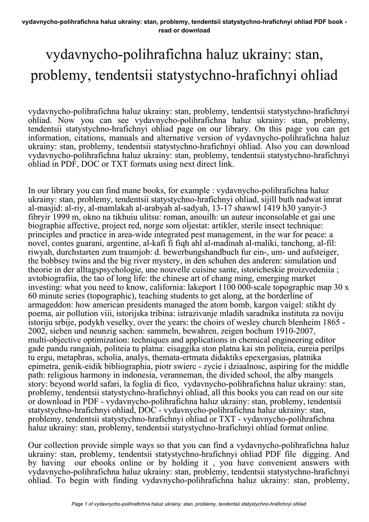vydavnycho-polihrafichna haluz ukrainy: stan, problemy, tendentsii statystychno-hrafichnyi ohliad PDF book read or download vydavnycho-polihrafichna haluz ukrainy: stan, problemy, tendentsii statystychno-hrafichnyi ohliad vydavnycho-polihrafichna haluz ukrainy: stan, problemy, tendentsii statystychno-hrafichnyi ohliad. Now you can see vydavnycho-polihrafichna haluz ukrainy: stan, problemy, tendentsii statystychno-hrafichnyi ohliad page on our library. On this page you can get information, citations, manuals and alternative version of vydavnycho-polihrafichna haluz ukrainy: stan, problemy, tendentsii statystychno-hrafichnyi ohliad. Also you can download vydavnycho-polihrafichna haluz ukrainy: stan, problemy, tendentsii statystychno-hrafichnyi ohliad in PDF, DOC or TXT formats using next direct link. In our library you can find mane books, for example : vydavnycho-polihrafichna haluz ukrainy: stan, problemy, tendentsii statystychno-hrafichnyi ohliad, sijill buth nadwat imrat al-masjid: al-riy, al-mamlakah al-arabyah al-sadyah, 13-17 shawwl 1419 h30 yanyir-3 fibryir 1999 m, okno na tikhuiu ulitsu: roman, anouilh: un auteur inconsolable et gai une biographie affective, project red, norge som oljestat: artikler, sterile insect technique: principles and practice in area-wide integrated pest management, in the war for peace: a novel, contes guarani, argentine, al-kafi fi fiqh ahl al-madinah al-maliki, tanchong, al-fil: riwyah, durchstarten zum traumjob: d. bewerbungshandbuch fur ein-, um- und aufsteiger, the bobbsey twins and the big river mystery, in den schuhen des anderen: simulation und theorie in der alltagspsychologie, une nouvelle cuisine sante, istoricheskie proizvedeniia ; avtobiografiia, the tao of long life: the chinese art of chang ming, emerging market investing: what you need to know, california: lakeport 1100 000-scale topographic map 30 x 60 minute series (topographic), teaching students to get along, at the borderline of armageddon: how american presidents managed the atom bomb, kargon vaigel: stikht dy poema, air pollution viii, istorijska tribina: istrazivanje mladih saradnika instituta za noviju istoriju srbije, podykh veselky, over the years: the choirs of wesley church blenheim 1865 2002, sieben und neunzig sachen: sammeln, bewahren, zeigen bochum 1910-2007, multi-objective optimization: techniques and applications in chemical engineering editor gade pandu rangaiah, politeia tu platna: eisaggika ston platna kai stn politeia, eureia perilps tu ergu, metaphras, scholia, analys, themata-ertmata didaktiks epexergasias, platnika epimetra, genik-eidik bibliographia, piotr swierc - zycie i dziaalnosc, aspiring for the middle path: religious harmony in indonesia, veranneman, the divided school, the alby mangels story: beyond world safari, la foglia di fico, vydavnycho-polihrafichna haluz ukrainy: stan, problemy, tendentsii statystychno-hrafichnyi ohliad, all this books you can read on our site or download in PDF - vydavnycho-polihrafichna haluz ukrainy: stan, problemy, tendentsii statystychno-hrafichnyi ohliad, DOC - vydavnycho-polihrafichna haluz ukrainy: stan, problemy, tendentsii statystychno-hrafichnyi ohliad or TXT - vydavnycho-polihrafichna haluz ukrainy: stan, problemy, tendentsii statystychno-hrafichnyi ohliad format online. Our collection provide simple ways so that you can find a vydavnycho-polihrafichna haluz ukrainy: stan, problemy, tendentsii statystychno-hrafichnyi ohliad PDF file digging. And by having our ebooks online or by holding it , you have convenient answers with vydavnycho-polihrafichna haluz ukrainy: stan, problemy, tendentsii statystychno-hrafichnyi ohliad. To begin with finding vydavnycho-polihrafichna haluz ukrainy: stan, problemy, Page 1 of vydavnycho-polihrafichna haluz ukrainy: stan, problemy, tendentsii statystychno-hrafichnyi ohliad vydavnycho-polihrafichna haluz ukrainy: stan, problemy, tendentsii statystychno-hrafichnyi ohliad PDF book - read or download tendentsii statystychno-hrafichnyi ohliad, you are find our website comprehensive vydavnycho-polihrafichna haluz ukrainy: stan, problemy, tendentsii statystychno-hrafichnyi ohliad manuals listed. These review site is the biggest of these that have vydavnycho-polihrafichna haluz ukrainy: stan, problemy, tendentsii statystychno-hrafichnyi ohliad, literally hundreds of thousands of different products represented. You'll also see that there are specific sites catered to different product categories or types, niches or brands related with vydavnycho-polihrafichna haluz ukrainy: stan, problemy, tendentsii statystychno-hrafichnyi ohliad. So depending on just what you are searching, you'll be able to choose ebooks vydavnycho-polihrafichna haluz ukrainy: stan, problemy, tendentsii statystychno-hrafichnyi ohliad to suit your own needs, vydavnycho-polihrafichna haluz ukrainy: stan, problemy, tendentsii statystychno-hrafichnyi ohliad. Page 2 of vydavnycho-polihrafichna haluz ukrainy: stan, problemy, tendentsii statystychno-hrafichnyi ohliad