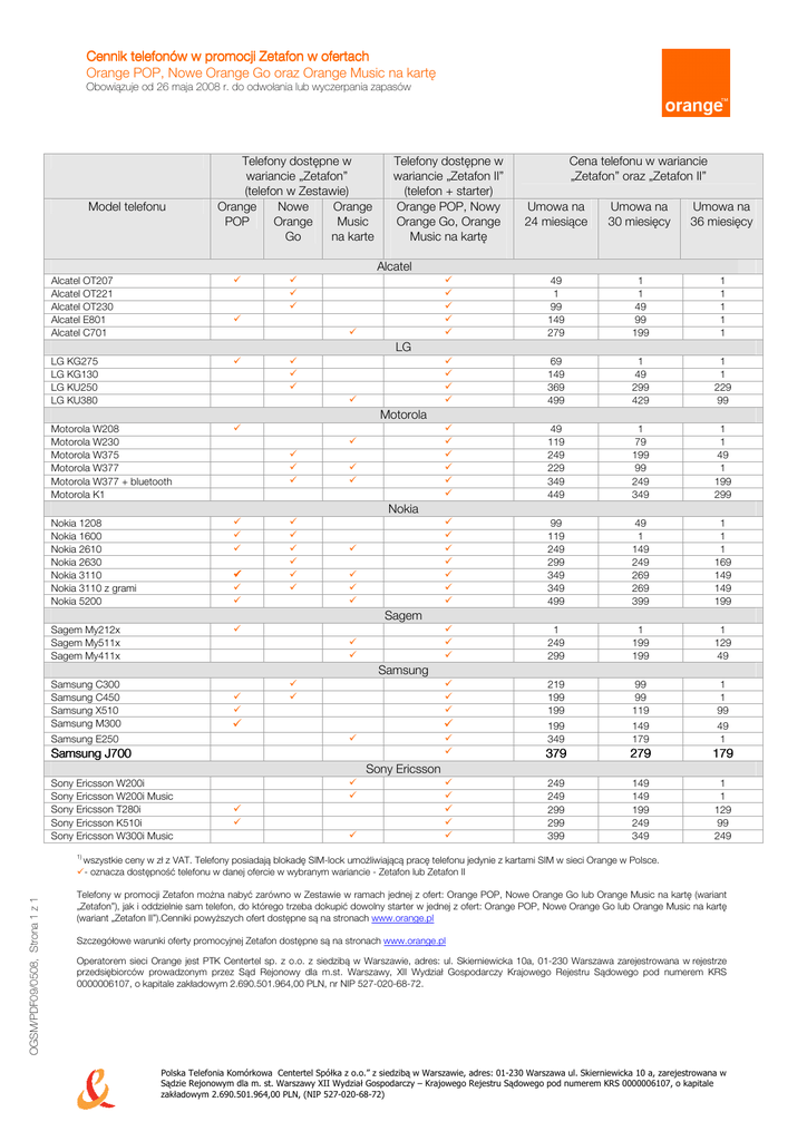 Cennik telefonów telefonów w promocji Zetafon w ofertach Orange POP, Nowe Orange Go oraz Orange Music na kartę Obowiązuje od 26 maja 2008 r. do odwołania lub wyczerpania zapasów Model telefonu Telefony dostępne w wariancie „Zetafon” (telefon w Zestawie) Orange Nowe Orange POP Orange Music Go na karte Alcatel OT207 Alcatel OT221 Alcatel OT230 Alcatel E801 Alcatel C701 LG KG275 LG KG130 LG KU250 LG KU380 Motorola W208 Motorola W230 Motorola W375 Motorola W377 Motorola W377 + bluetooth Motorola K1 Samsung C300 Samsung C450 Samsung X510 Samsung M300 Samsung E250 Nokia Sagem Sagem My212x Sagem My511x Sagem My411x LG Motorola Alcatel Nokia 1208 Nokia 1600 Nokia 2610 Nokia 2630 Nokia 3110 Nokia 3110 z grami Nokia 5200 Telefony dostępne w wariancie „Zetafon II” (telefon + starter) Orange POP, Nowy Orange Go, Orange Music na kartę Samsung Umowa na 30 miesięcy Umowa na 36 miesięcy 49 1 99 149 279 1 1 49 99 199 1 1 1 1 1 69 149 369 499 1 49 299 429 1 1 229 99 49 119 249 229 349 449 1 79 199 99 249 349 1 1 49 1 199 299 99 119 249 299 349 349 499 49 1 149 249 269 269 399 1 1 1 169 149 149 199 1 249 299 1 199 199 1 129 49 219 199 199 99 99 119 1 1 99 199 349 149 179 49 1 379 279 179 249 249 299 299 399 149 149 199 249 349 1 1 129 99 249 Samsung J700 Sony Ericsson W200i Sony Ericsson W200i Music Sony Ericsson T280i Sony Ericsson K510i Sony Ericsson W300i Music Umowa na 24 miesiące Sony Ericsson Cena telefonu w wariancie „Zetafon” oraz „Zetafon II” 1) OGSM/PDF09/0508, Strona 1 z 1 wszystkie ceny w zł z VAT. Telefony posiadają blokadę SIM-lock umożliwiającą pracę telefonu jedynie z kartami SIM w sieci Orange w Polsce. - oznacza dostępność telefonu w danej ofercie w wybranym wariancie - Zetafon lub Zetafon II Telefony w promocji Zetafon można nabyć zarówno w Zestawie w ramach jednej z ofert: Orange POP, Nowe Orange Go lub Orange Music na kartę (wariant „Zetafon”), jak i oddzielnie sam telefon, do którego trzeba dokupić dowolny starter w jednej z ofert: Orange POP, Nowe Orange Go lub Orange Music na kartę (wariant „Zetafon II”).Cenniki powyższych ofert dostępne są na stronach www.orange.pl Szczegółowe warunki oferty promocyjnej Zetafon dostępne są na stronach www.orange.pl Operatorem sieci Orange jest PTK Centertel sp. z o.o. z siedzibą w Warszawie, adres: ul. Skierniewicka 10a, 01-230 Warszawa zarejestrowana w rejestrze przedsiębiorców prowadzonym przez Sąd Rejonowy dla m.st. Warszawy, XII Wydział Gospodarczy Krajowego Rejestru Sądowego pod numerem KRS 0000006107, o kapitale zakładowym 2.690.501.964,00 PLN, nr NIP 527-020-68-72. Polska Telefonia Komórkowa Centertel Spółka z o.o.” z siedzibą w Warszawie, adres: 01-230 Warszawa ul. Skierniewicka 10 a, zarejestrowana w Sądzie Rejonowym dla m. st. Warszawy XII Wydział Gospodarczy – Krajowego Rejestru Sądowego pod numerem KRS 0000006107, o kapitale zakładowym 2.690.501.964,00 PLN, (NIP 527-020-68-72)
